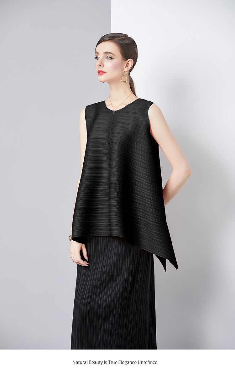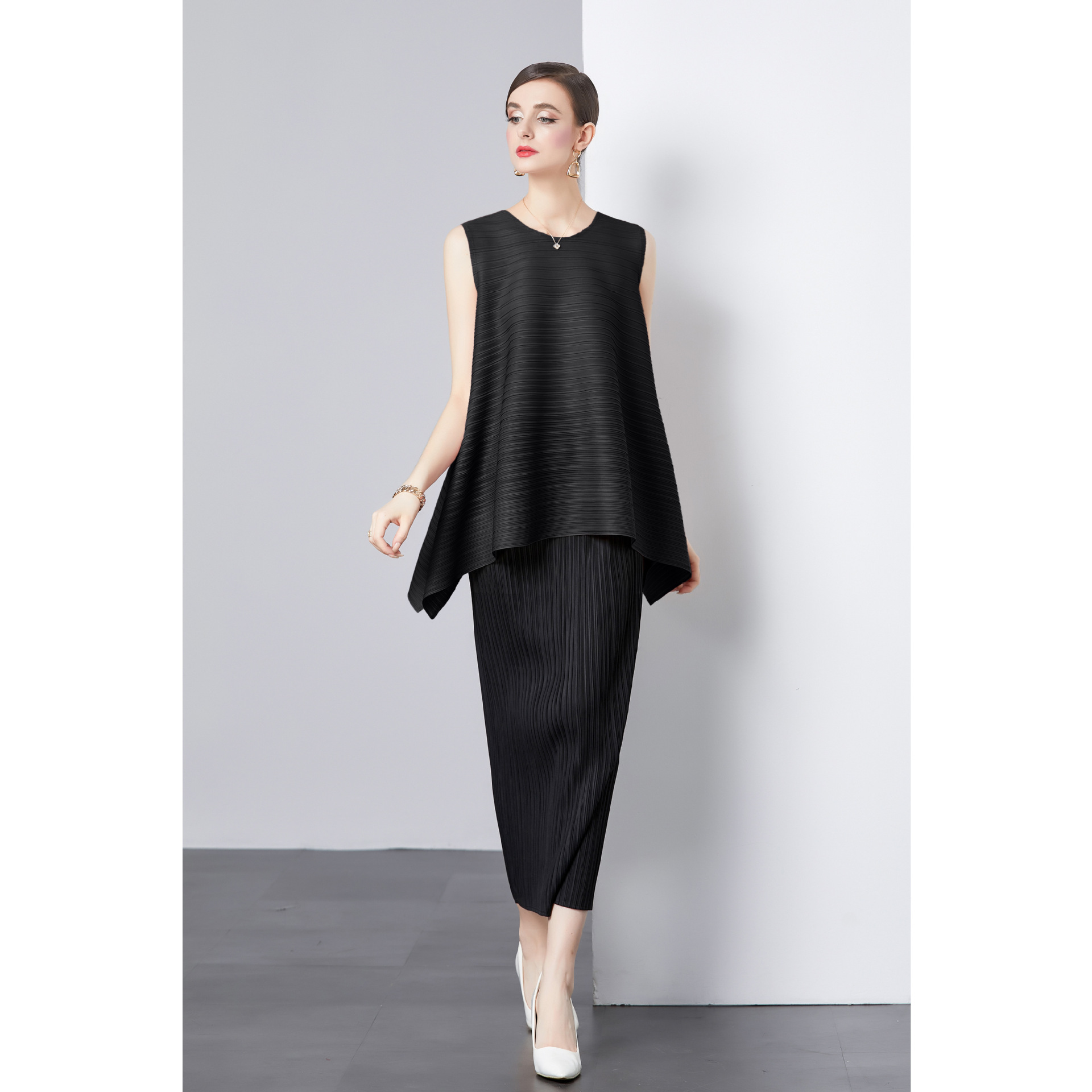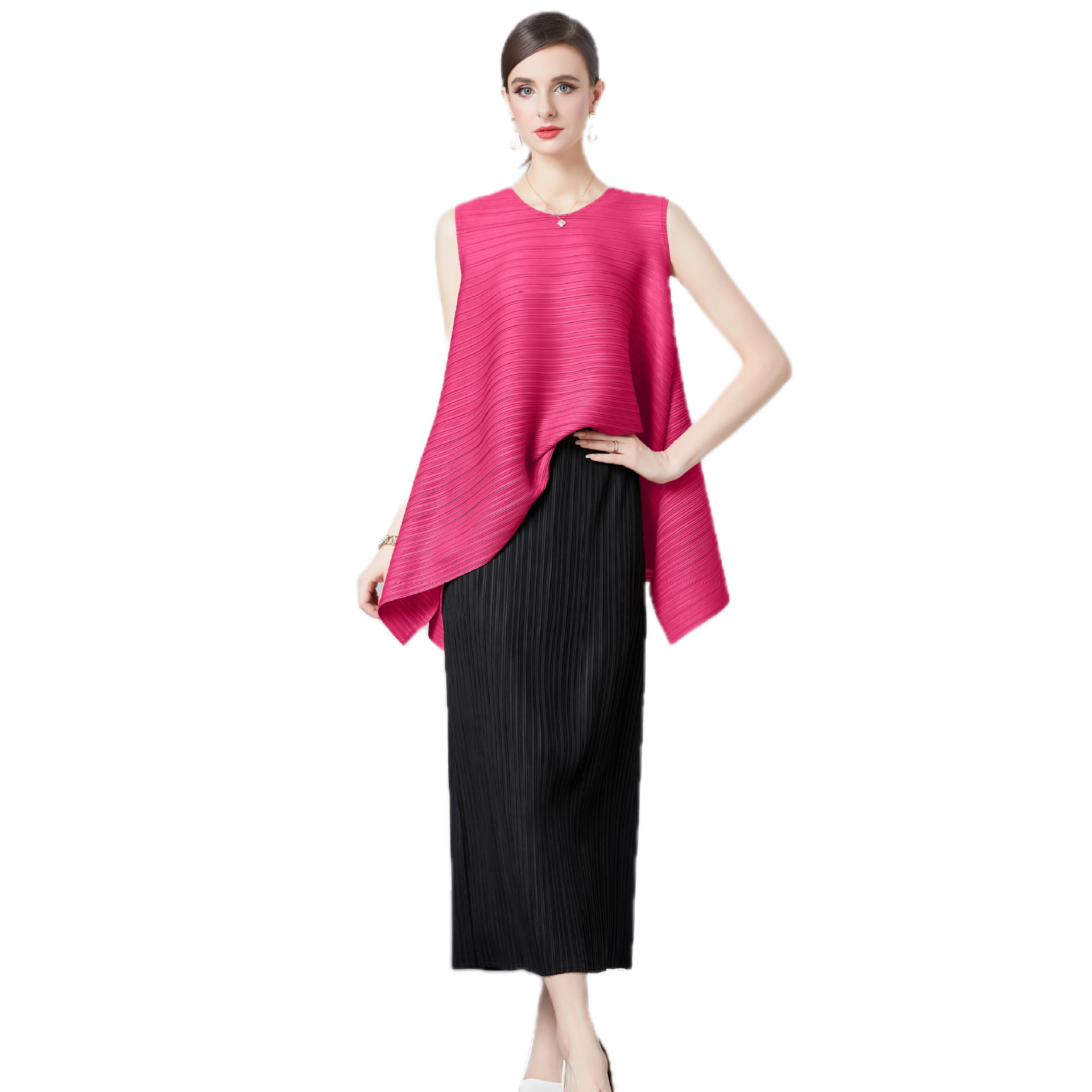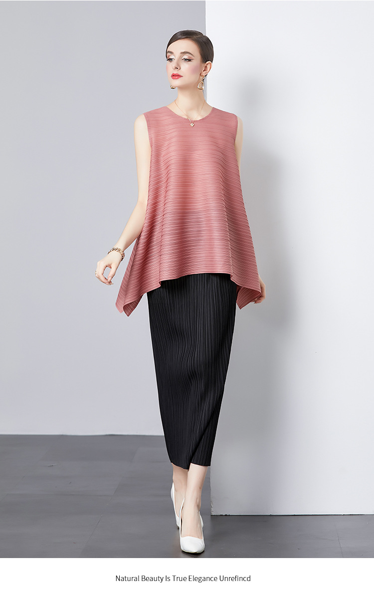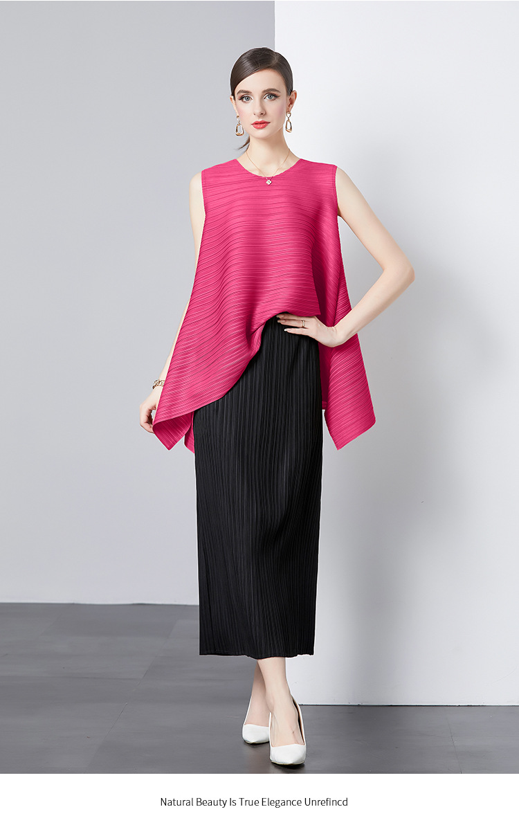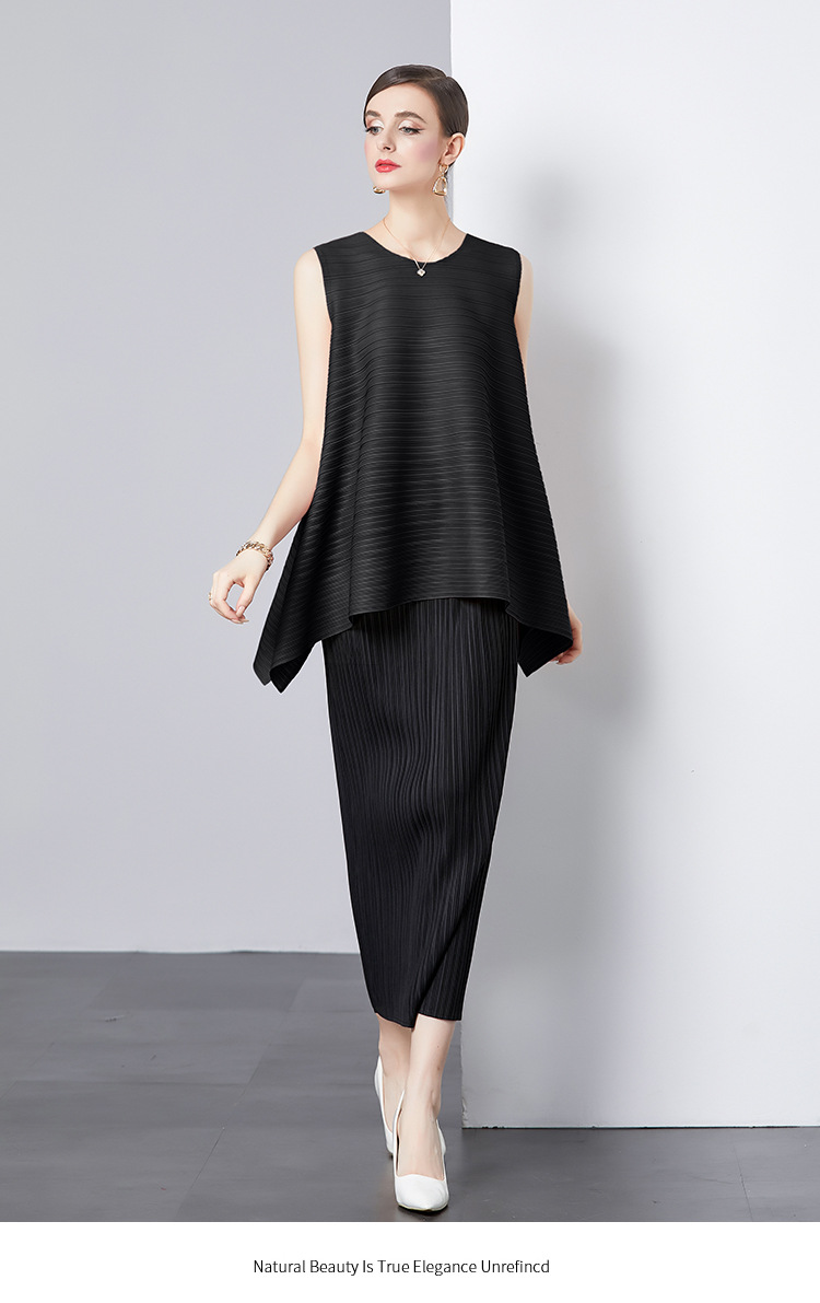 Bộ trang phục hai mảnh này gồm áo và chân váy, phù hợp cho những ngày hè. Áo không tay, kiểu dáng chữ A nhẹ nhàng giúp tôn dáng. Chất vải áo có đường xếp ly tinh tế. Chân váy ôm vừa vặn, phối cùng áo tạo vẻ thanh thoát. Có thể mặc bộ này đi làm hoặc dạo phố. Phối cùng giày sandal hoặc giày đế bằng để hoàn thiện bộ trang phục. | Tên sản phẩm: Đồ Bộ Nữ Dáng Chữ A Cả Bộ 2 Món Hàng Mùa Hè - Thời Trang Nữ | Mã sản phẩm: B4769 - Giá: 1.080.000đ | Mã nhà sản xuất: GUDG-G03Hình ảnh sản phẩm