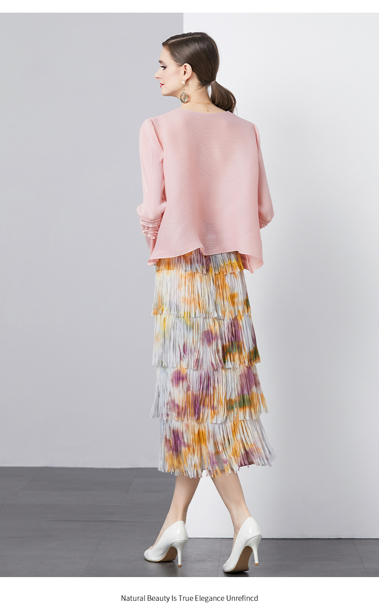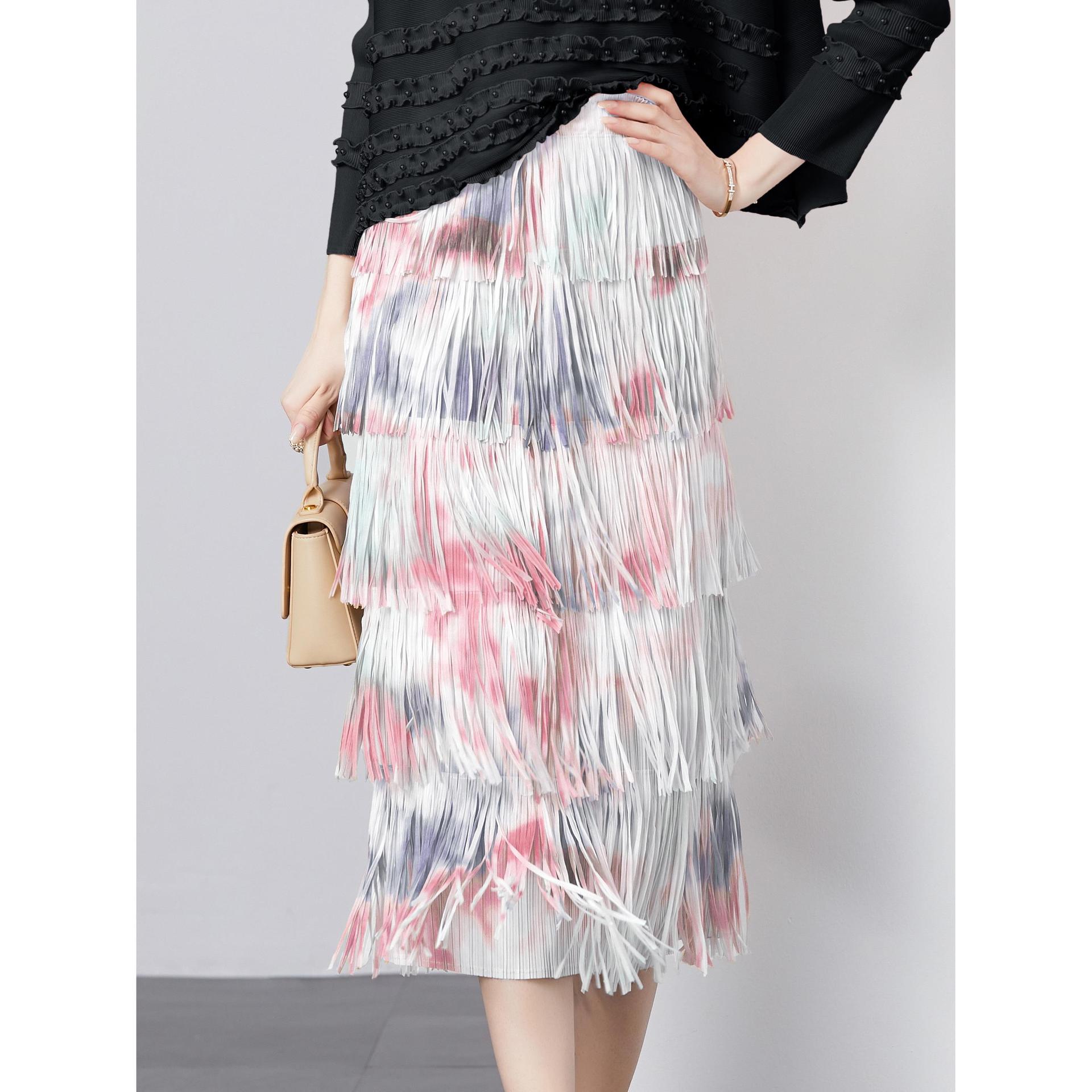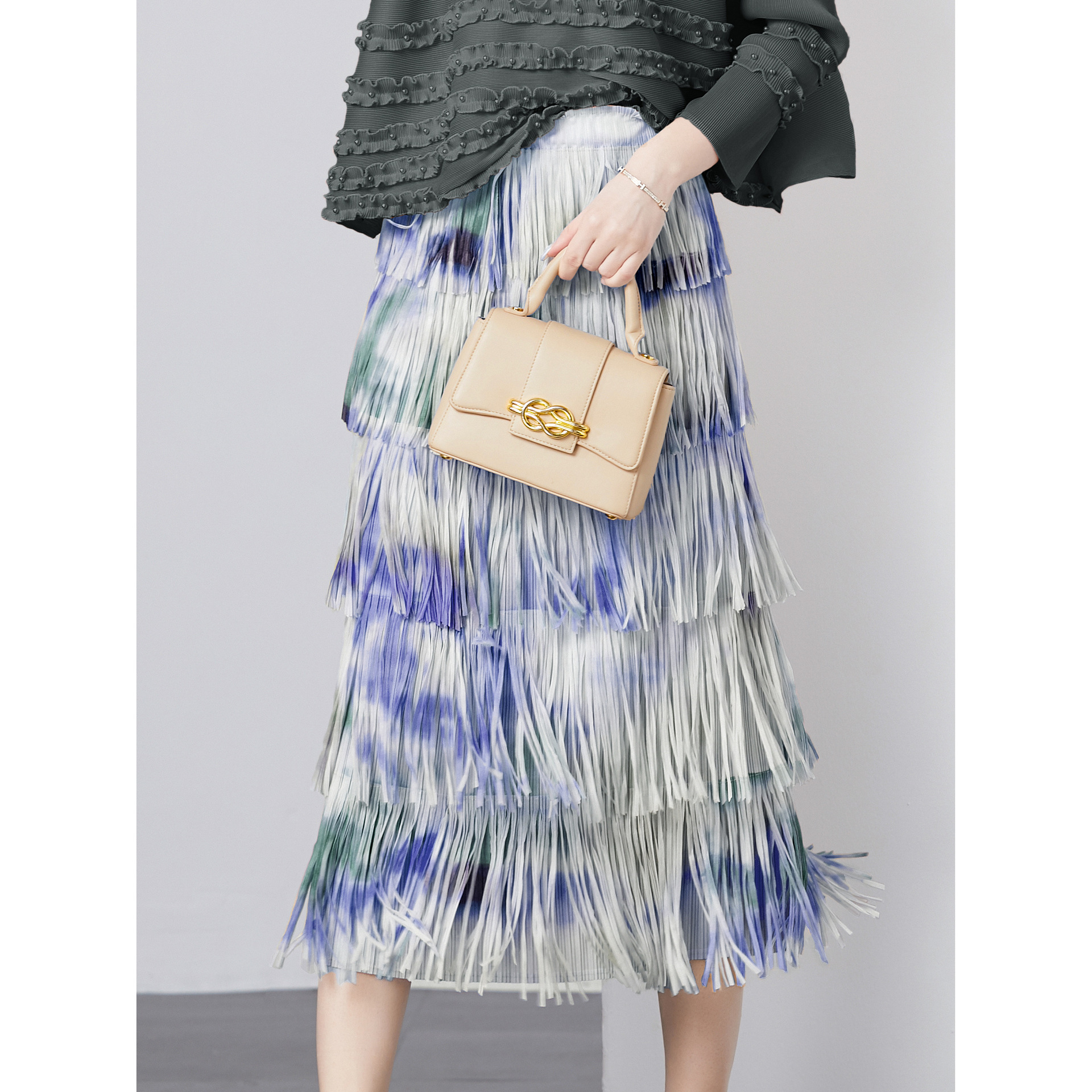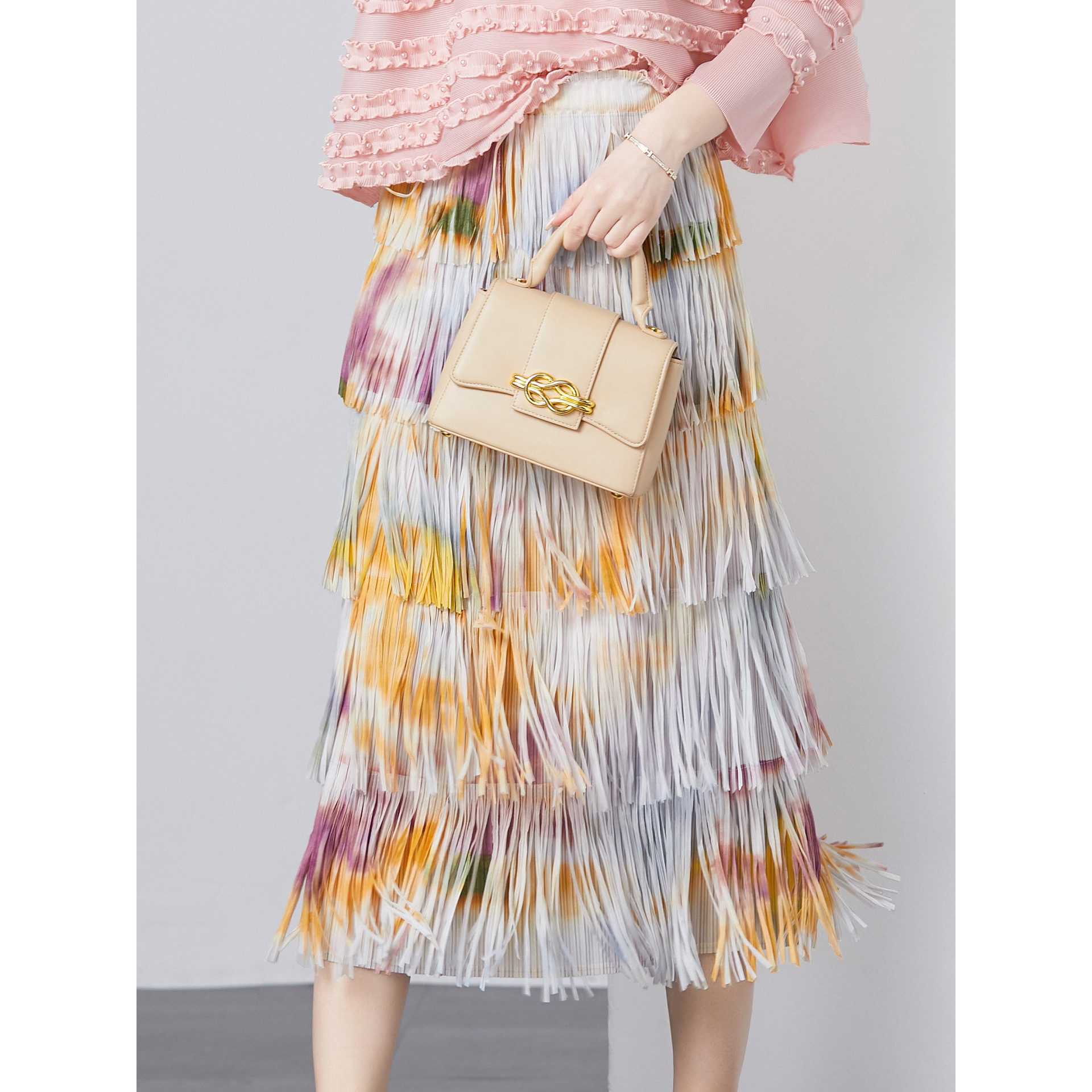 Chiếc váy dáng dài qua gối mang phong cách cổ điển với họa tiết nhuộm buộc độc đáo. Chất vải mềm mại tạo thành những đường xếp ly nhẹ nhàng, kết hợp điểm nhấn là những dải rủ duyên dáng ở viền. Thiết kế eo cao giúp tôn dáng, dễ dàng phối cùng nhiều loại áo khác nhau. Sản phẩm phù hợp cho những ngày hè, mang đến vẻ tươi tắn và nữ tính. Có thể giặt bằng tay và phơi trong bóng mát để giữ form vải. | Tên sản phẩm: Chân Váy Đầm Nữ Trông Trẻ Hơn Tuổi Hàng Mùa Hè Phong Cách Hàn Quốc - Thời Trang Nữ | Mã sản phẩm: B4778 - Giá: 1.070.000đ | Mã nhà sản xuất: GUDG-G03Hình ảnh sản phẩm