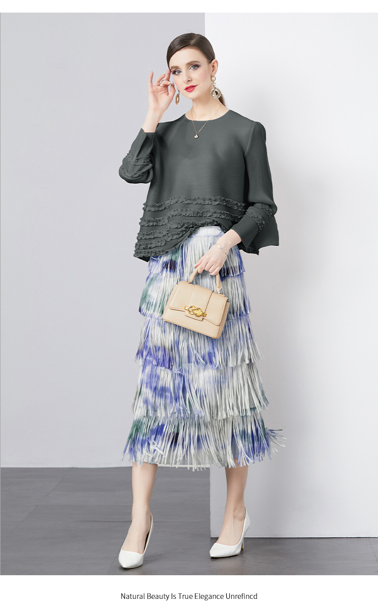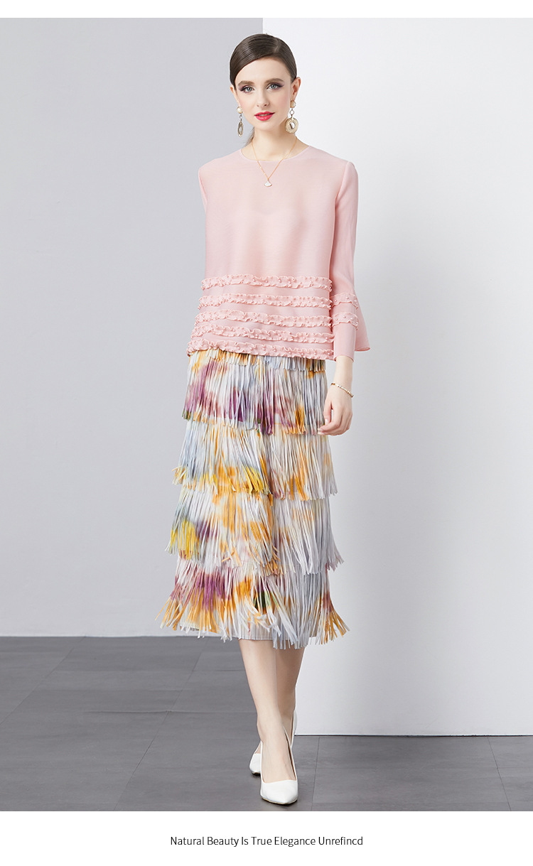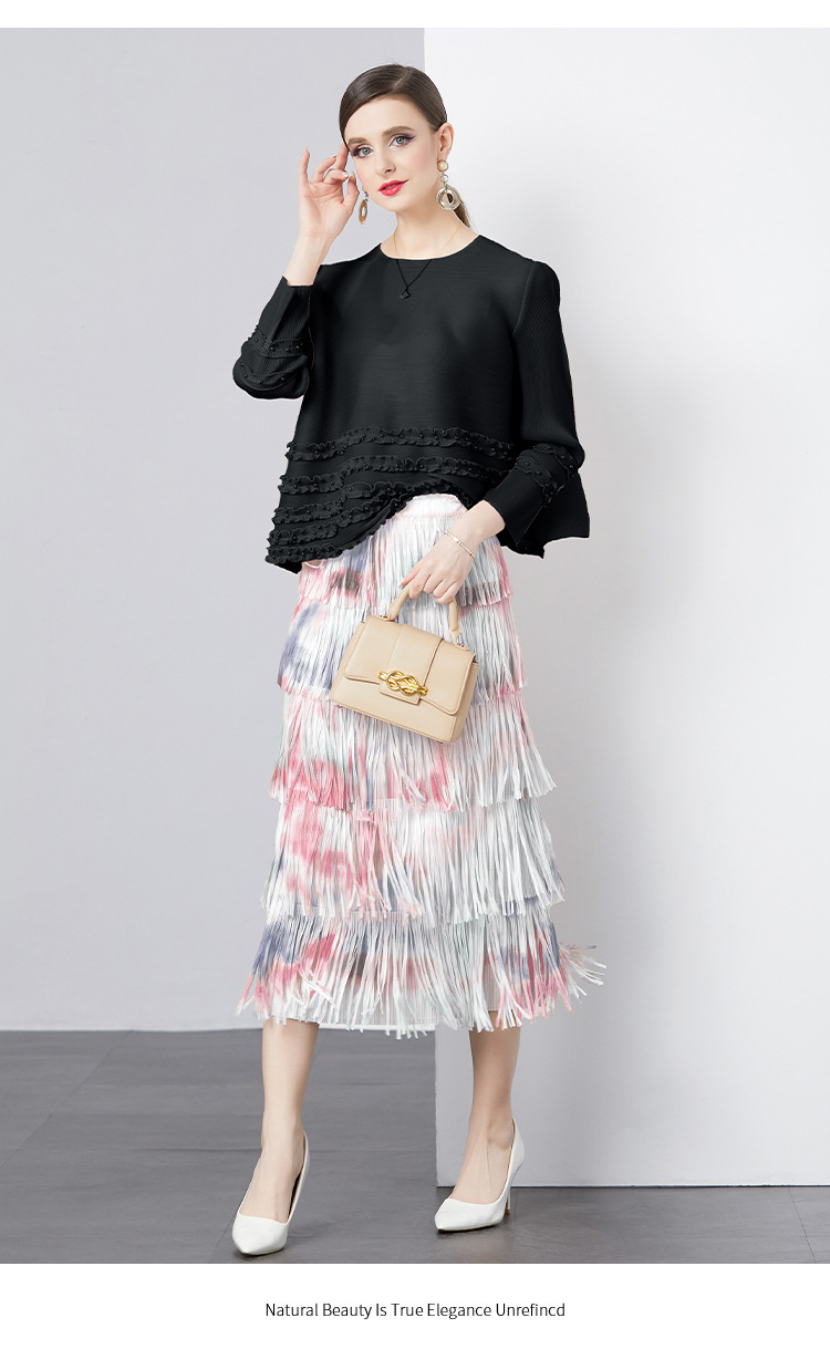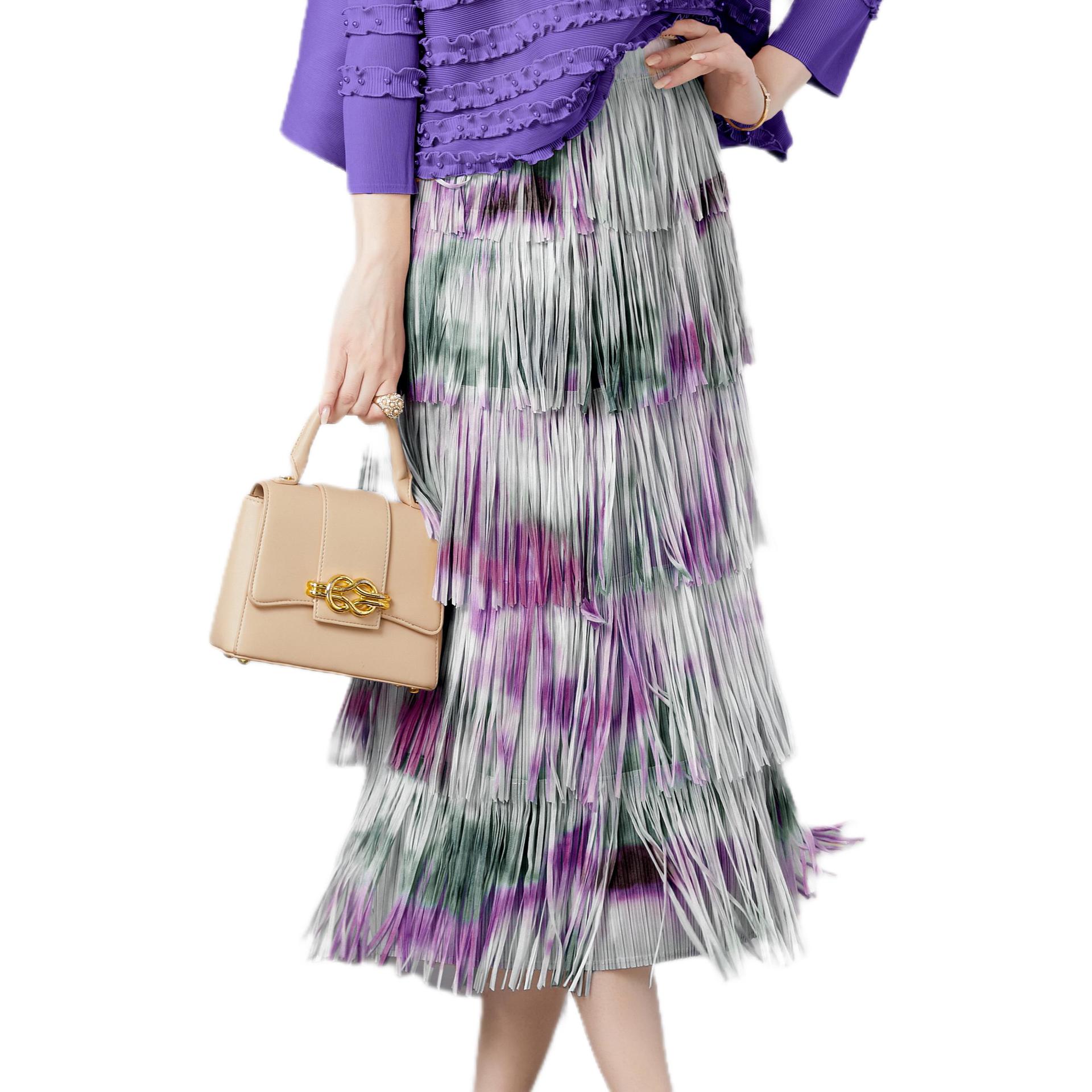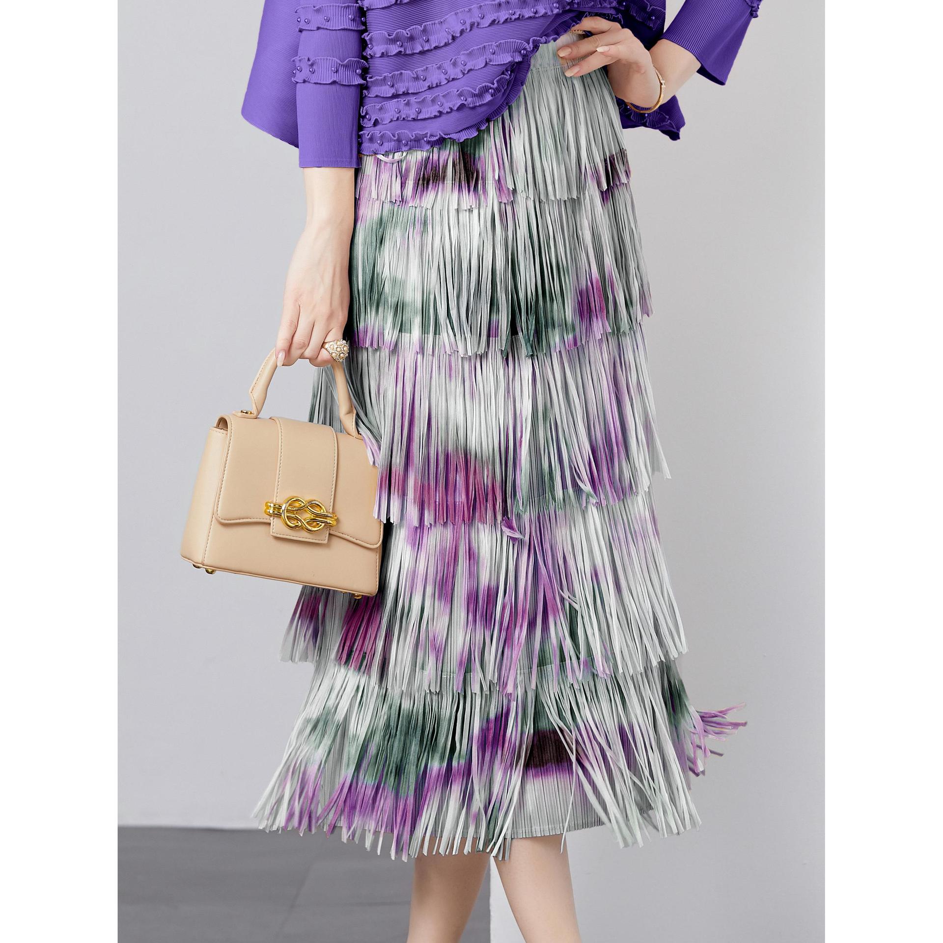 Chiếc váy dáng dài qua gối mang phong cách cổ điển với họa tiết nhuộm buộc độc đáo. Chất vải mềm mại tạo thành những đường xếp ly nhẹ nhàng, kết hợp điểm nhấn là những dải rủ duyên dáng ở viền. Thiết kế eo cao giúp tôn dáng, dễ dàng phối cùng nhiều loại áo khác nhau. Sản phẩm phù hợp cho những ngày hè, mang đến vẻ tươi tắn và nữ tính. Có thể giặt bằng tay và phơi trong bóng mát để giữ form vải. | Tên sản phẩm: Chân Váy Đầm Nữ Trông Trẻ Hơn Tuổi Hàng Mùa Hè Phong Cách Hàn Quốc - Thời Trang Nữ | Mã sản phẩm: B4778 - Giá: 1.070.000đ | Mã nhà sản xuất: GUDG-G03Hình ảnh sản phẩm