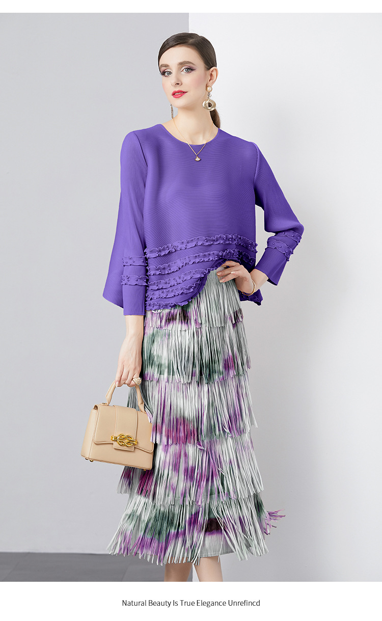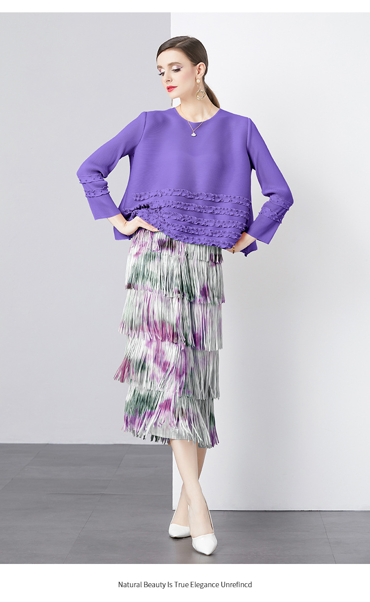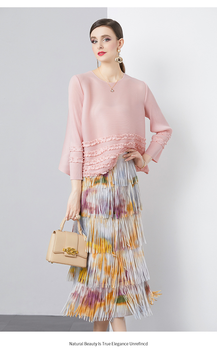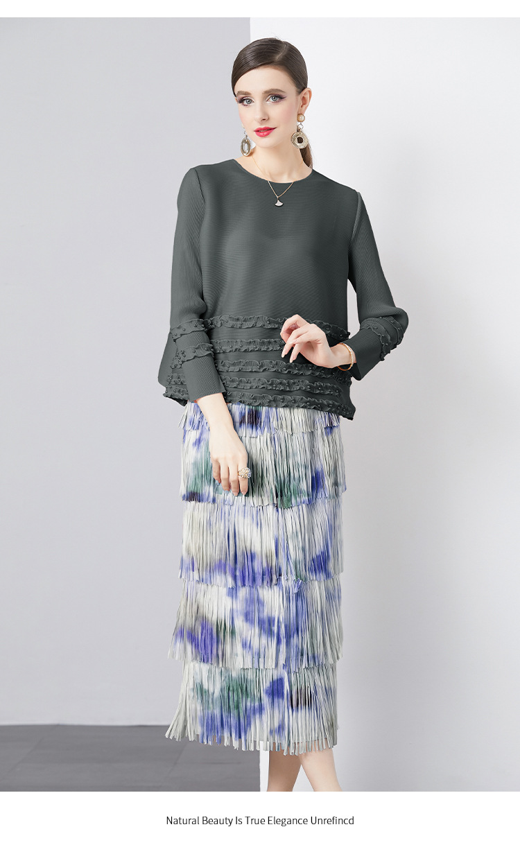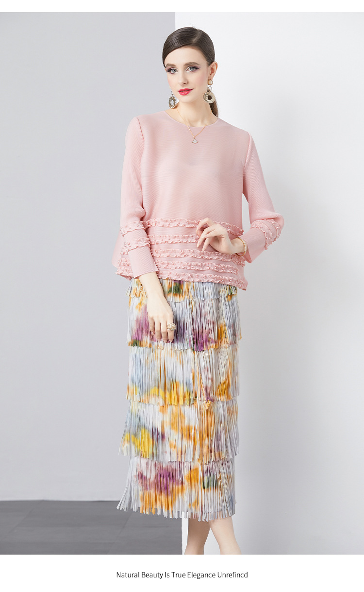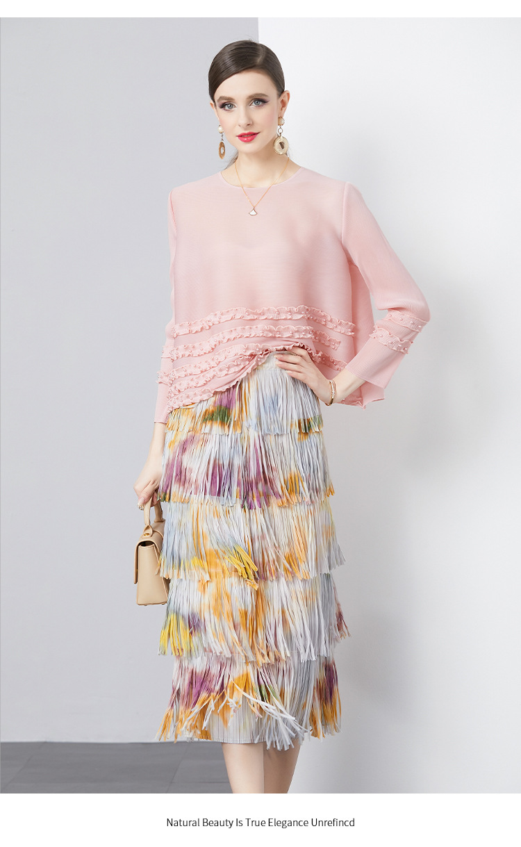 Chiếc váy dáng dài qua gối mang phong cách cổ điển với họa tiết nhuộm buộc độc đáo. Chất vải mềm mại tạo thành những đường xếp ly nhẹ nhàng, kết hợp điểm nhấn là những dải rủ duyên dáng ở viền. Thiết kế eo cao giúp tôn dáng, dễ dàng phối cùng nhiều loại áo khác nhau. Sản phẩm phù hợp cho những ngày hè, mang đến vẻ tươi tắn và nữ tính. Có thể giặt bằng tay và phơi trong bóng mát để giữ form vải. | Tên sản phẩm: Chân Váy Đầm Nữ Trông Trẻ Hơn Tuổi Hàng Mùa Hè Phong Cách Hàn Quốc - Thời Trang Nữ | Mã sản phẩm: B4778 - Giá: 1.070.000đ | Mã nhà sản xuất: GUDG-G03Hình ảnh sản phẩm