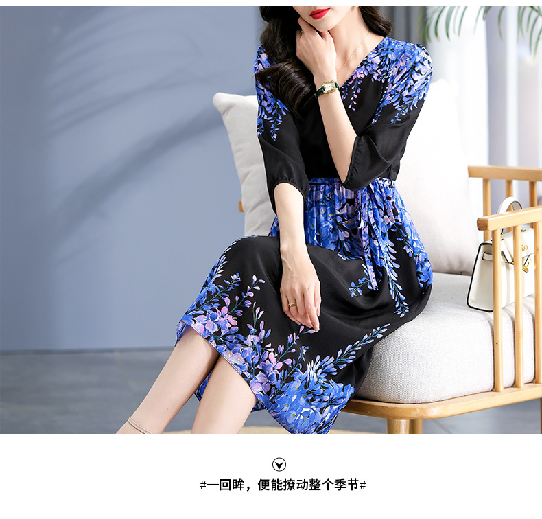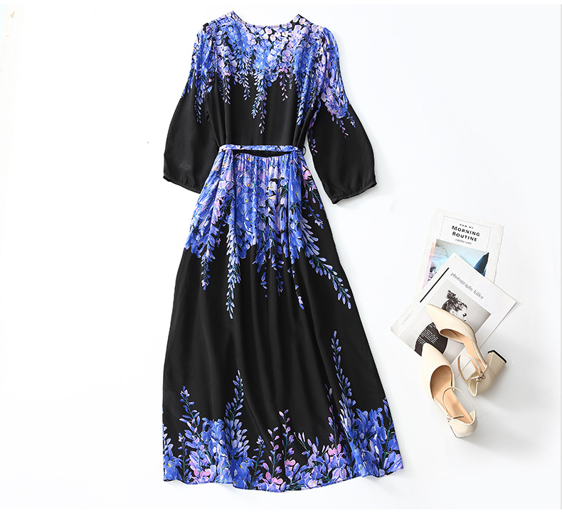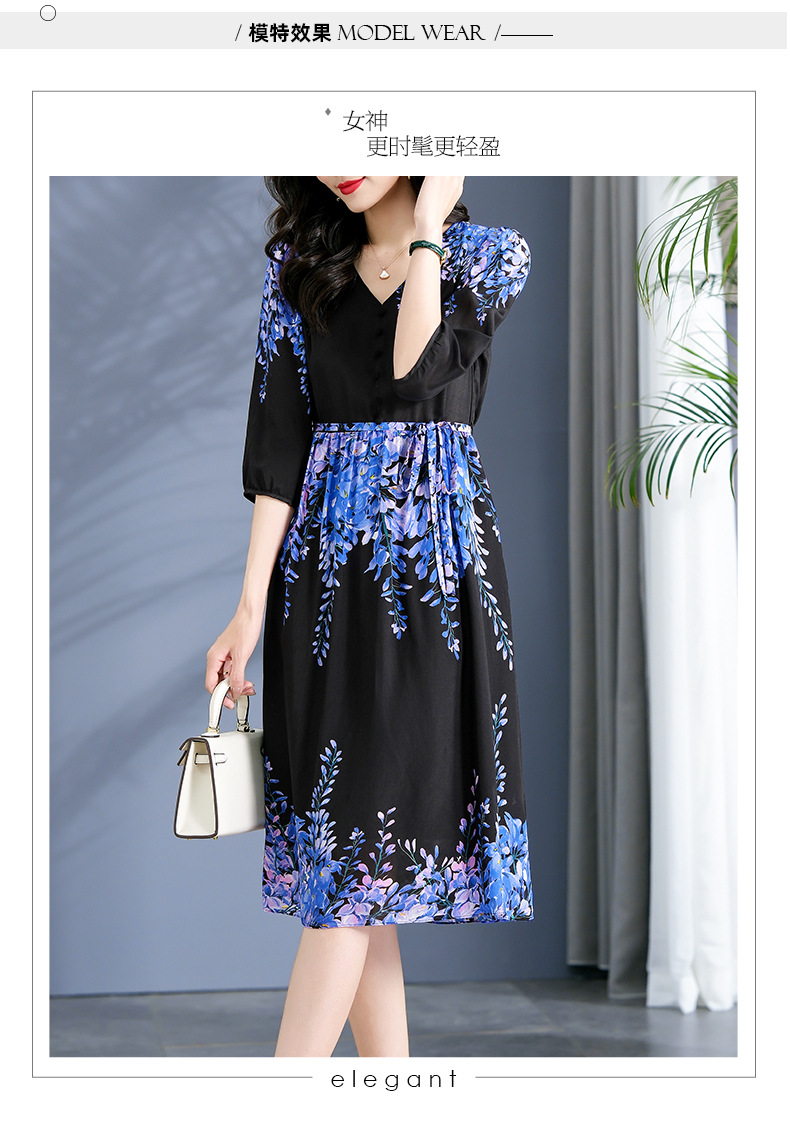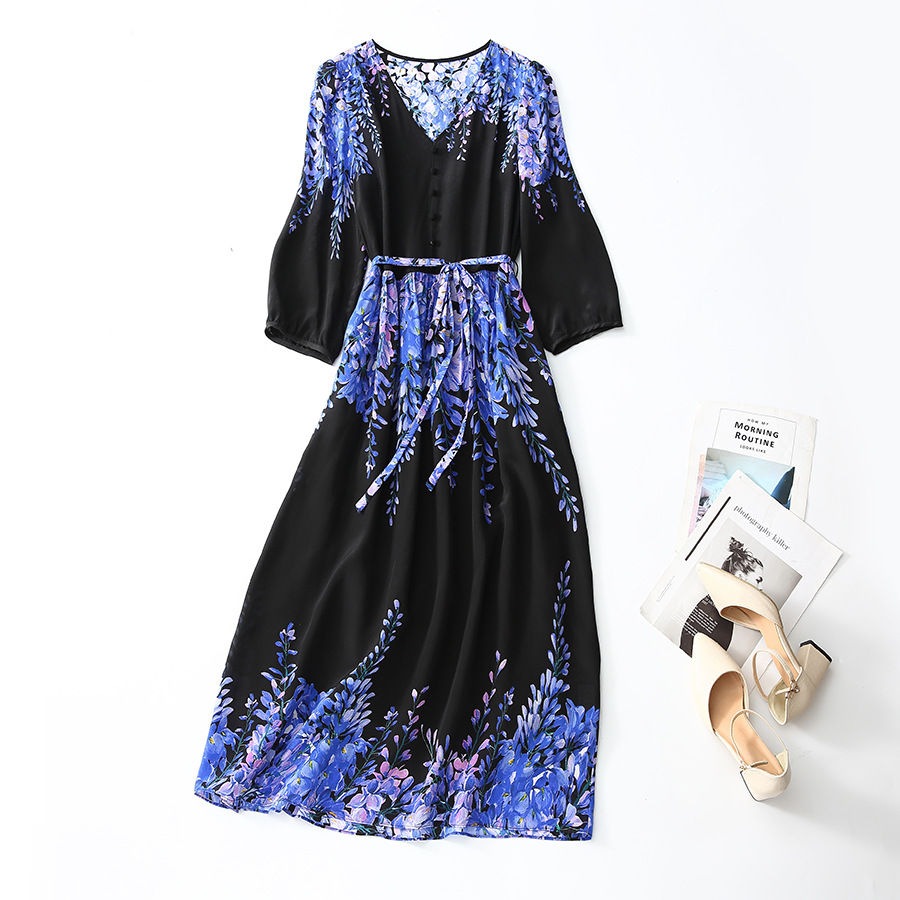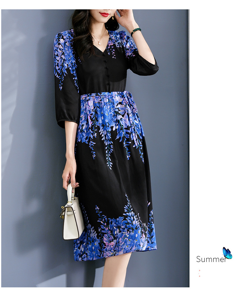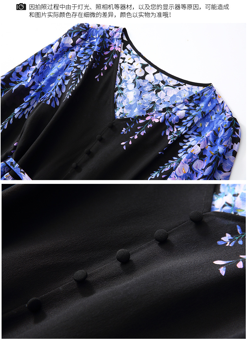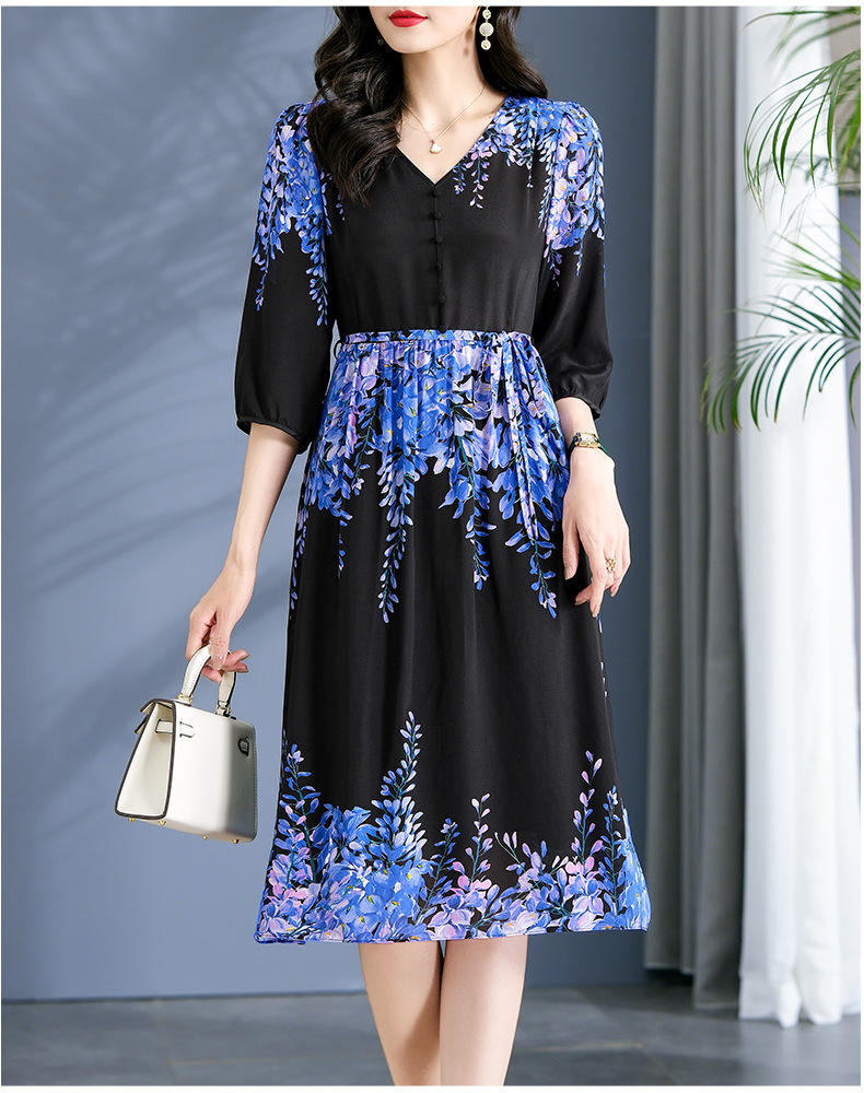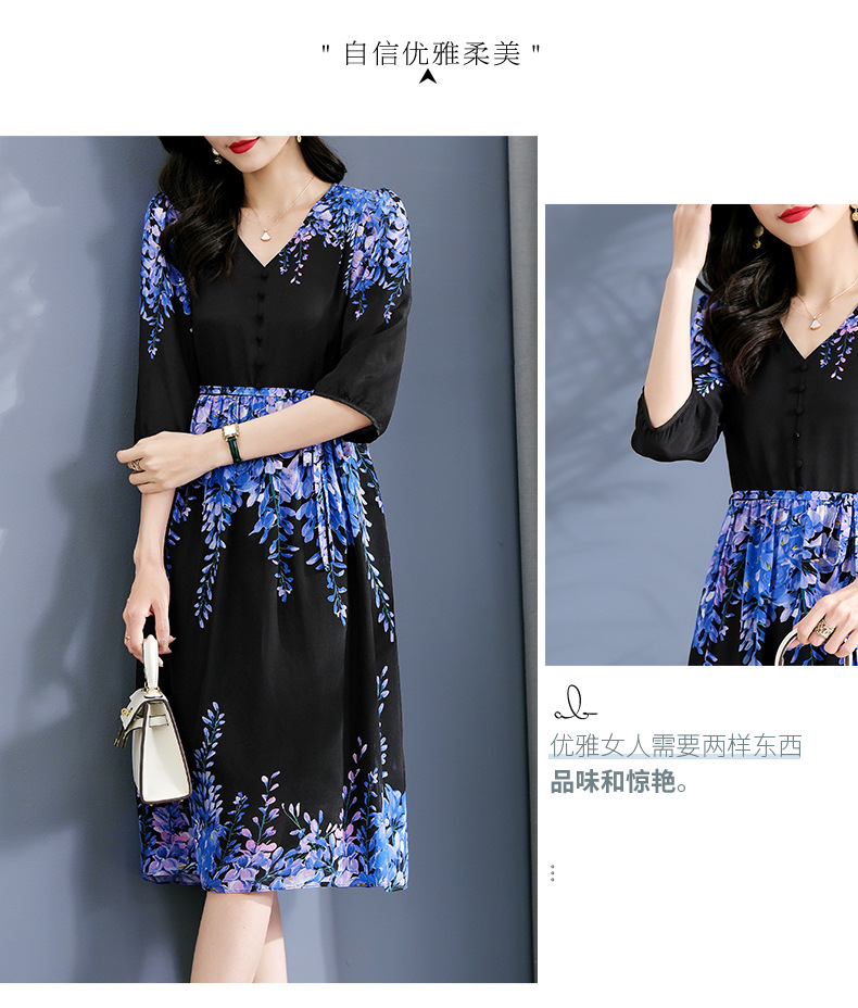 Chiếc váy dáng dài qua gối này được làm từ chất liệu lụa mềm mại, mang đến cảm giác dễ chịu khi mặc. Thiết kế có cổ chữ V và hàng cúc đơn phía trước, tạo điểm nhấn thanh lịch. Trên nền vải in họa tiết hoa tử đằng mềm mại, giúp chiếc váy thêm phần nữ tính. Sản phẩm phù hợp để mặc đi làm hoặc dự những buổi gặp mặt thường ngày. Có thể giặt tay nhẹ nhàng và phơi ở nơi râm mát để giữ chất vải được bền lâu. | Tên sản phẩm: Váy Đầm Liền Thân Nữ Chất Liệu Lụa Tơ Tằm Họa Tiết Hoa Cổ Chữ V - Thời Trang Nữ | Mã sản phẩm: B5007 - Giá: 2.910.000đ | Mã nhà sản xuất: SHDA-G06Hình ảnh sản phẩm