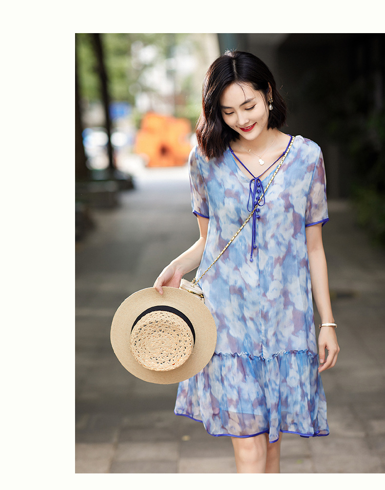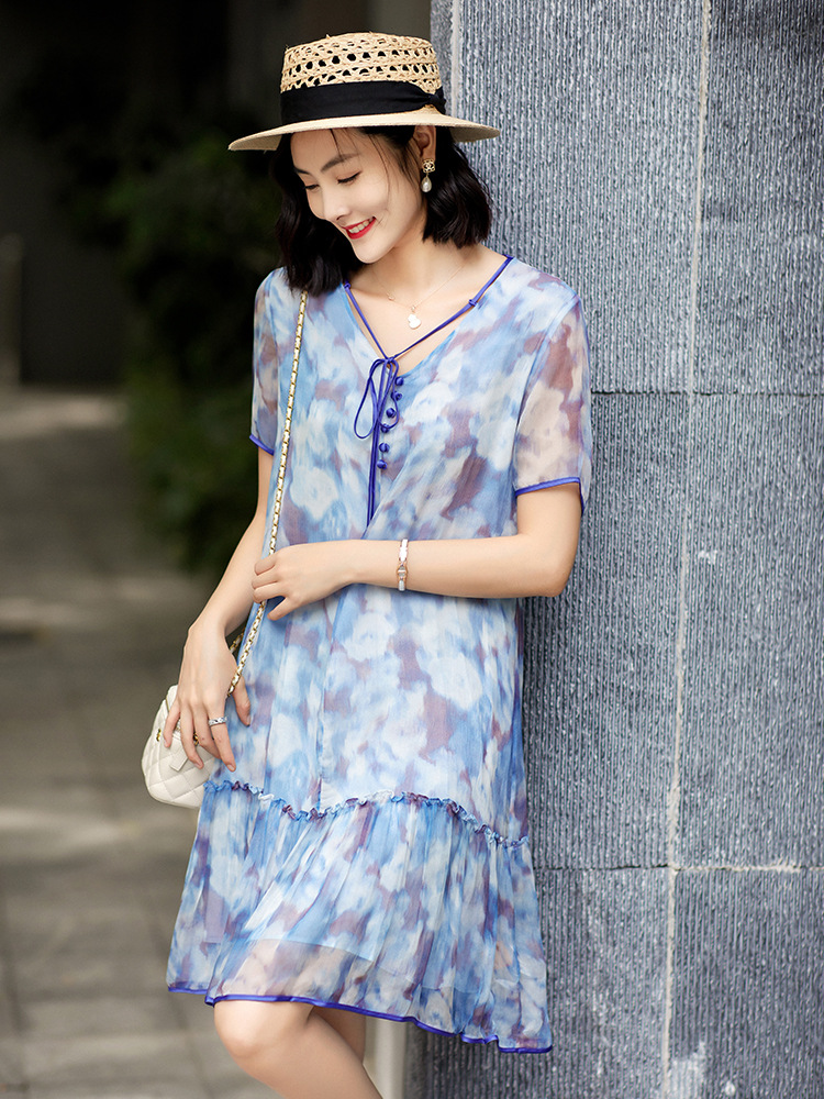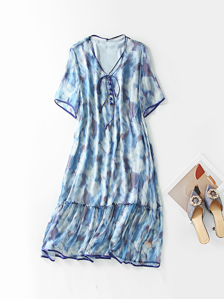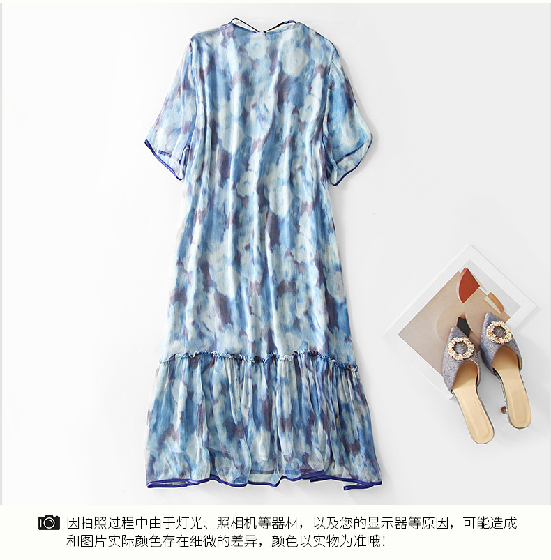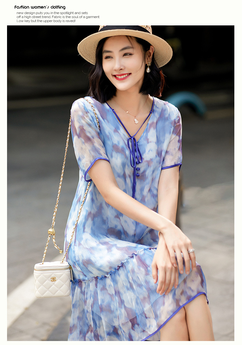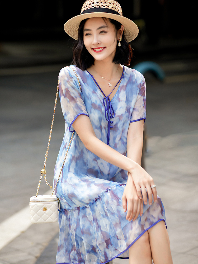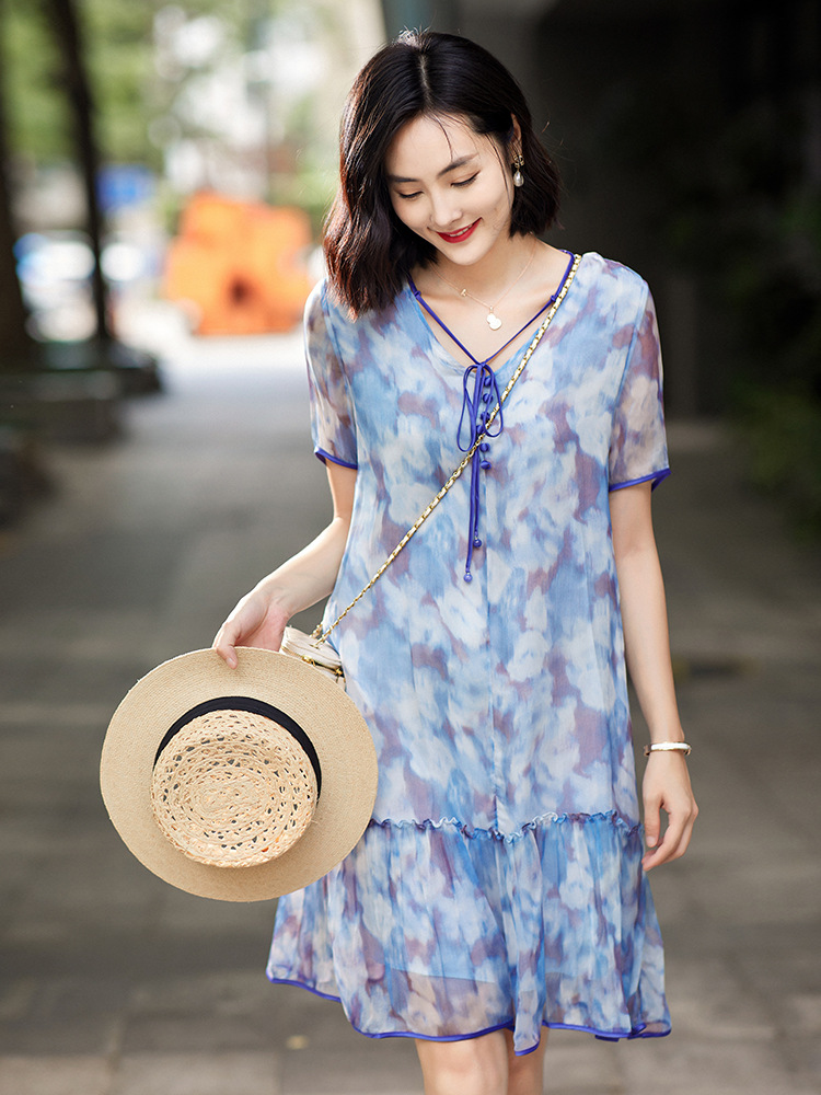 Chiếc đầm được dệt từ sợi tơ tự nhiên, mang đến cảm giác mềm mại và thoáng mát khi mặc. Điểm nổi bật là họa tiết in loang màu như những đám mây, tạo nên vẻ đẹp nghệ thuật và mới lạ. Kiểu dáng đầm suông nhẹ nhàng, phù hợp cho nhiều dịp sinh hoạt hằng ngày. Có thể giặt bằng tay với nước lạnh và phơi ở nơi râm mát để giữ chất vải được bền lâu. | Tên sản phẩm: Váy Đầm Liền Thân Nữ Chất Liệu Lụa Tơ Tằm Họa Tiết Hoa - Thời Trang Nữ | Mã sản phẩm: B5010 - Giá: 2.690.000đ | Mã nhà sản xuất: SHDA-G06Hình ảnh sản phẩm