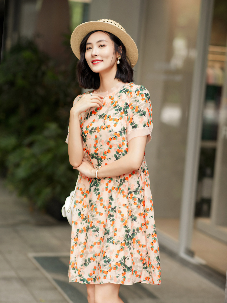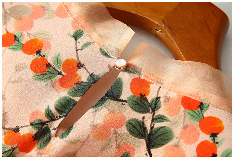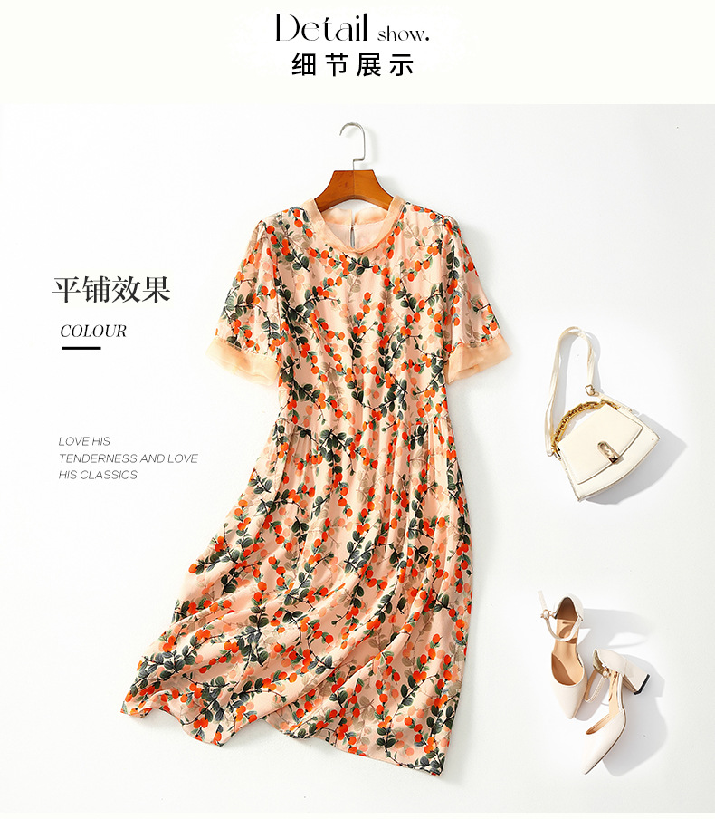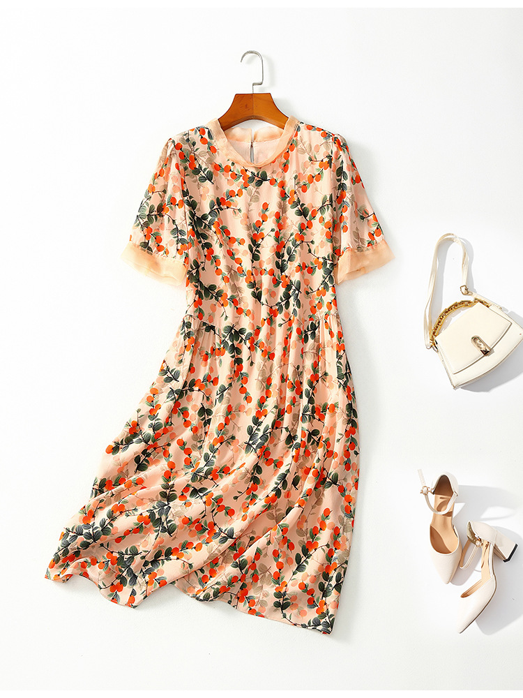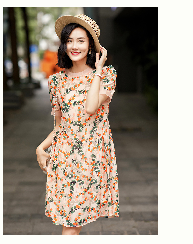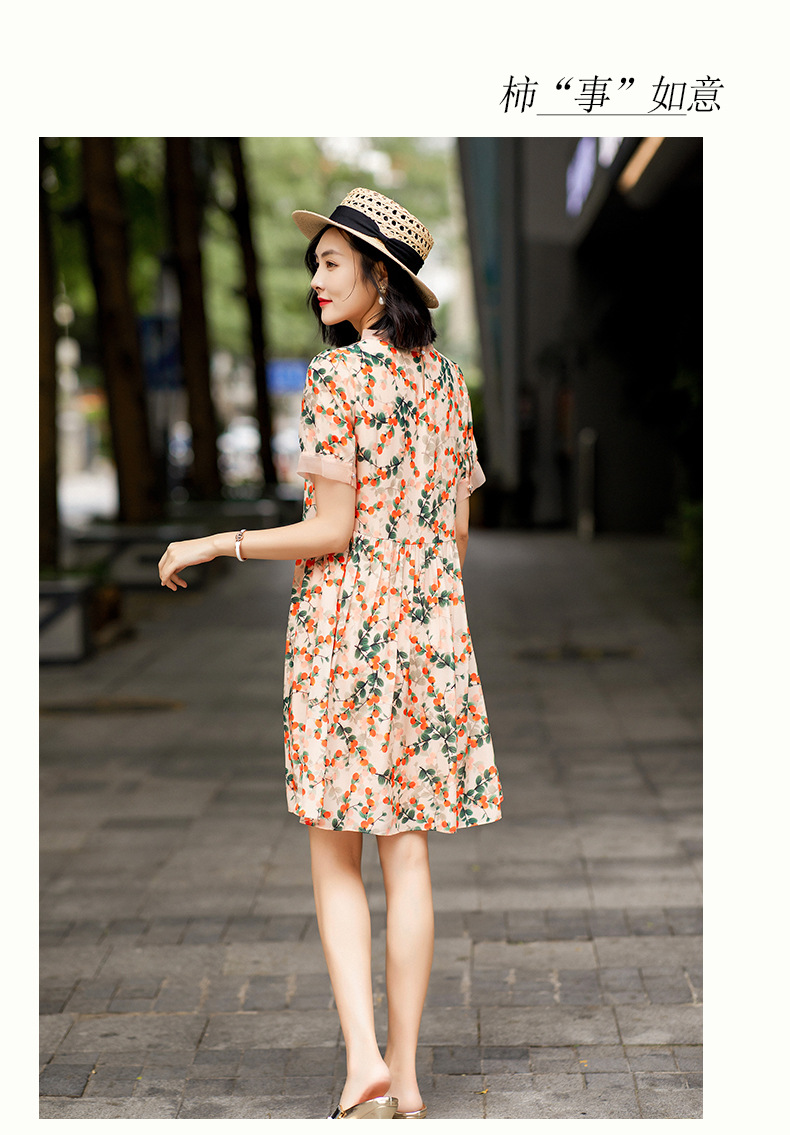 Chiếc váy này có phần cổ tròn đơn giản, điểm nhấn là họa tiết hình quả hồng in nổi bật. Chất liệu tơ tằm tự nhiên mang lại cảm giác mềm mại, mát mẻ và thoáng khí khi mặc. Kiểu dáng ôn hòa, phù hợp cho nhiều dịp sinh hoạt hằng ngày. Bạn có thể mặc đi làm, dạo phố hay dự các cuộc gặp mặt thân mật. Giặt tay với nước lạnh và phơi trong bóng râm sẽ giúp sản phẩm bền đẹp theo thời gian. | Tên sản phẩm: Váy Đầm Liền Thân Nữ Chất Liệu Lụa Tơ Tằm Họa Tiết Hoa - Thời Trang Nữ | Mã sản phẩm: B5017 - Giá: 2.550.000đ | Mã nhà sản xuất: SHDA-G06Hình ảnh sản phẩm
