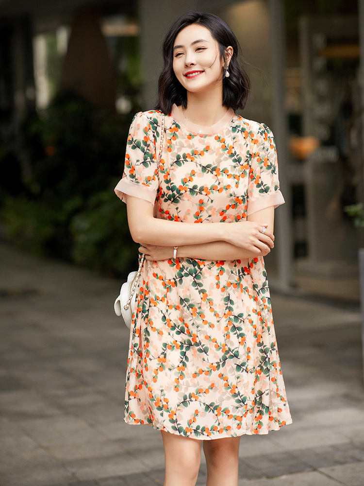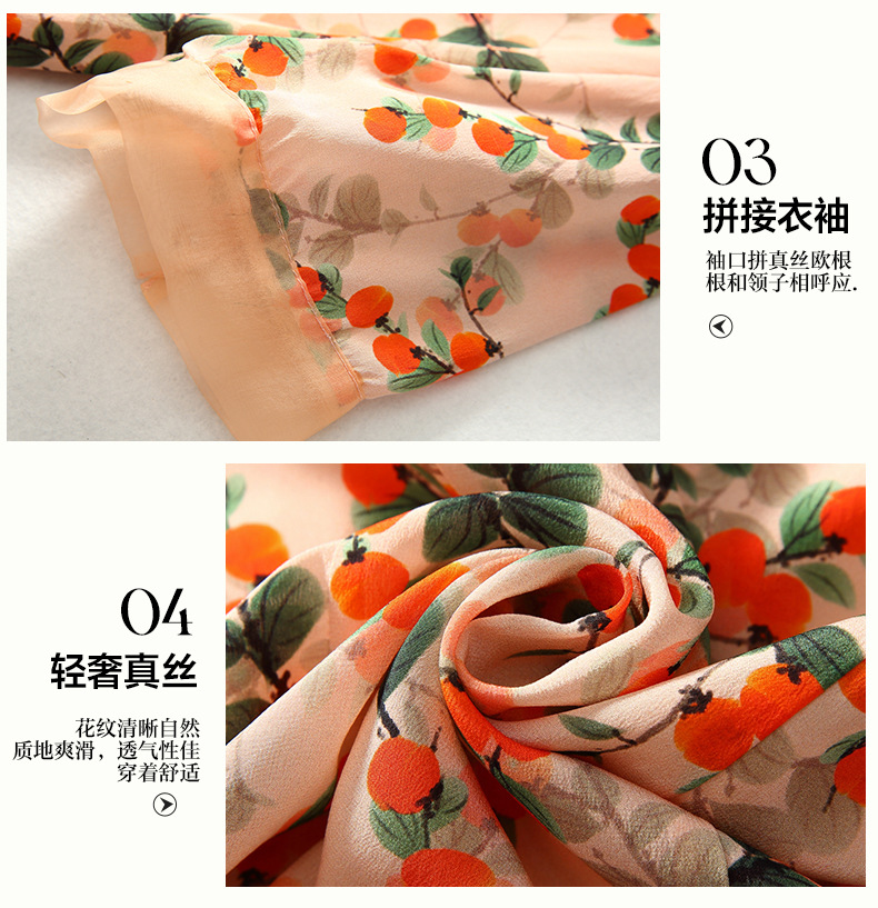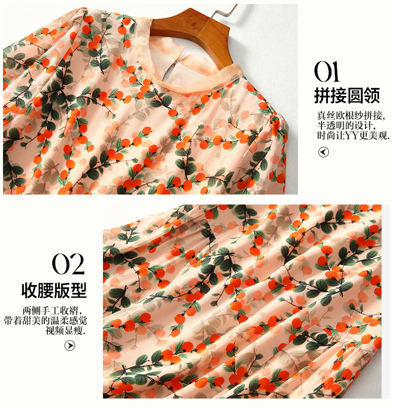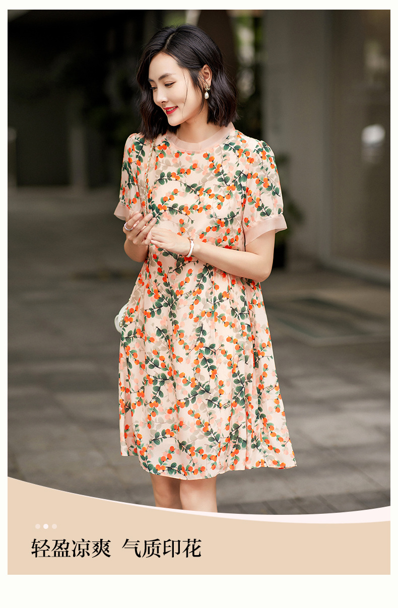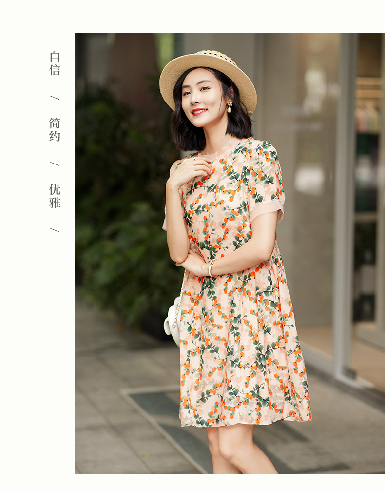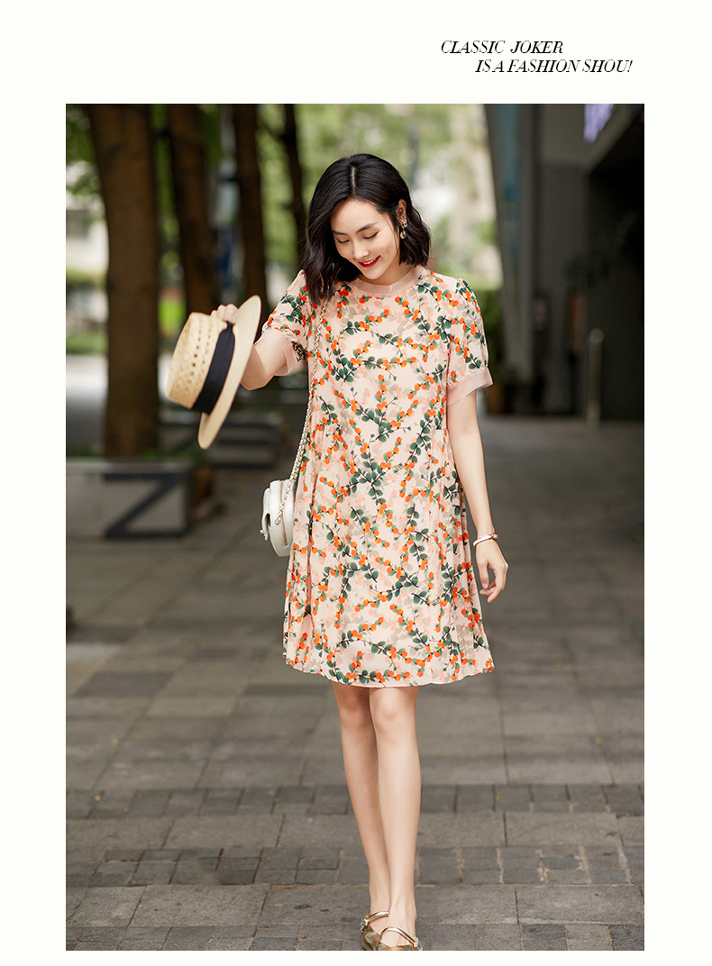 Chiếc váy này có phần cổ tròn đơn giản, điểm nhấn là họa tiết hình quả hồng in nổi bật. Chất liệu tơ tằm tự nhiên mang lại cảm giác mềm mại, mát mẻ và thoáng khí khi mặc. Kiểu dáng ôn hòa, phù hợp cho nhiều dịp sinh hoạt hằng ngày. Bạn có thể mặc đi làm, dạo phố hay dự các cuộc gặp mặt thân mật. Giặt tay với nước lạnh và phơi trong bóng râm sẽ giúp sản phẩm bền đẹp theo thời gian. | Tên sản phẩm: Váy Đầm Liền Thân Nữ Chất Liệu Lụa Tơ Tằm Họa Tiết Hoa - Thời Trang Nữ | Mã sản phẩm: B5017 - Giá: 2.550.000đ | Mã nhà sản xuất: SHDA-G06Hình ảnh sản phẩm