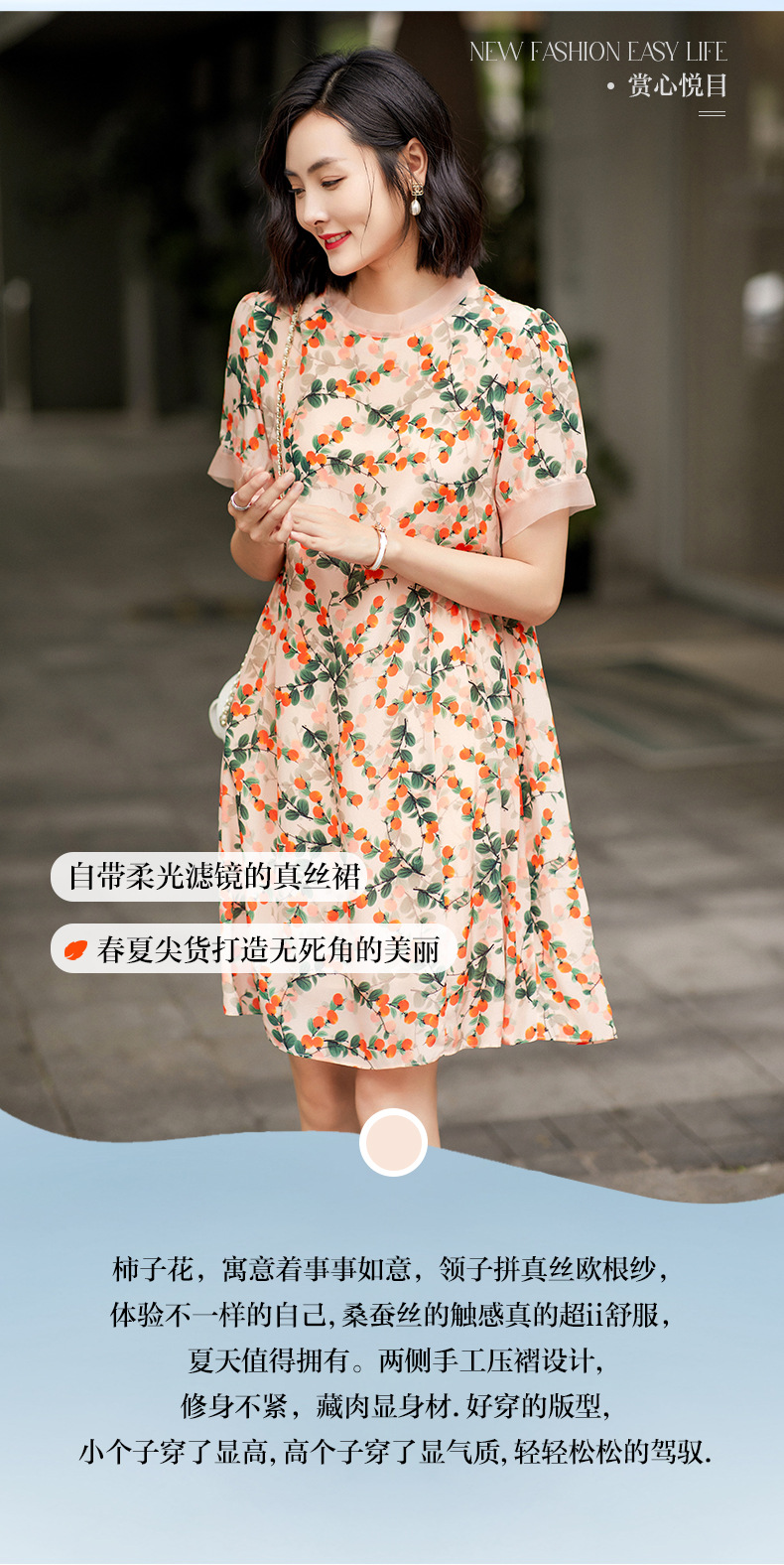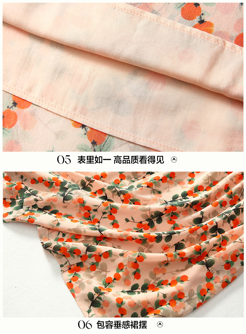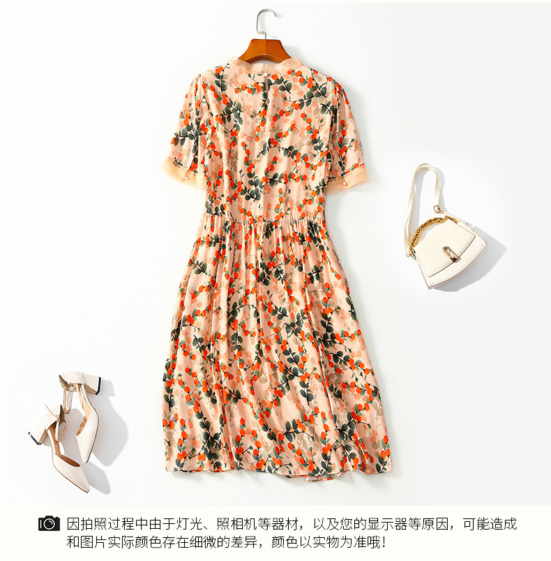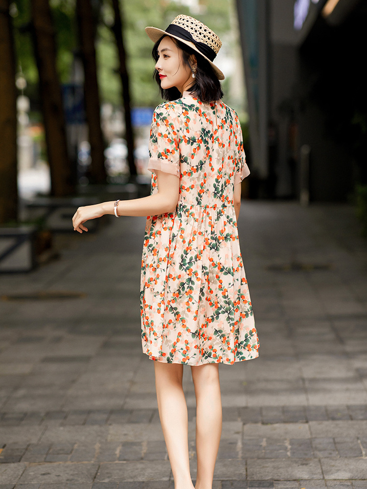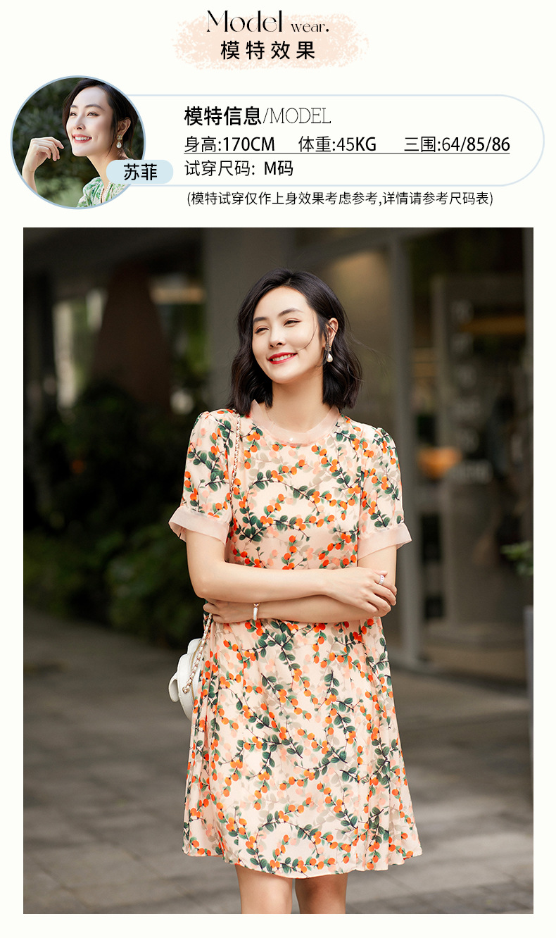 Chiếc váy này có phần cổ tròn đơn giản, điểm nhấn là họa tiết hình quả hồng in nổi bật. Chất liệu tơ tằm tự nhiên mang lại cảm giác mềm mại, mát mẻ và thoáng khí khi mặc. Kiểu dáng ôn hòa, phù hợp cho nhiều dịp sinh hoạt hằng ngày. Bạn có thể mặc đi làm, dạo phố hay dự các cuộc gặp mặt thân mật. Giặt tay với nước lạnh và phơi trong bóng râm sẽ giúp sản phẩm bền đẹp theo thời gian. | Tên sản phẩm: Váy Đầm Liền Thân Nữ Chất Liệu Lụa Tơ Tằm Họa Tiết Hoa - Thời Trang Nữ | Mã sản phẩm: B5017 - Giá: 2.550.000đ | Mã nhà sản xuất: SHDA-G06Hình ảnh sản phẩm
