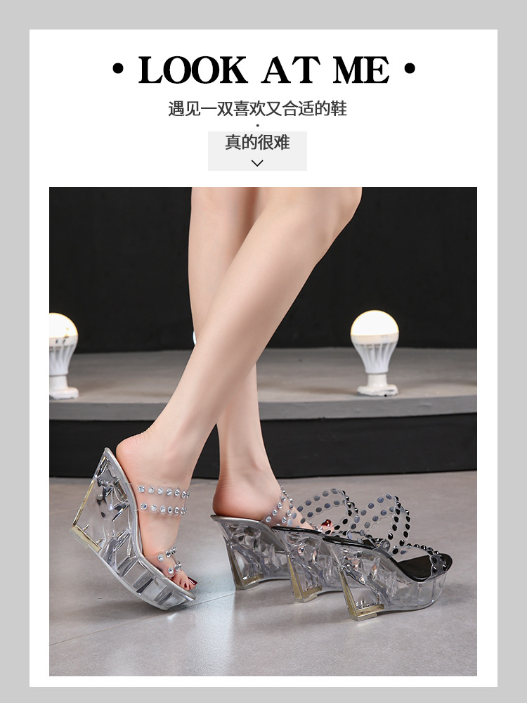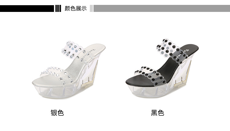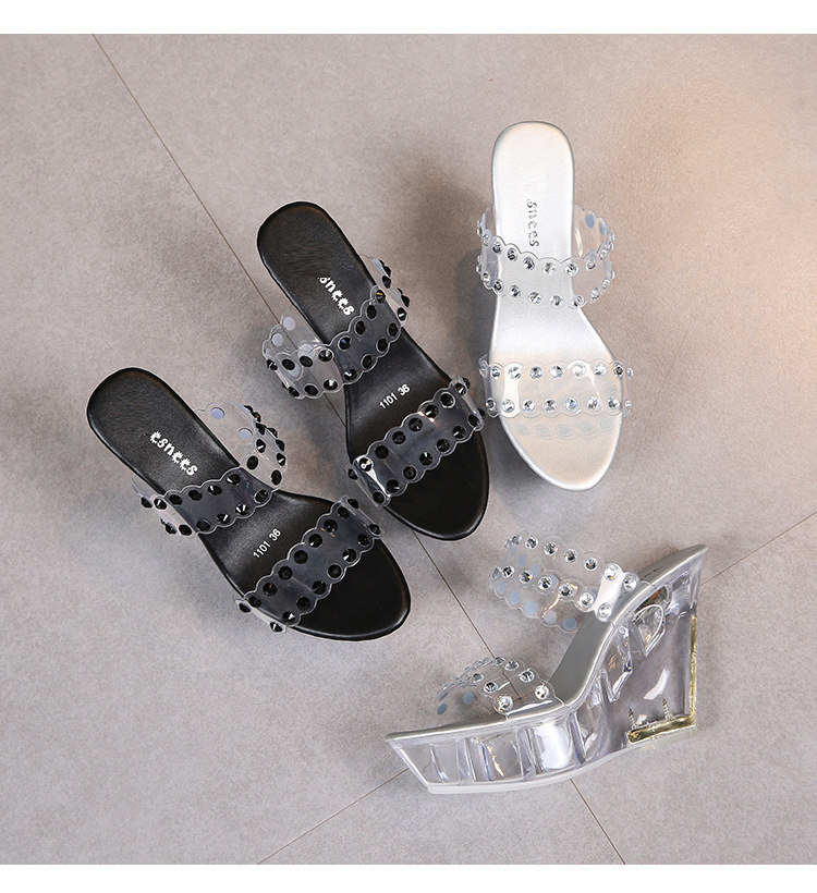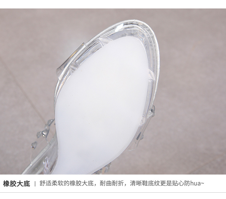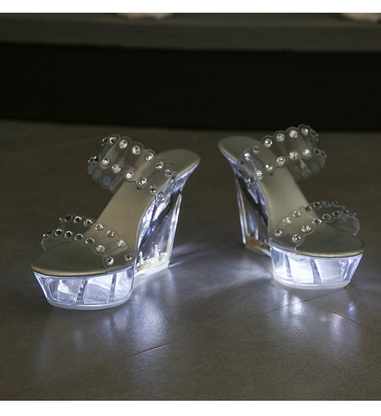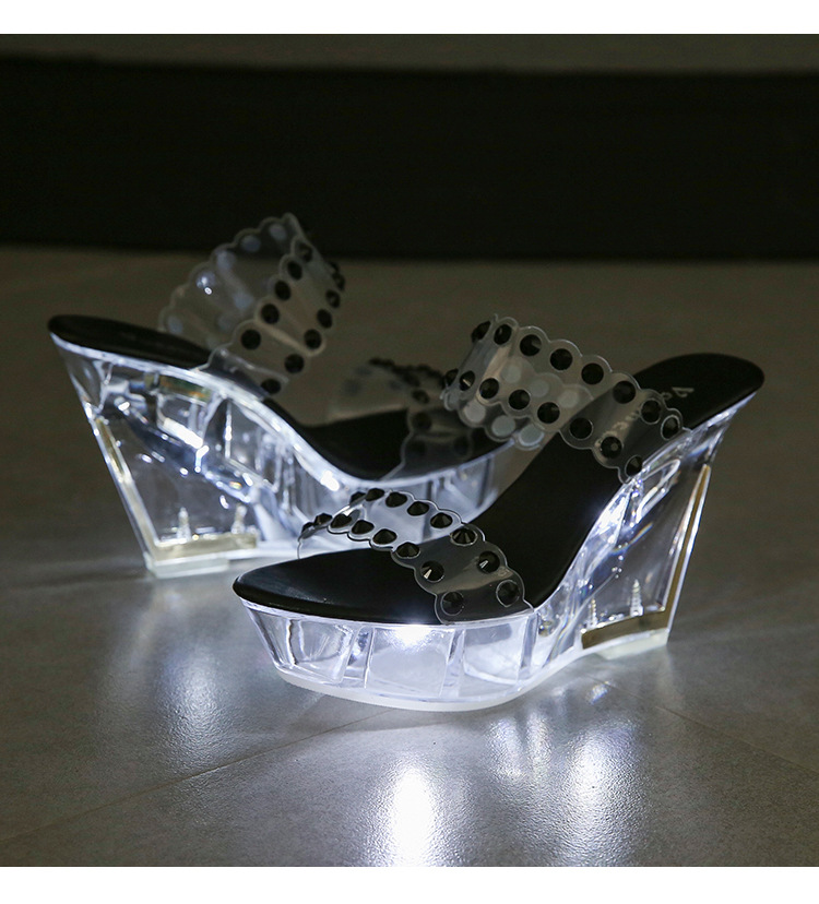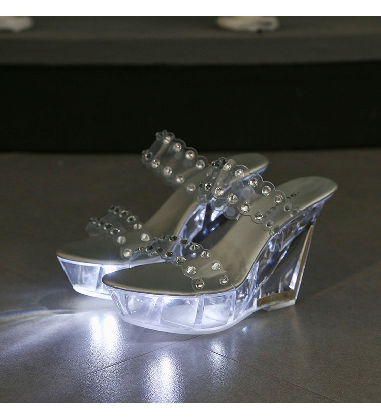 Đôi giày này có phần đế được làm từ chất liệu trong suốt lấp lánh như pha lê, kết hợp gót cao mười phân kiểu dốc thoải. Trên thân giày được đính nhiều hạt trang trí lấp lánh, tạo điểm nhấn bắt mắt. Sản phẩm có khả năng phát sáng, phù hợp cho các buổi tiệc hoặc biểu diễn. Bạn có thể dễ dàng sử dụng như một đôi dép xỏ ngón thông thường, mang lại sự thoải mái và nổi bật khi di chuyển. | Tên sản phẩm: Giày Dép Lê Nữ Gắn Đá Đế Xuồng - Giày Dép Nữ | Mã sản phẩm: B5336 - Giá: 990.000đ | Mã nhà sản xuất: JIENNG-G03Hình ảnh sản phẩm