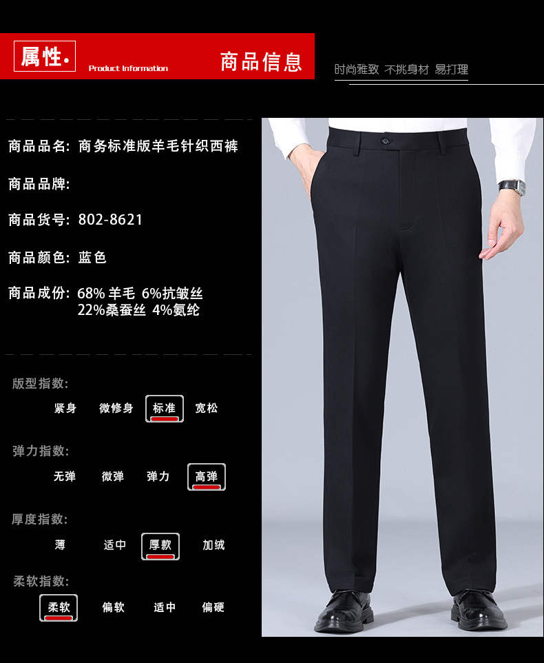 Chiếc quần tây dệt kim dành cho nam, được làm từ chất liệu len ấm áp, phù hợp cho mùa thu đông. Kiểu dáng kết hợp giữa công sở và thoải mái, dễ dàng phối cùng nhiều loại áo. Điểm nổi bật là khả năng hạn chế nhăn, giúp bạn luôn gọn gàng. Có thể mặc đi làm hoặc trong những dịp gặp mặt thông thường. | Tên sản phẩm: Quần Nam Áo Len Dày Ấm Hàng Mùa Xuân Thu Đông Trung Niên - Thời Trang Nam | Mã sản phẩm: B5437 - Giá: 2.290.000đ | Mã nhà sản xuất: SHRYCT-G05Hình ảnh sản phẩm