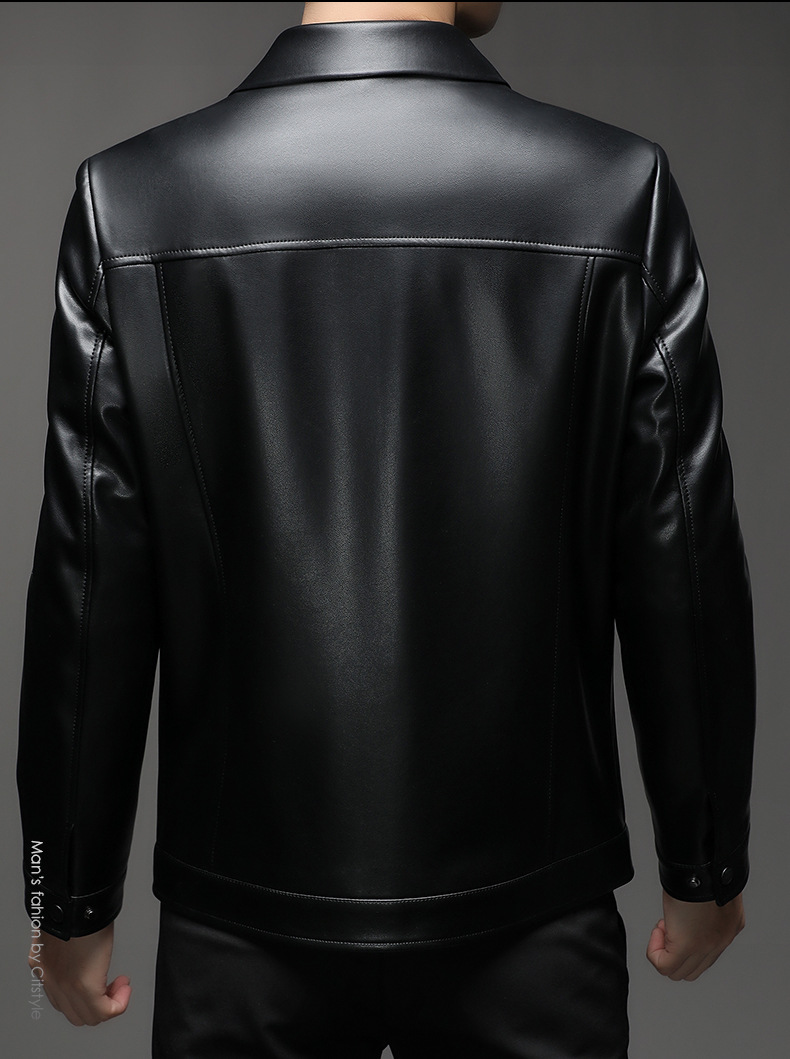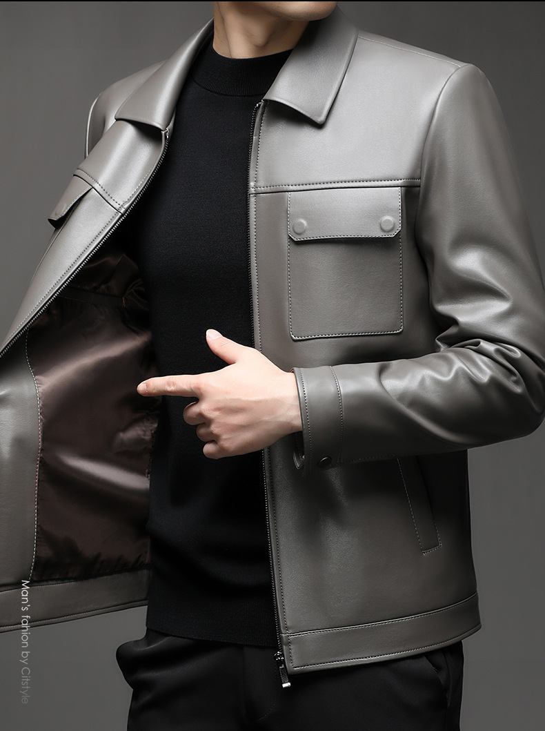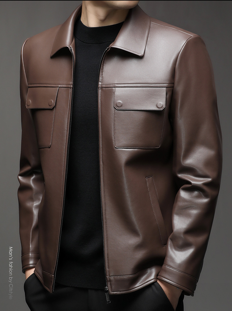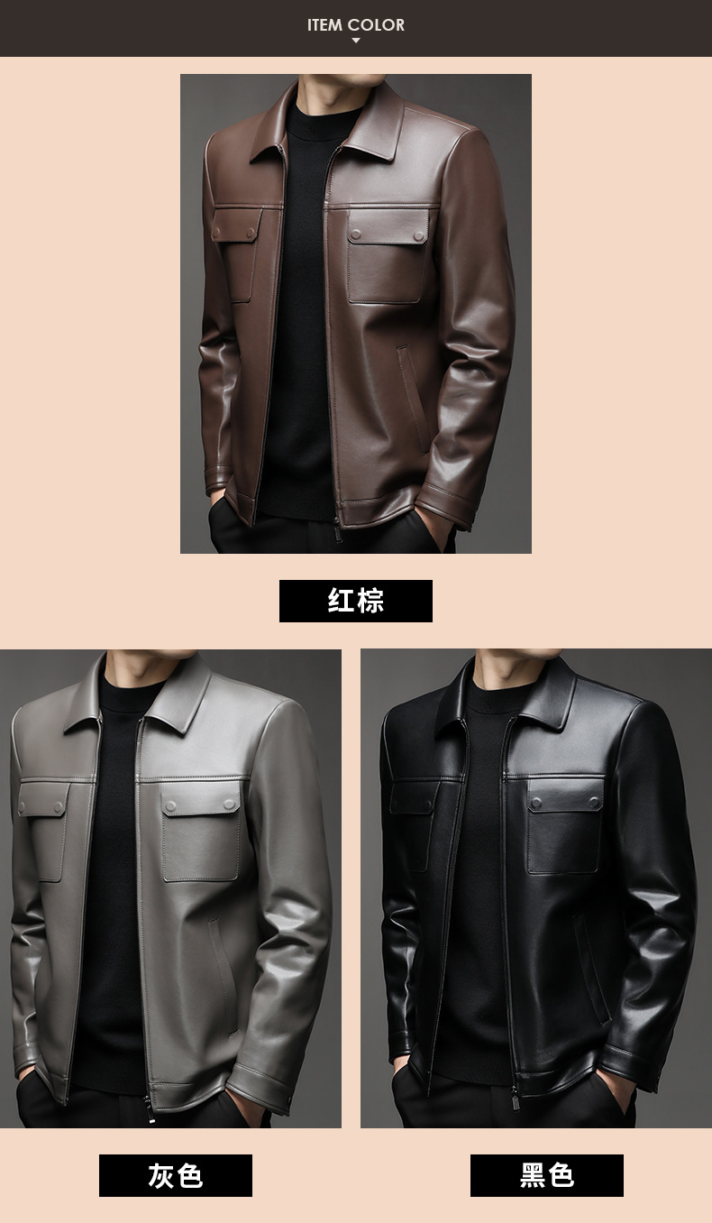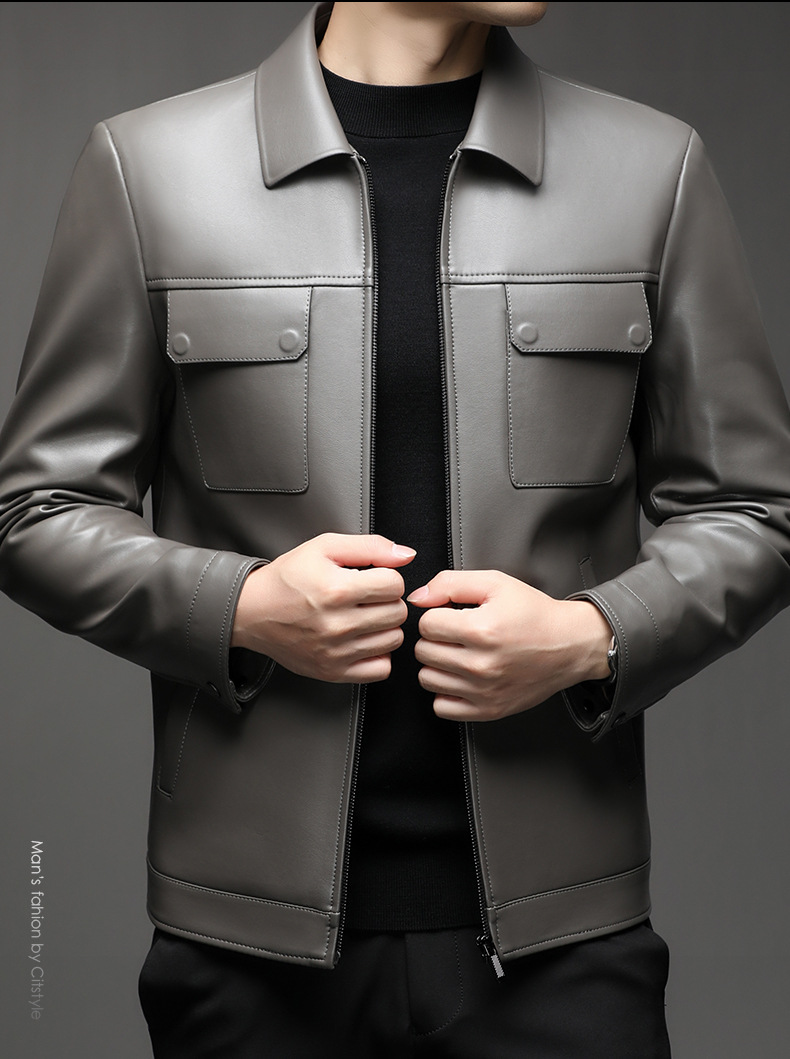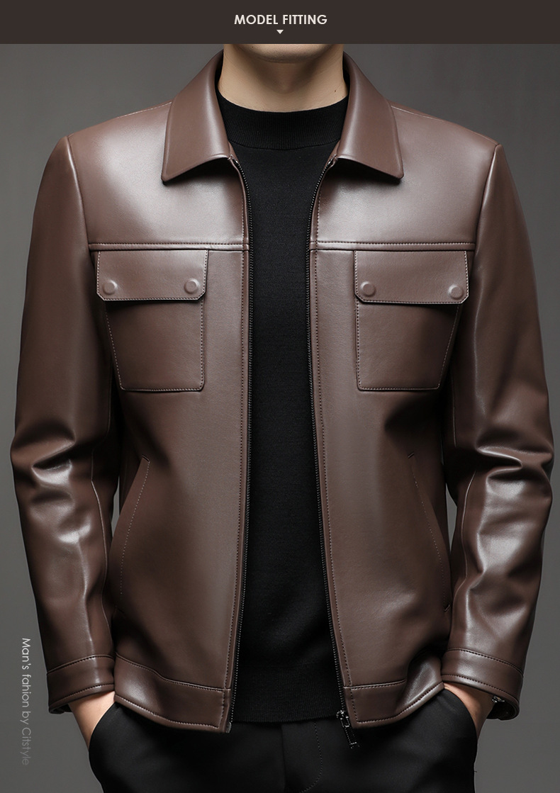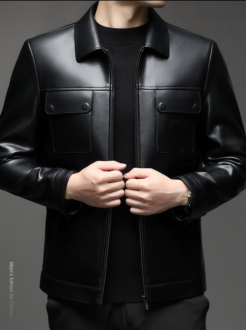 Áo khoác da cừu cho nam, thiết kế kiểu dáng thể thao phóng khoáng với cổ bẻ. Sản phẩm có chất liệu da mềm mại, tạo cảm giác dễ chịu khi mặc. Áo phù hợp cho các dịp đi chơi, dạo phố vào mùa thu đông. Bạn có thể kết hợp linh hoạt với nhiều loại trang phục như áo thun, quần jeans để có phong cách trẻ trung. Mặc áo và giặt nhẹ nhàng theo hướng dẫn để giữ form dáng và độ bền đẹp theo thời gian. | Tên sản phẩm: Áo Da Nam Kín Cổ Hàng Mùa Xuân Thu Đông Trung Niên - Thời Trang Nam | Mã sản phẩm: B5441 - Giá: 2.390.000đ | Mã nhà sản xuất: SHRYCT-G05Hình ảnh sản phẩm