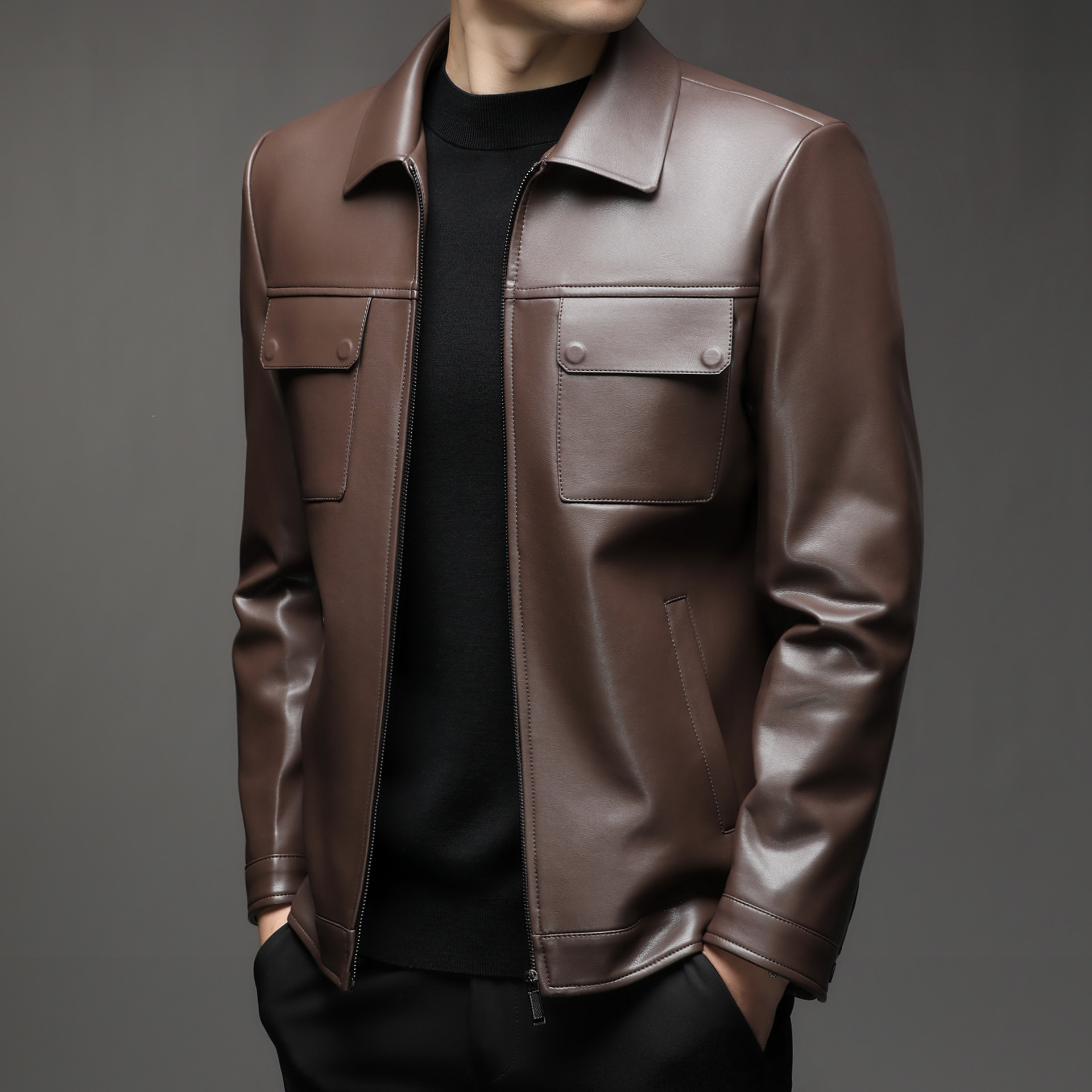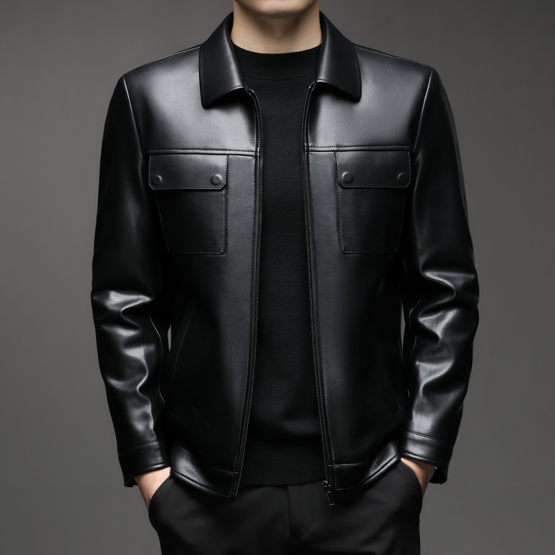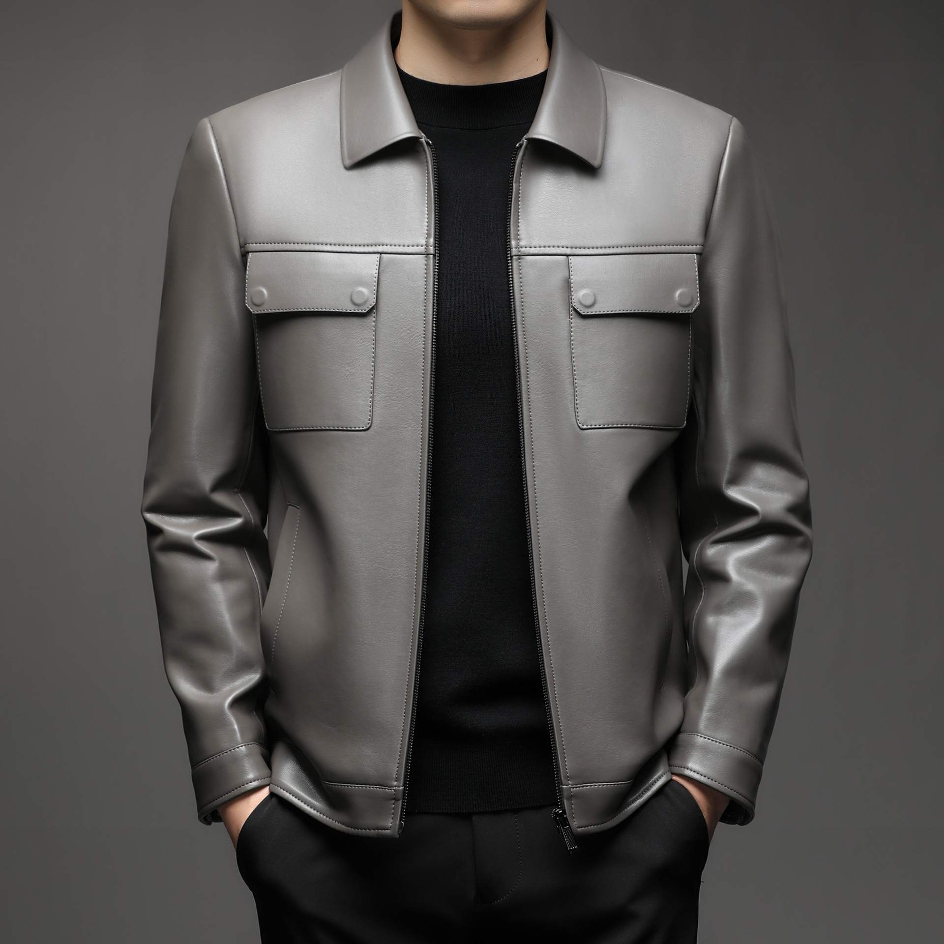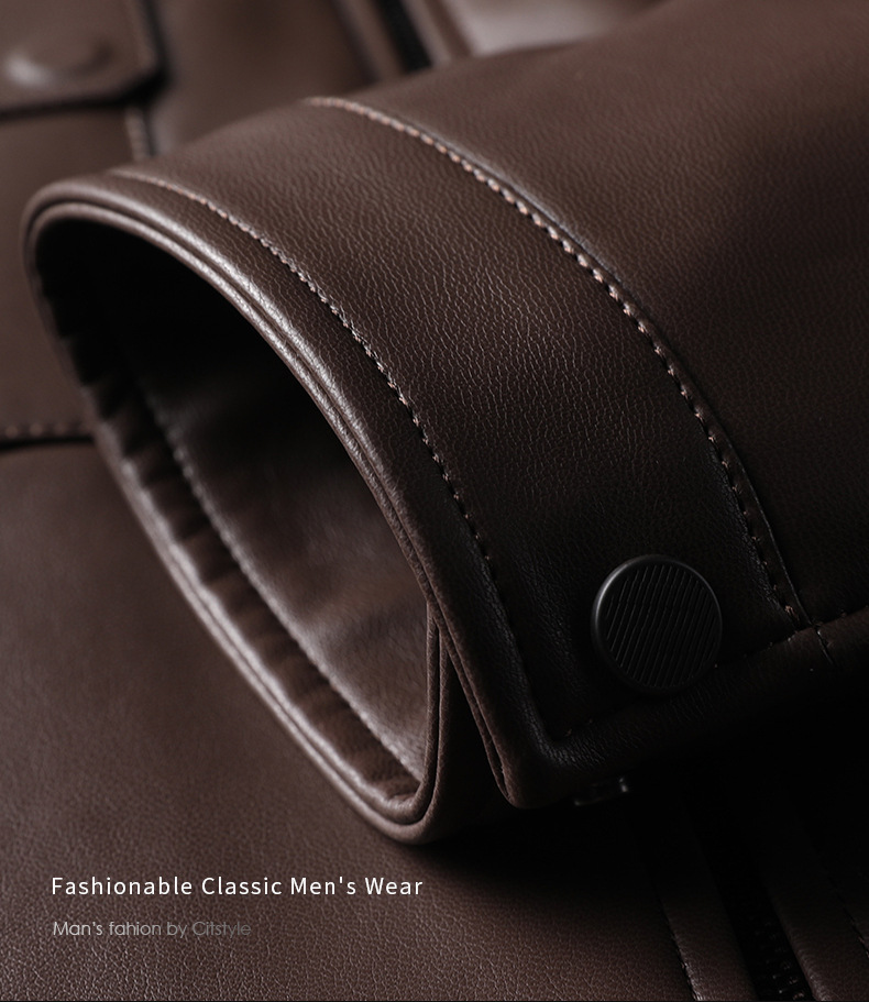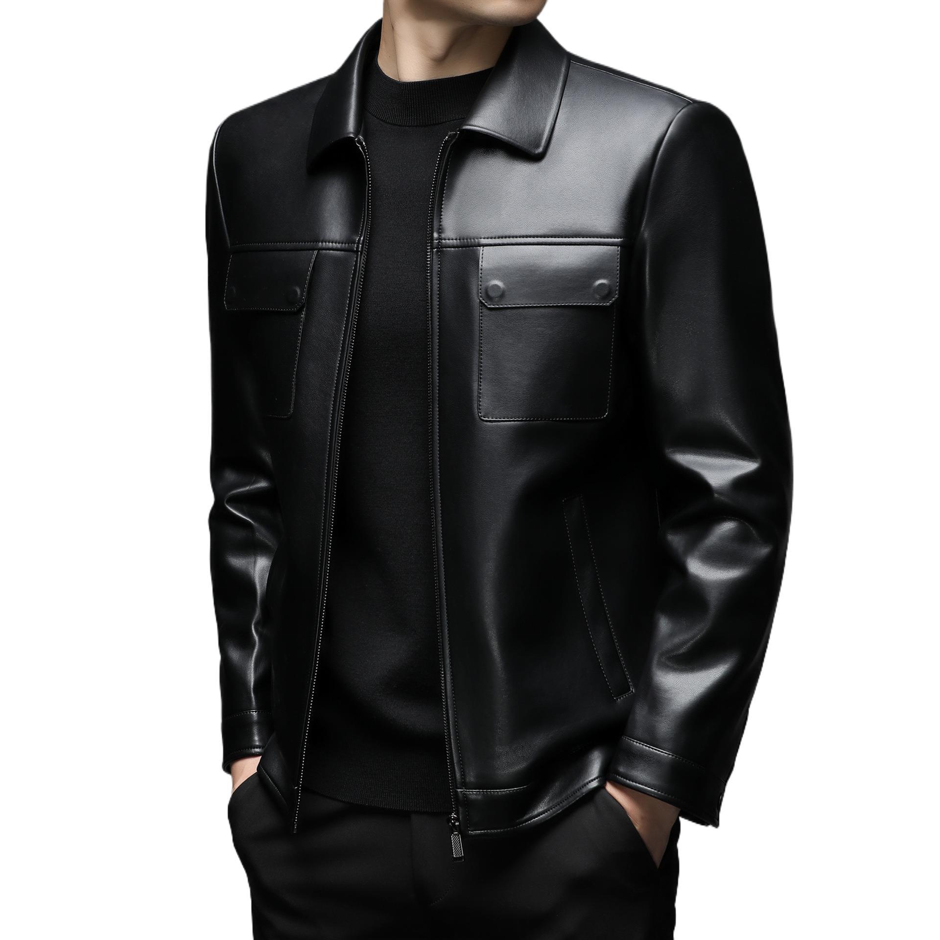 Áo khoác da cừu cho nam, thiết kế kiểu dáng thể thao phóng khoáng với cổ bẻ. Sản phẩm có chất liệu da mềm mại, tạo cảm giác dễ chịu khi mặc. Áo phù hợp cho các dịp đi chơi, dạo phố vào mùa thu đông. Bạn có thể kết hợp linh hoạt với nhiều loại trang phục như áo thun, quần jeans để có phong cách trẻ trung. Mặc áo và giặt nhẹ nhàng theo hướng dẫn để giữ form dáng và độ bền đẹp theo thời gian. | Tên sản phẩm: Áo Da Nam Kín Cổ Hàng Mùa Xuân Thu Đông Trung Niên - Thời Trang Nam | Mã sản phẩm: B5441 - Giá: 2.390.000đ | Mã nhà sản xuất: SHRYCT-G05Hình ảnh sản phẩm