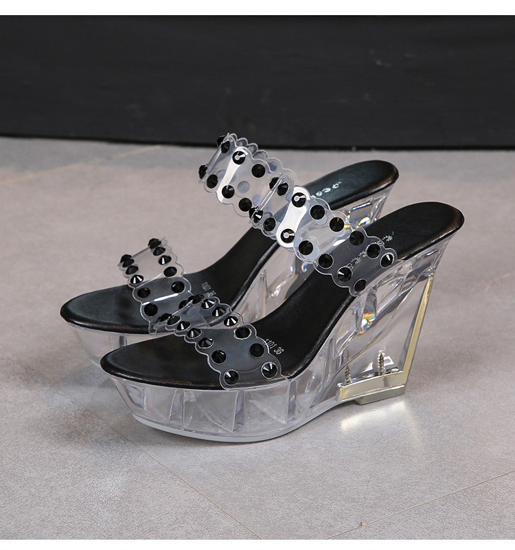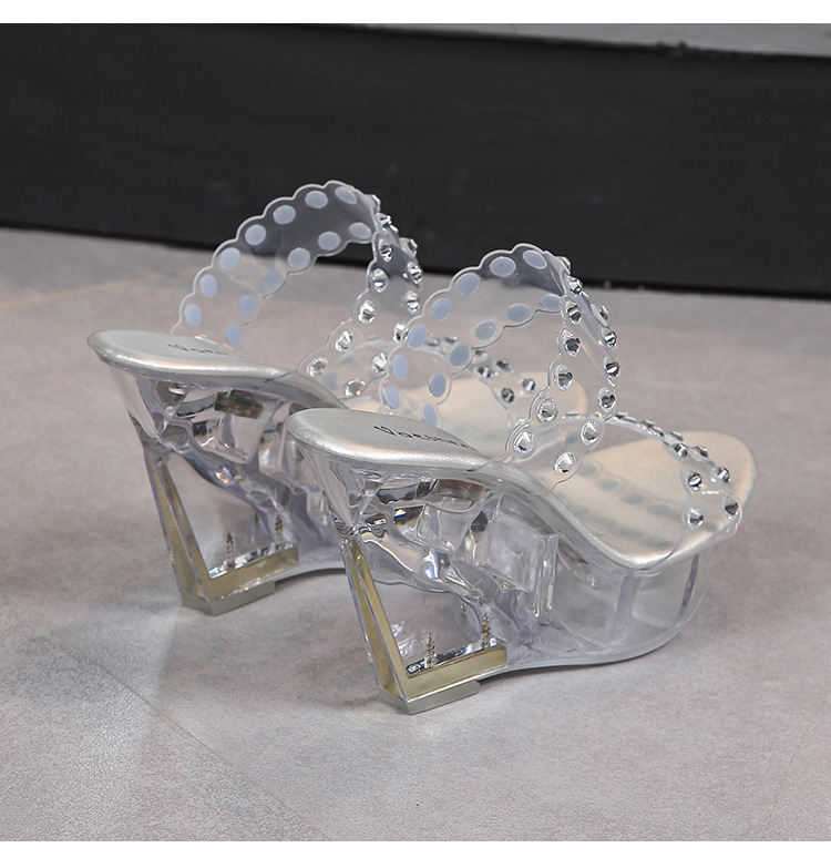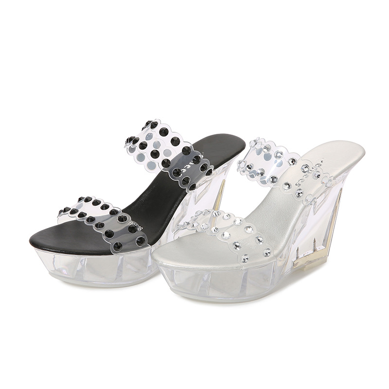 Đôi giày này có phần đế được đính nhiều hạt pha lê lấp lánh, tạo điểm nhấn nổi bật. Kiểu dáng theo phong cách Hàn Quốc với phần đế cao mười phân, giúp tôn dáng người đi. Sản phẩm thích hợp để sử dụng khi đi chơi buổi tối hoặc trong các buổi biểu diễn. Đế giày làm từ chất liệu trong suốt, tăng độ bám và tính thẩm mỹ. Bạn chỉ cần xỏ chân vào và cài qu là đã có thể sử dụng ngay. | Tên sản phẩm: Giày Cao Gót Nữ Gắn Đá Đế Xuồng Phong Cách Hàn Quốc - Giày Dép Nữ | Mã sản phẩm: B5506 - Giá: 880.000đ | Mã nhà sản xuất: JIENNG-G03Hình ảnh sản phẩm