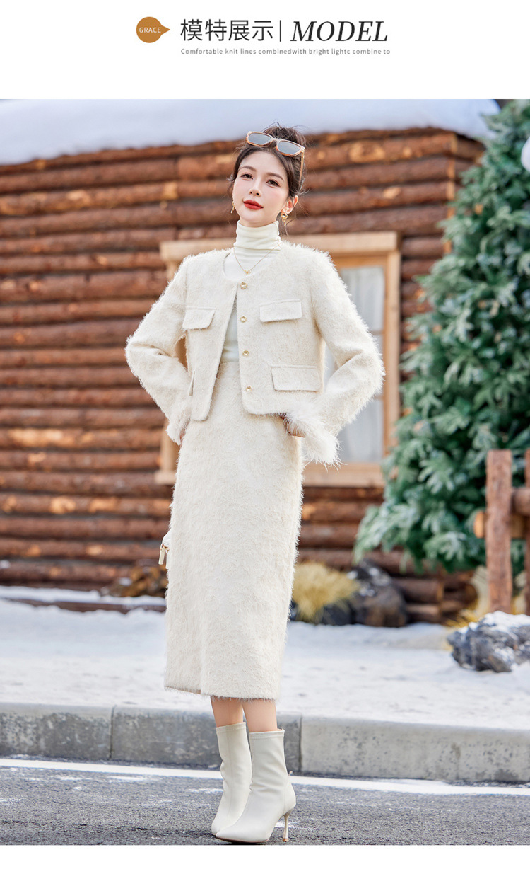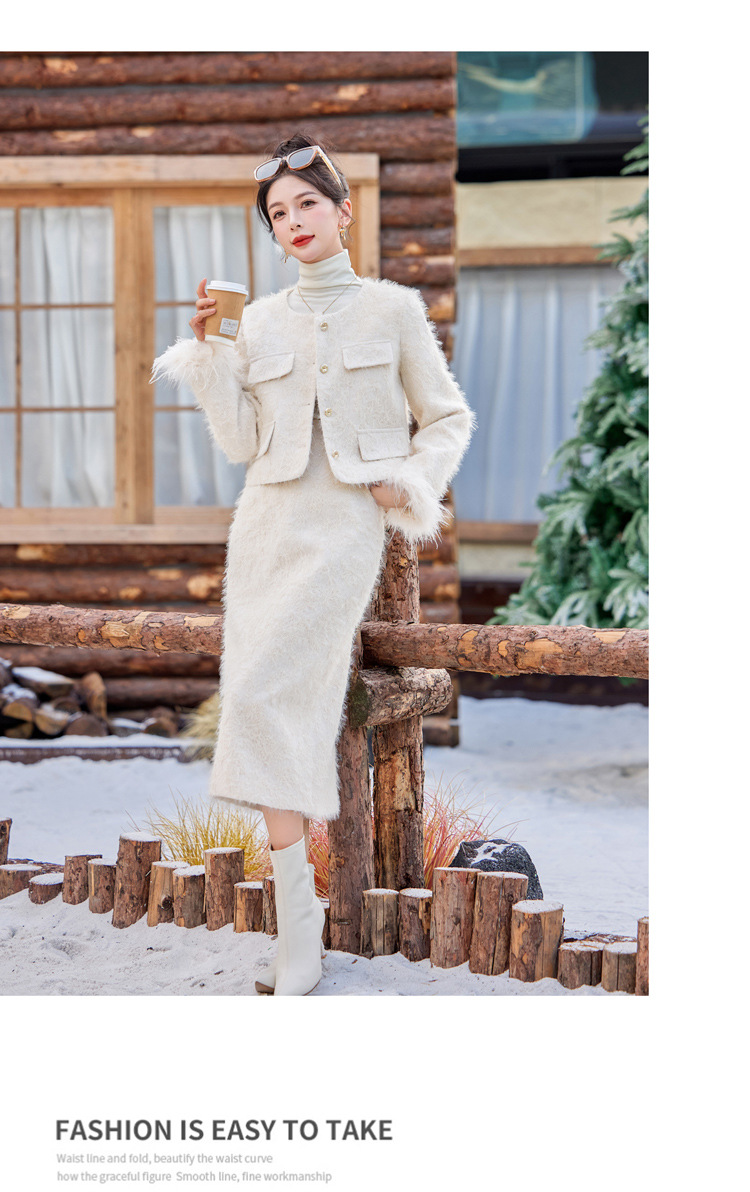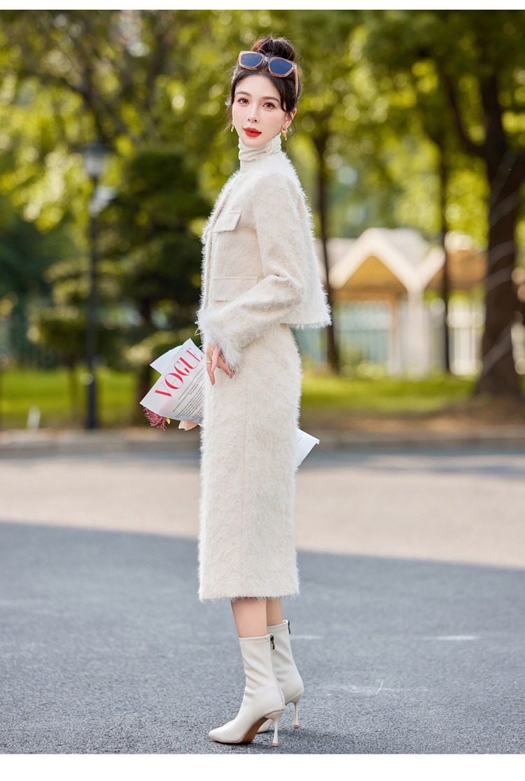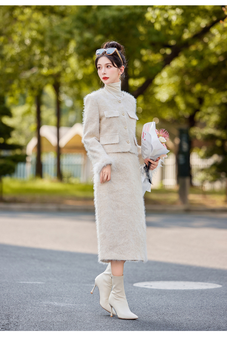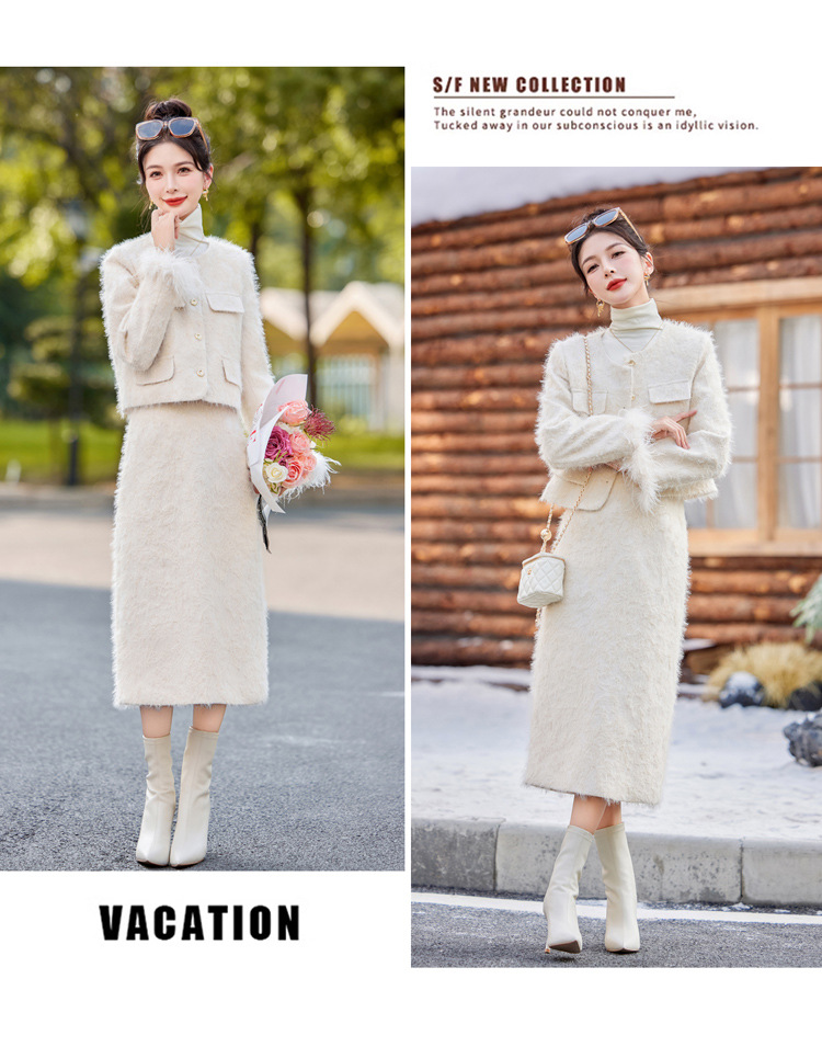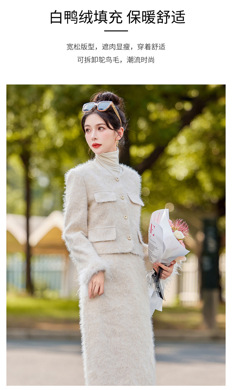 Bộ trang phục hai mảnh này gồm áo khoác dạng dáng cổ điển và chân váy xếp ly eo cao. Áo khoác được lót lớp bông mềm mại, ấm áp, kết hợp điểm nhấn là lớp phụ kiện lông vũ mềm mại ở cổ áo. Chân váy dáng ngắn giúp tôn dáng người mặc. Mặc áo khoác cùng chân váy có sẵn để có bộ trang phục đồng bộ, hoặc kết hợp riêng với các trang phục khác nhau. | Tên sản phẩm: Áo Khoác Nữ Cả Bộ 2 Món Hàng Mùa Xuân Thu Đông - Thời Trang Nữ | Mã sản phẩm: B5729 - Giá: 3.400.000đ | Mã nhà sản xuất: HADG-G06Hình ảnh sản phẩm