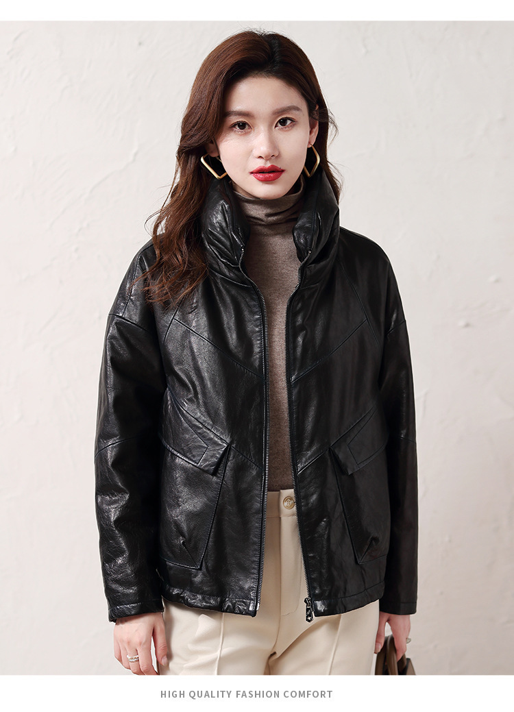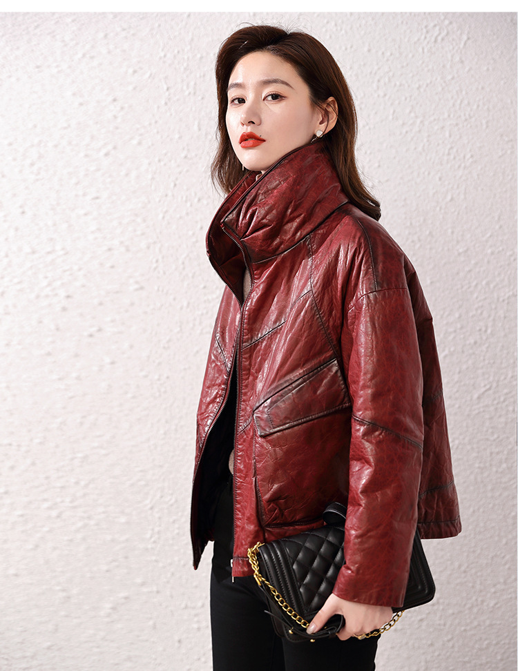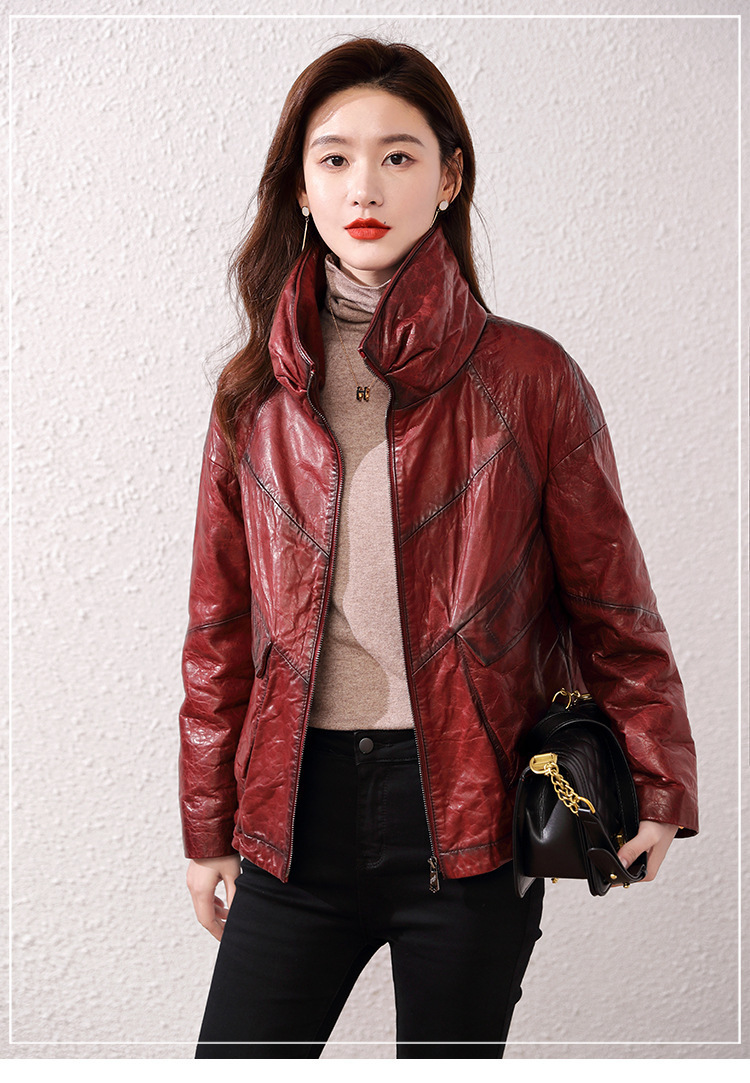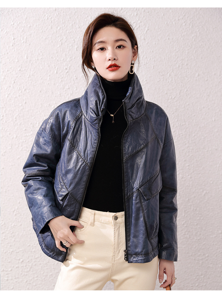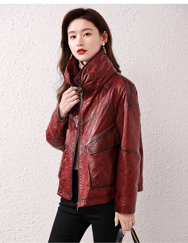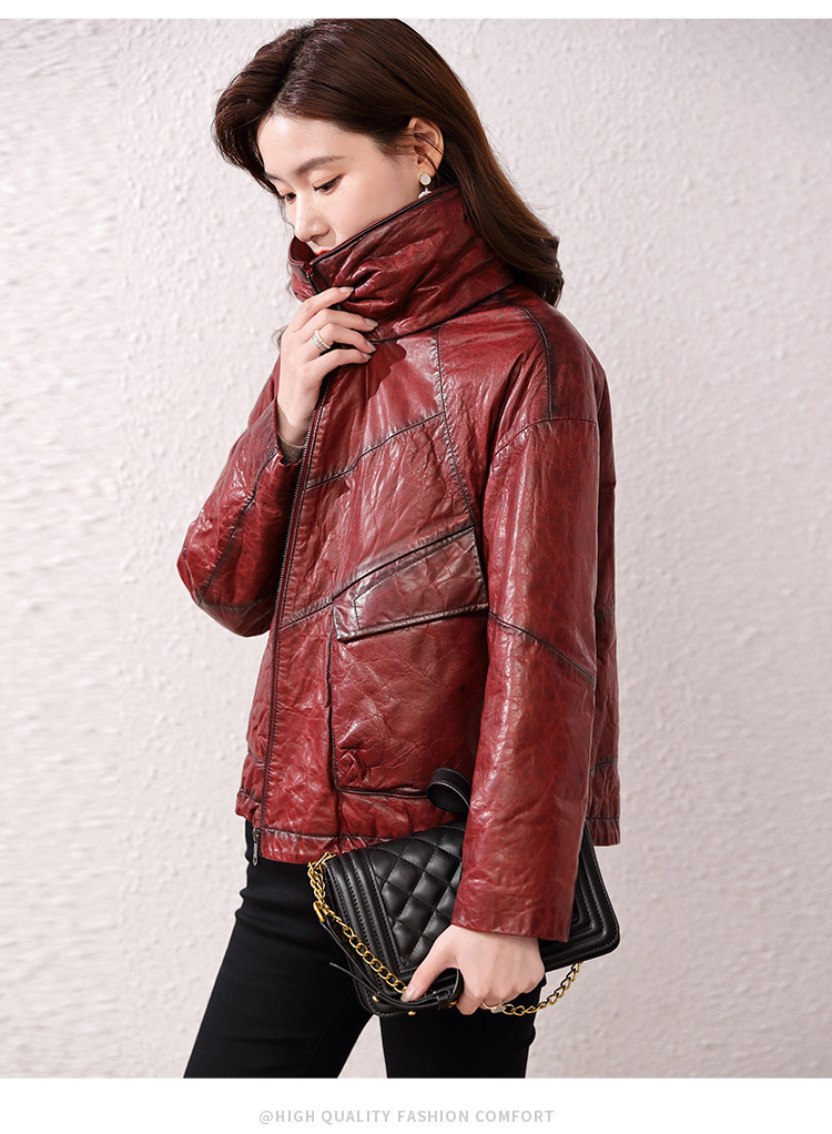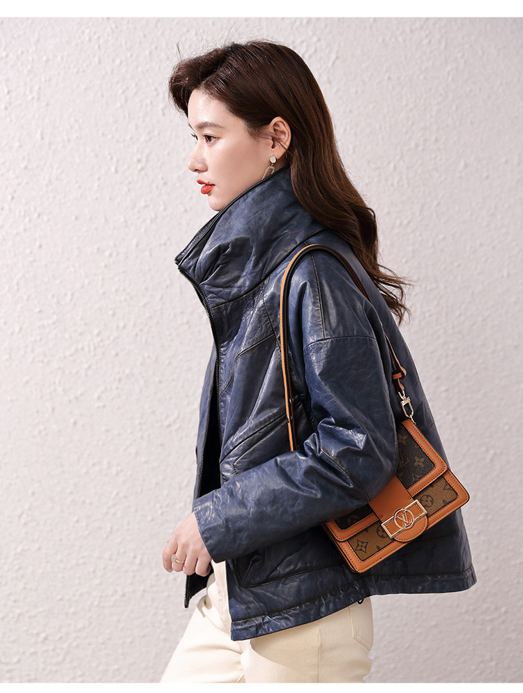 Áo khoác nữ dáng ngắn, rộng rãi, có lớp lông vũ giữ ấm bên trong, phù hợp cho mùa lạnh. Chất liệu da thật bền đẹp, cổ áo thiết kế dựng đứng giúp giữ ấm cổ và tạo phong cách trẻ trung. Sản phẩm dễ dàng phối với nhiều loại trang phục như quần jeans hay váy. Khi sử dụng, lau nhẹ bằng khăn mềm nếu bám bụi và bảo quản nơi khô ráo, thoáng mát. | Tên sản phẩm: Áo Da Nữ Chất Liệu Da Bò Dày Ấm Hàng Mùa Xuân Thu Đông - Thời Trang Nữ | Mã sản phẩm: B5829 - Giá: 7.030.000đ | Mã nhà sản xuất: HADG-G06Hình ảnh sản phẩm