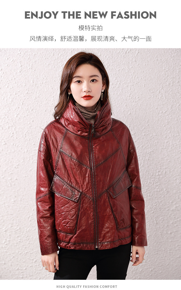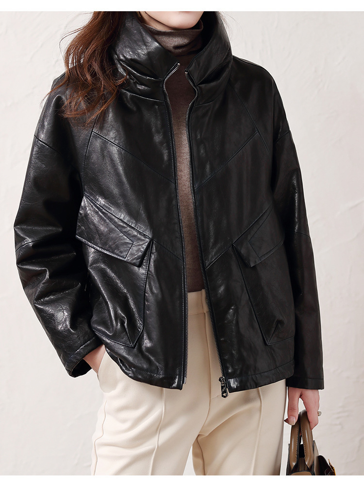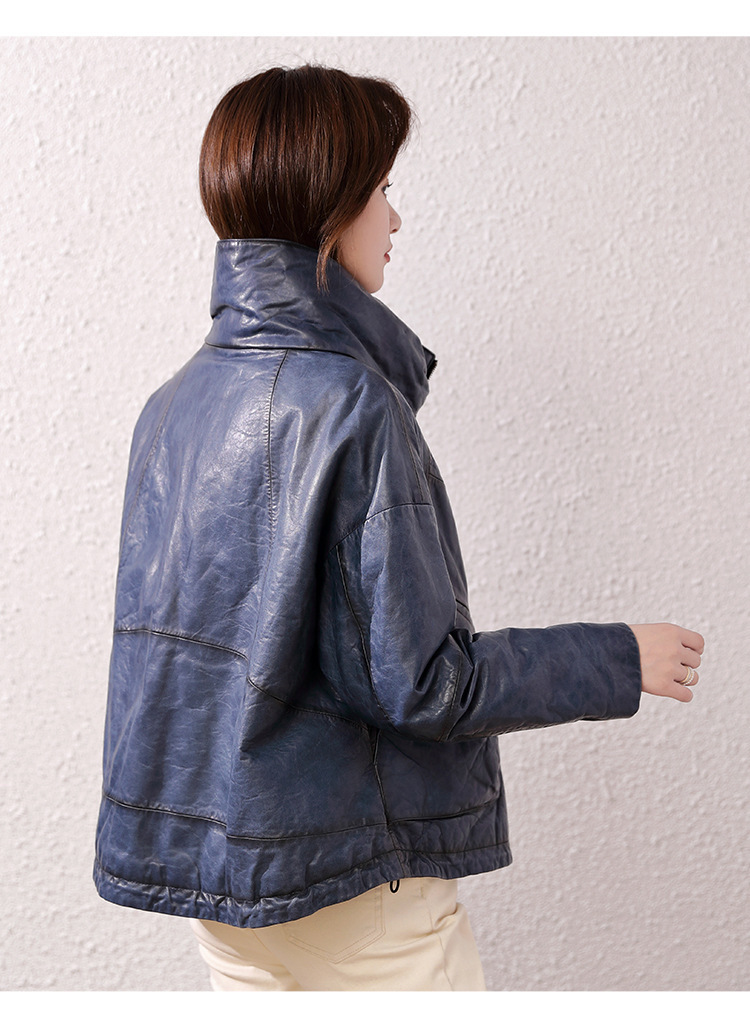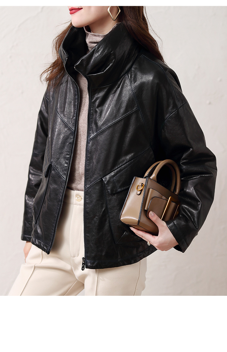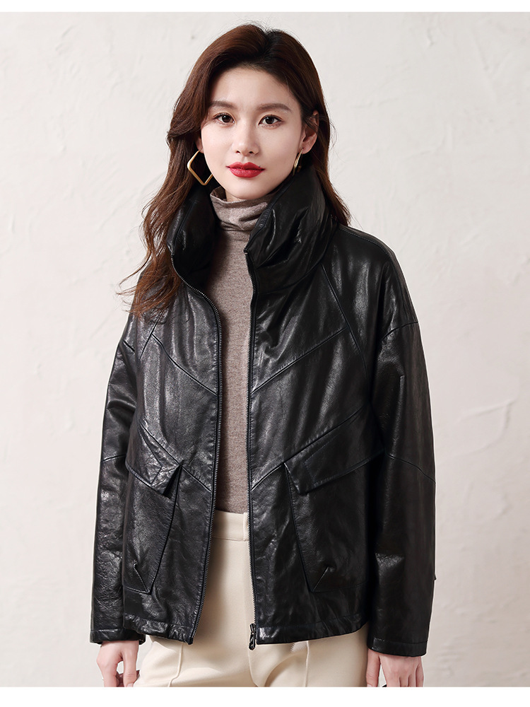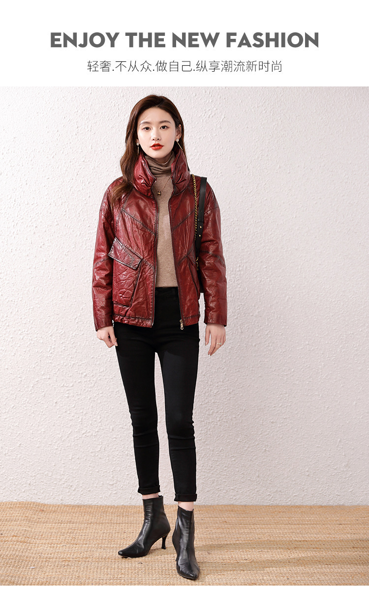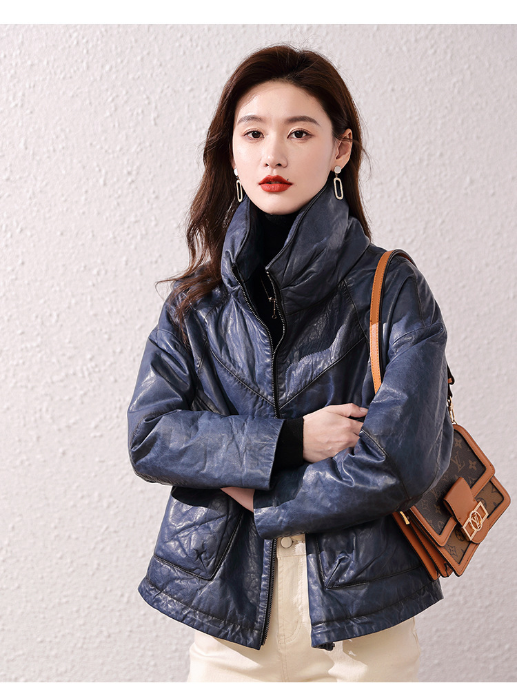 Áo khoác nữ dáng ngắn, rộng rãi, có lớp lông vũ giữ ấm bên trong, phù hợp cho mùa lạnh. Chất liệu da thật bền đẹp, cổ áo thiết kế dựng đứng giúp giữ ấm cổ và tạo phong cách trẻ trung. Sản phẩm dễ dàng phối với nhiều loại trang phục như quần jeans hay váy. Khi sử dụng, lau nhẹ bằng khăn mềm nếu bám bụi và bảo quản nơi khô ráo, thoáng mát. | Tên sản phẩm: Áo Da Nữ Chất Liệu Da Bò Dày Ấm Hàng Mùa Xuân Thu Đông - Thời Trang Nữ | Mã sản phẩm: B5829 - Giá: 7.030.000đ | Mã nhà sản xuất: HADG-G06Hình ảnh sản phẩm