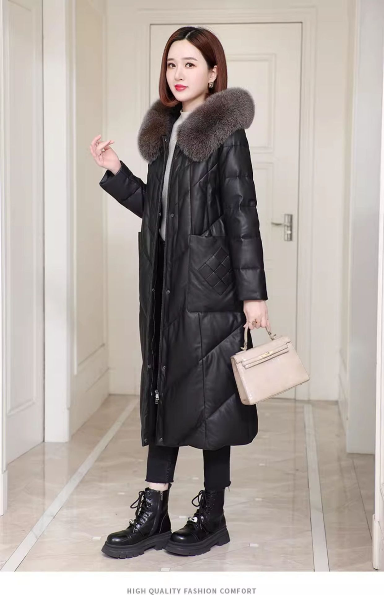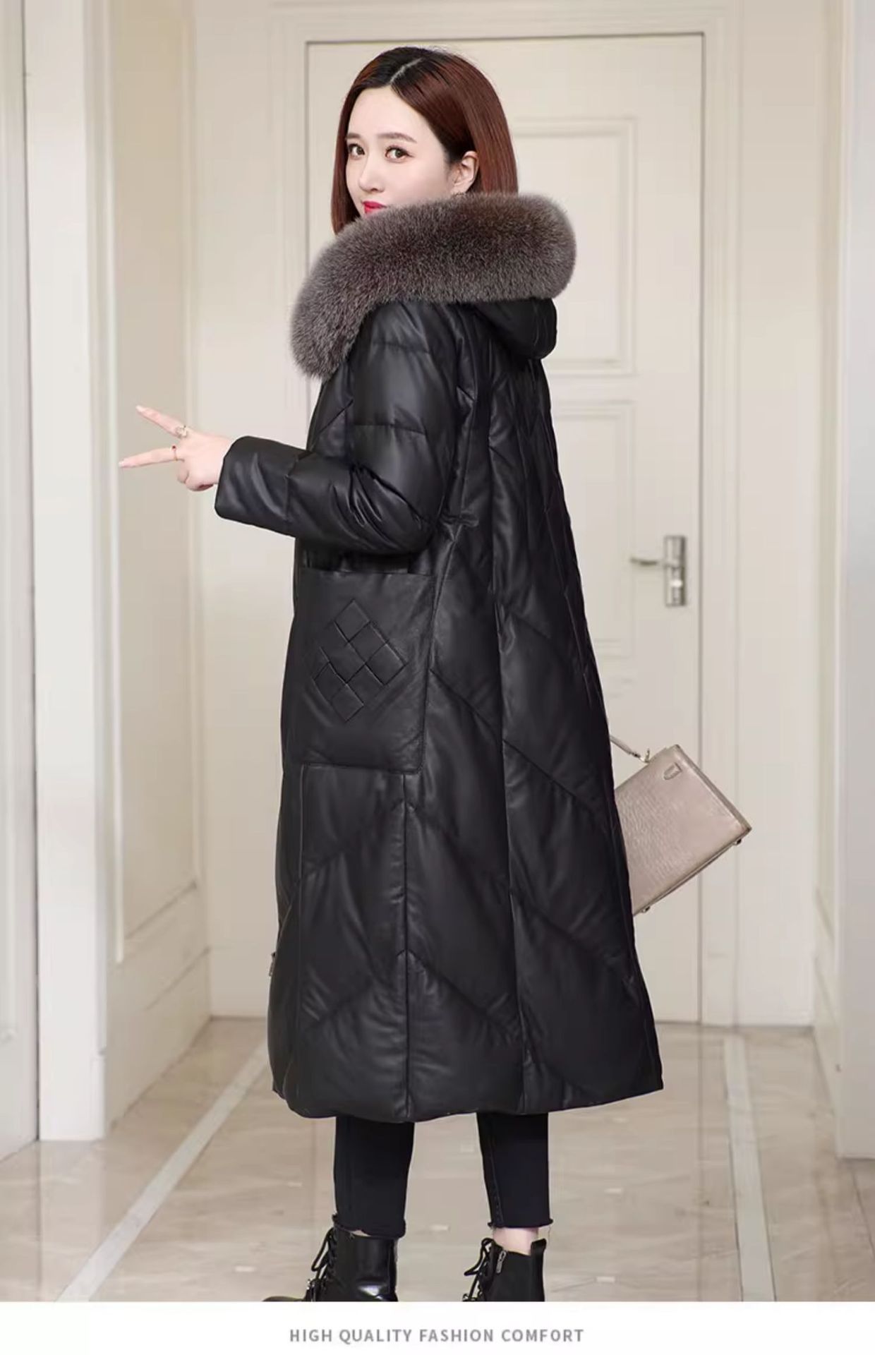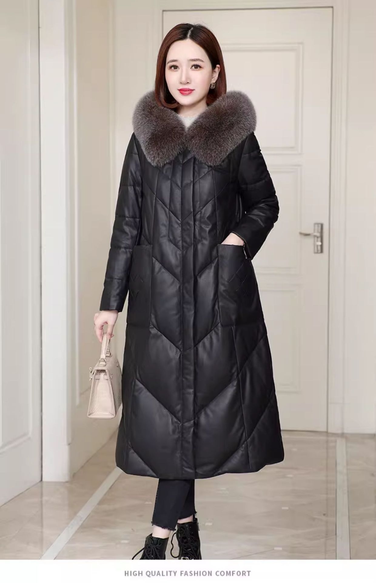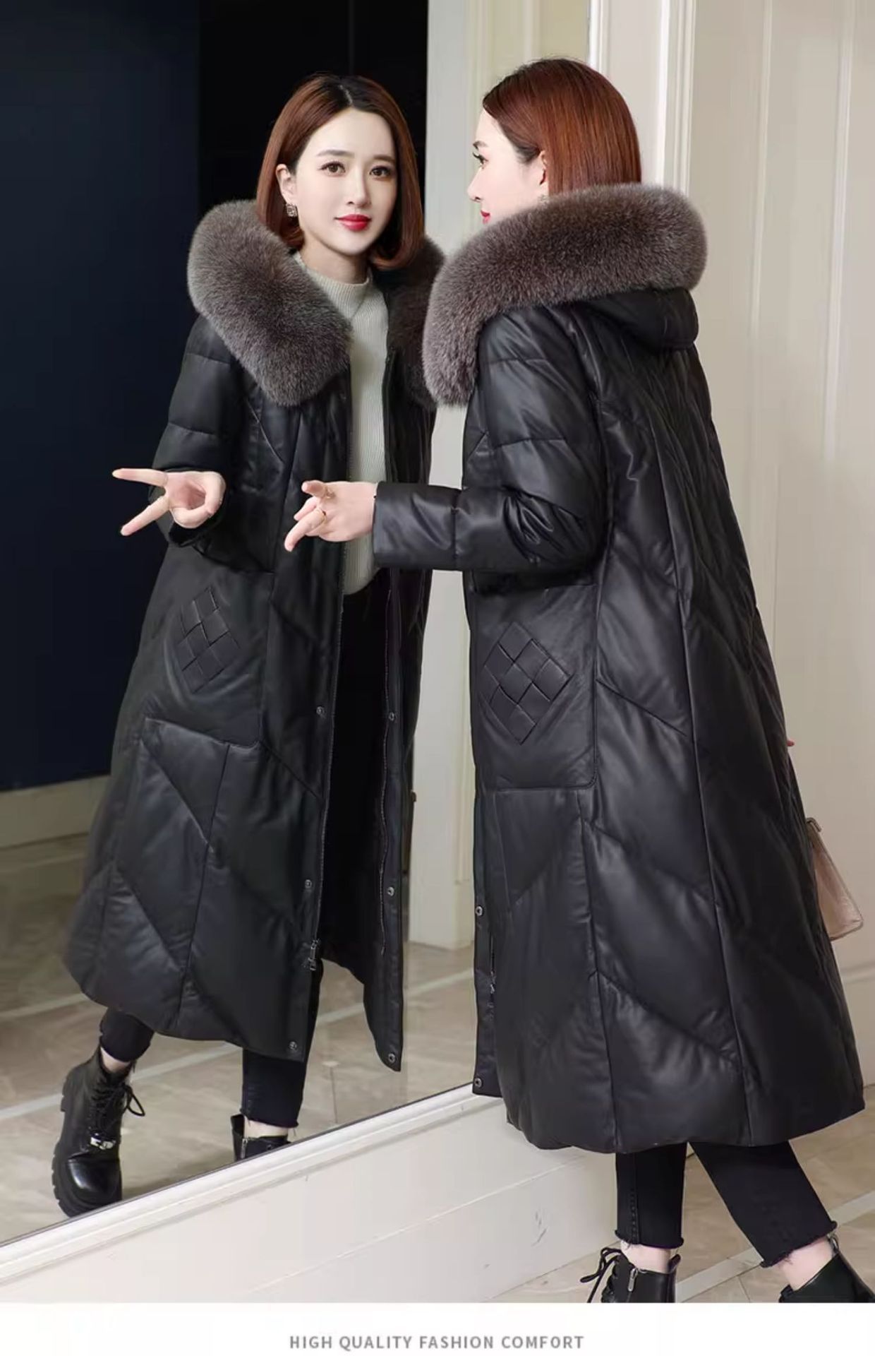 Áo khoác dành cho nữ, dáng dài rộng rãi, có size lớn. Chất liệu da thật mềm mại kết hợp với lớp lông vũ bên trong giữ ấm tốt. Phần cổ áo được viền lông cáo tự nhiên, tăng thêm vẻ đẹp . Sản phẩm mặc ấm vào mùa đông, phù hợp khi đi làm hoặc dạo phố. Mặc kèm áo thun hoặc áo len bên trong để tạo sự thoải mái. | Tên sản phẩm: Áo Da Nữ Chất Liệu Da Bò Big Size Ngoại Cỡ - Thời Trang Nữ | Mã sản phẩm: B5940 - Giá: 8.790.000đ | Mã nhà sản xuất: HADG-G06Hình ảnh sản phẩm