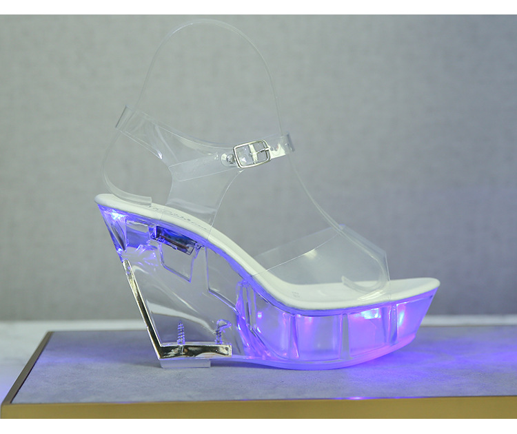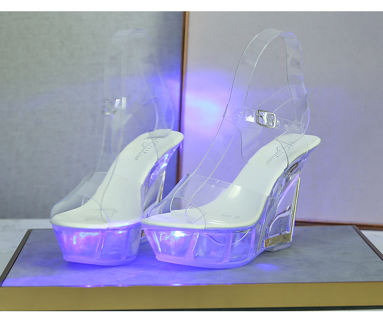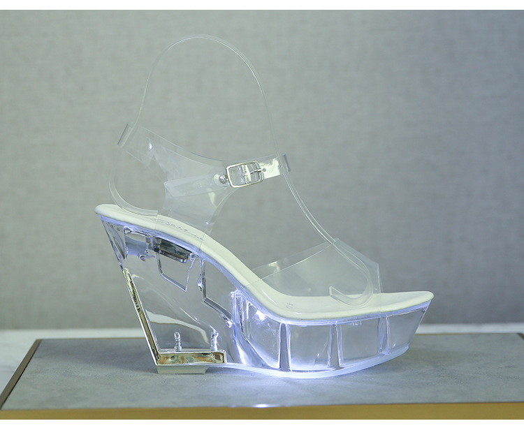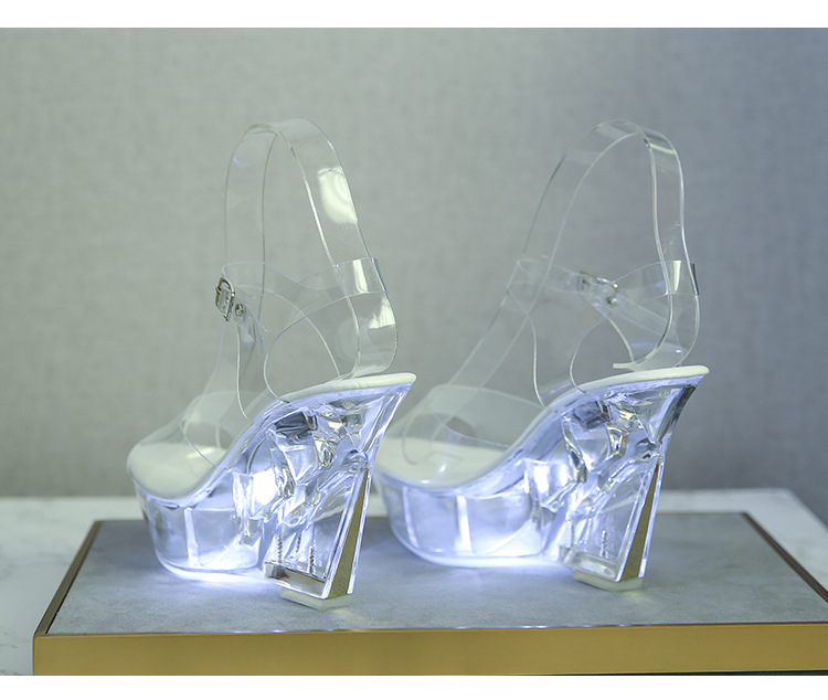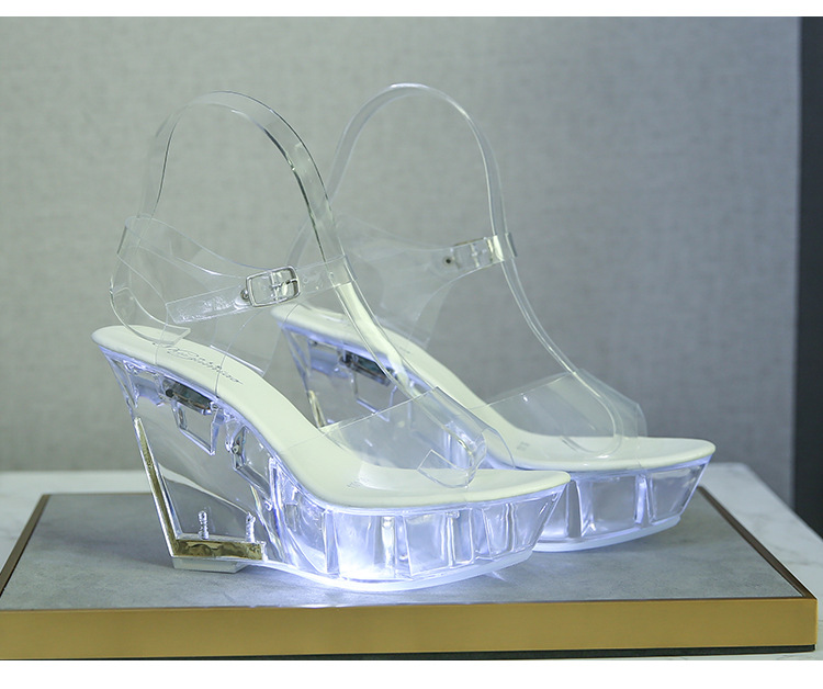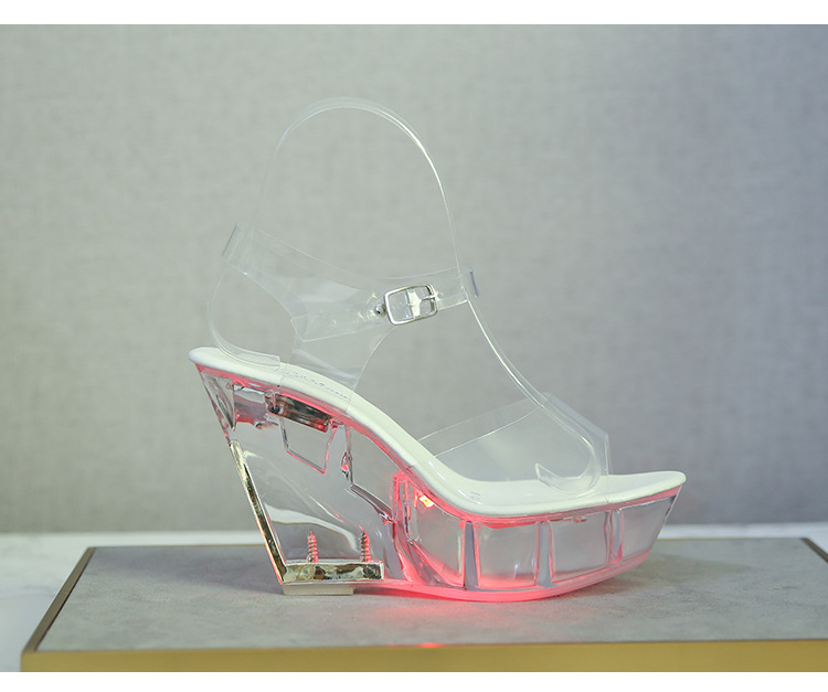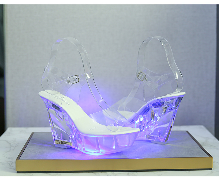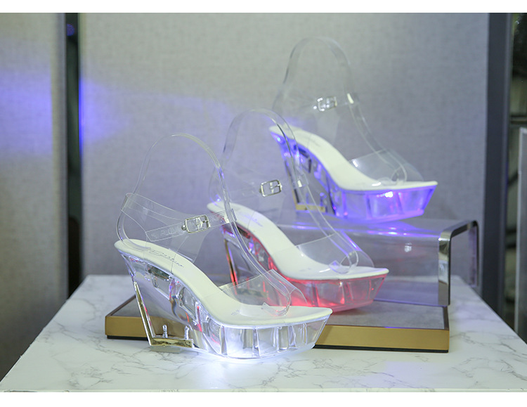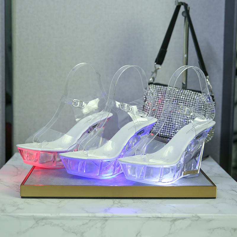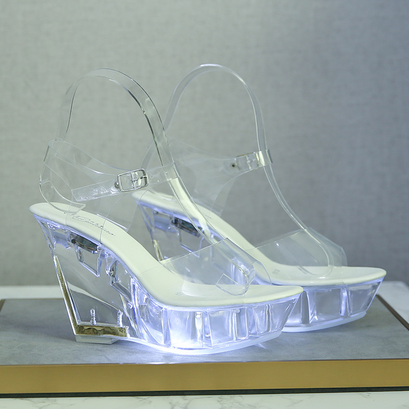 Đôi giày nữ này có phần đế dốc cao mười phân, tạo dáng thanh thoát và nâng tầm vóc dáng. Chất liệu trong suốt lấp lánh như pha lê nơi đế giày, cùng khả năng phát sáng độc đáo, rất phù hợp cho các buổi biểu diễn sân khấu hoặc khi ra ngoài vào buổi tối. Kiểu dáng phá cách, kết hợp giữa dép qu hờ và giày cao gót, mang đến sự thoải mái và nổi bật. Bạn chỉ cần xỏ chân vào, điều chỉnh qu cho vừa vặn là có thể tự tin bước đi. | Tên sản phẩm: Giày Cao Gót Nữ Đế Xuồng - Giày Dép Nữ | Mã sản phẩm: B5992 - Giá: 990.000đ | Mã nhà sản xuất: JIENNG-G03Hình ảnh sản phẩm