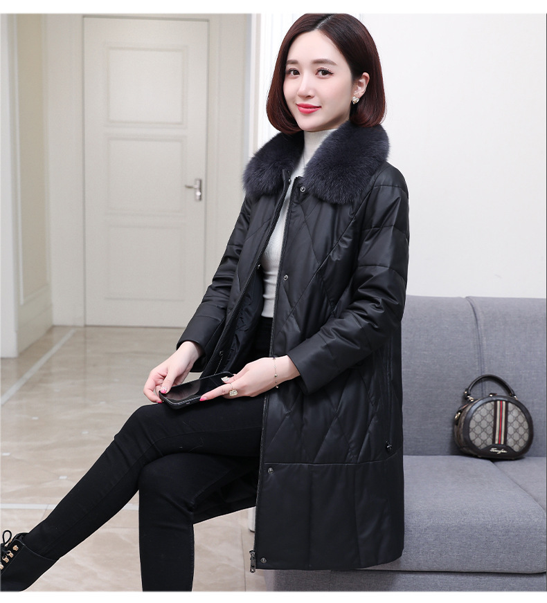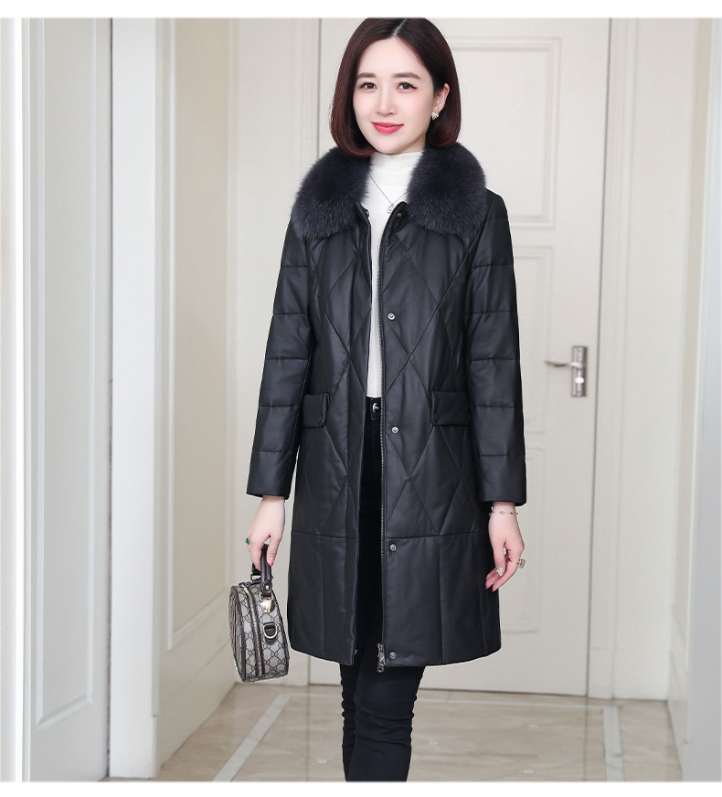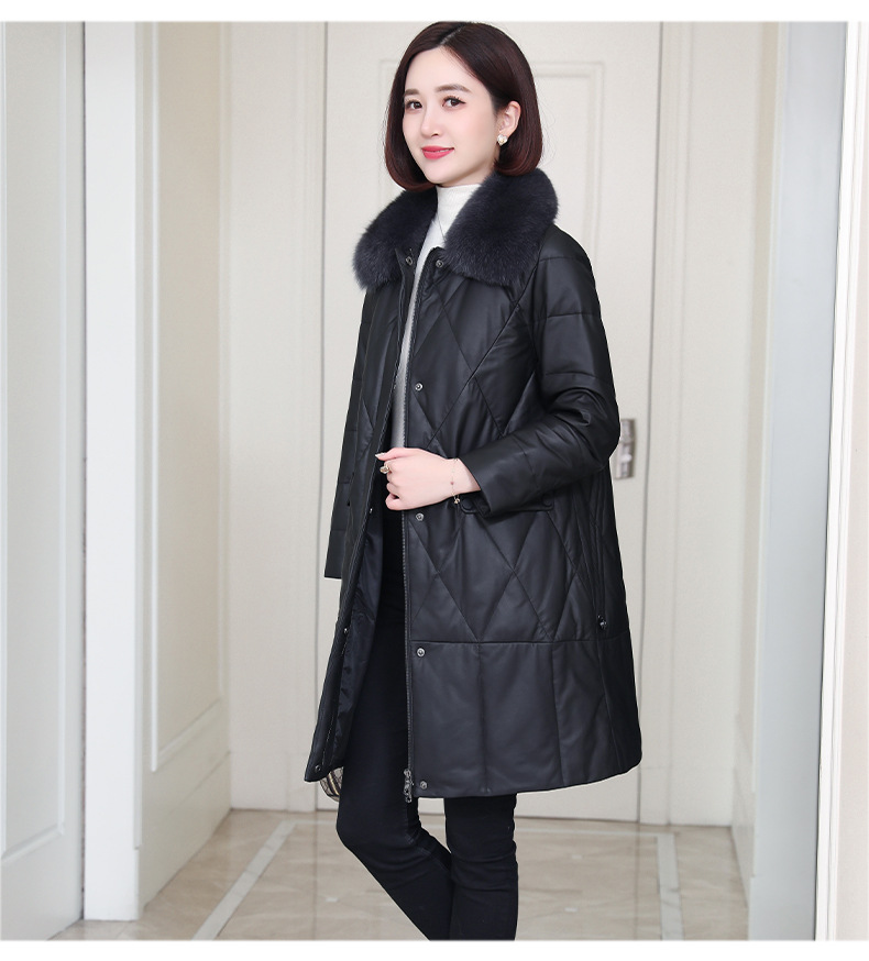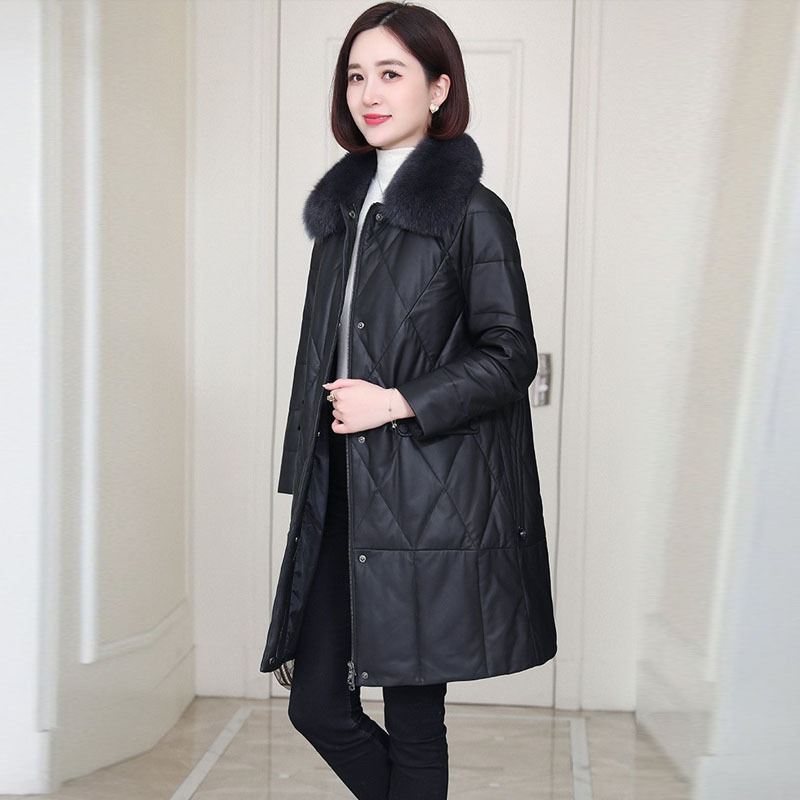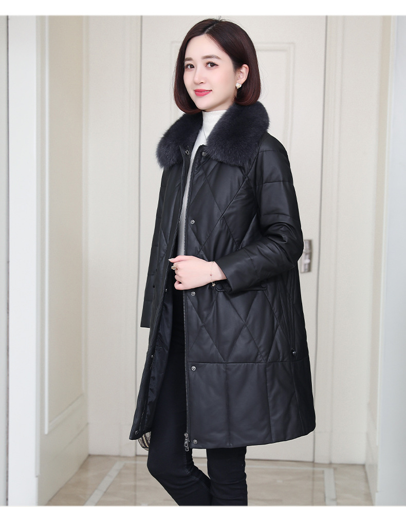 Áo khoác nữ dáng dài, có lớp lót bông giữ ấm và phần cổ viền lông mềm mại. Chất liệu da thật từ động vật mang đến vẻ ngoại hình ấn tượng và độ bền tốt. Kiểu dáng ôn nhẹ giúp tôn dáng người mặc. Sản phẩm phù hợp cho những ngày thời tiết lạnh, dễ dàng phối cùng nhiều loại trang phục khác nhau. Cần giữ sạch và bảo quản nơi khô ráo để sử dụng lâu dài. | Tên sản phẩm: Áo Da Nữ Chất Liệu Da Bò Dày Ấm Hàng Mùa Xuân Thu Đông Trung Niên - Thời Trang Nữ | Mã sản phẩm: B6077 - Giá: 7.310.000đ | Mã nhà sản xuất: HADG-G06Hình ảnh sản phẩm