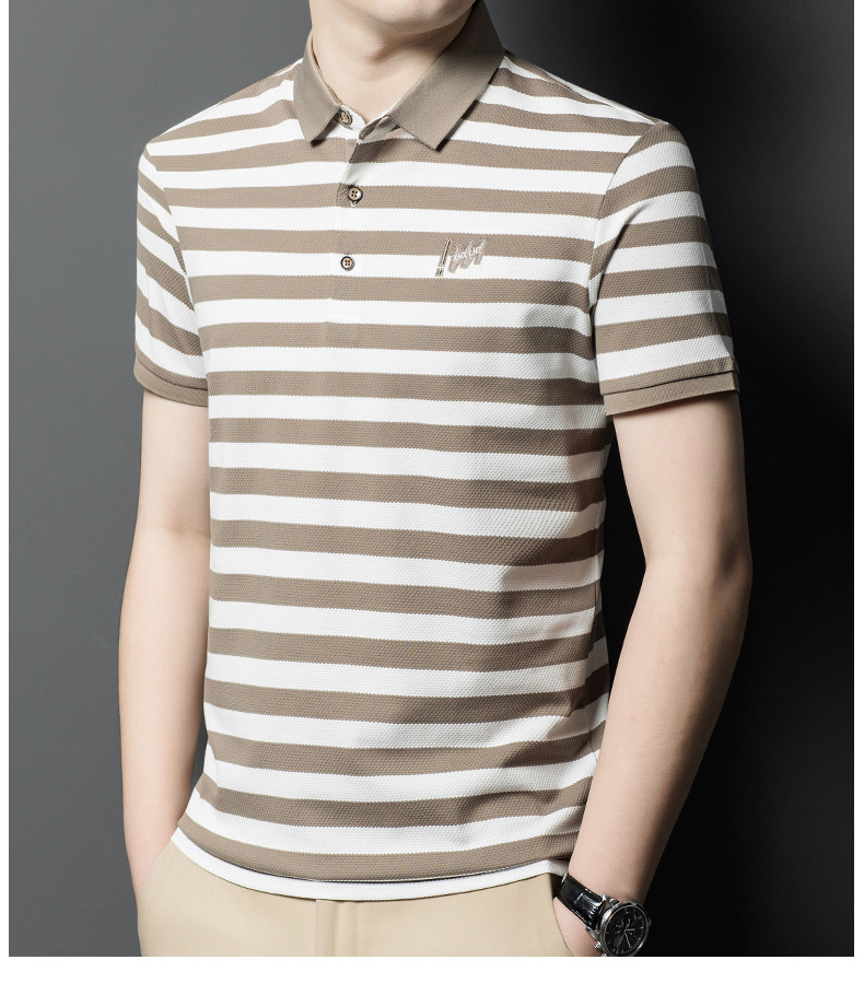 Áo thun ngắn tay dành cho nam với thiết kế cổ bẻ, tạo nên vẻ ngoài lịch sự và thoải mái. Sản phẩm có họa tiết sọc trẻ trung, phù hợp cho mùa hè. Chất vải mỏng nhẹ và thoáng khí, giúp người mặc dễ chịu trong những ngày nóng. Bạn có thể mặc đi làm, đi chơi hay dạo phố đều phù hợp. Dễ dàng phối cùng quần tây hoặc quần jeans để có nhiều phong cách khác nhau. | Tên sản phẩm: Áo Thun Nam Ngắn Tay Kín Cổ Hàng Mùa Hè - Thời Trang Nam | Mã sản phẩm: B6258 - Giá: 770.000đ | Mã nhà sản xuất: JIDG-G02Hình ảnh sản phẩm