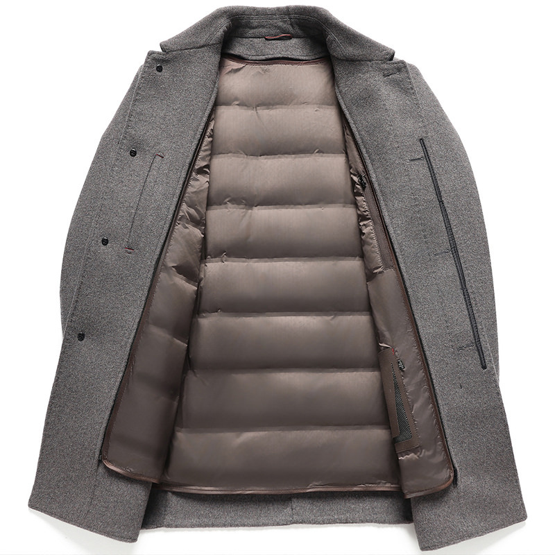 Áo khoác hai mặt dành cho mùa thu đông, thiết kế dáng dài vừa phải. Sản phẩm có cổ bẻ và đặc biệt đi kèm áo lót bằng lông vũ có thể tháo rời, rất tiện lợi. Lớp ngoài làm từ chất liệu len dày dặn, giữ ấm tốt. Có thể mặc riêng áo khoác ngoài hoặc kết hợp với áo lót bên trong tùy theo thời tiết. Phù hợp cho những ngày trời se lạnh hoặc khi nhiệt độ xuống thấp. | Tên sản phẩm: Áo Khoác Nam Dày Ấm Hàng Mùa Xuân Thu Đông Trung Niên - Thời Trang Nam | Mã sản phẩm: B6276 - Giá: 2.680.000đ | Mã nhà sản xuất: SUDAP-G06Hình ảnh sản phẩm