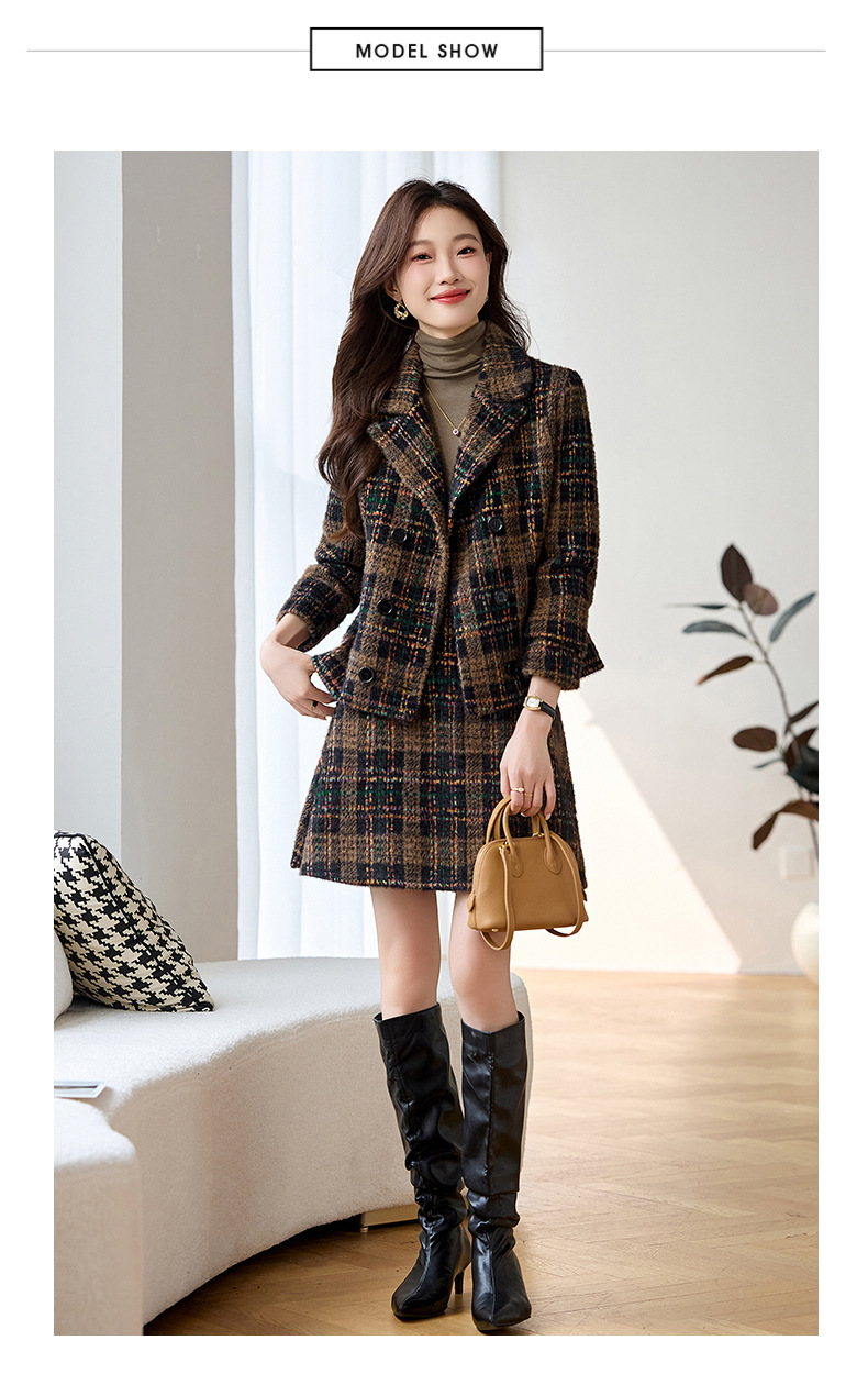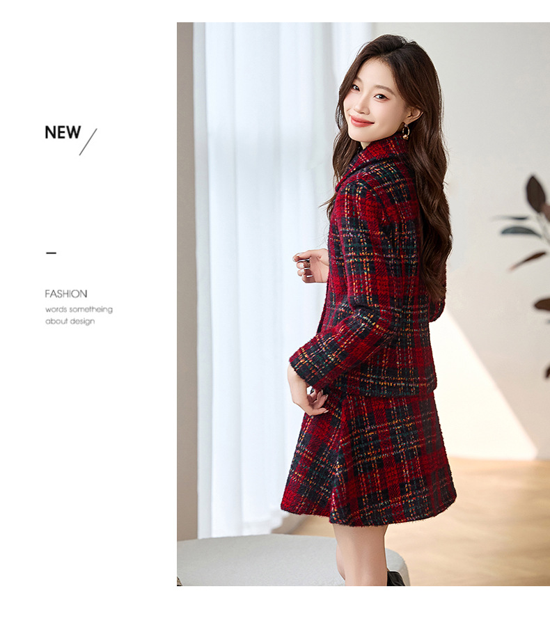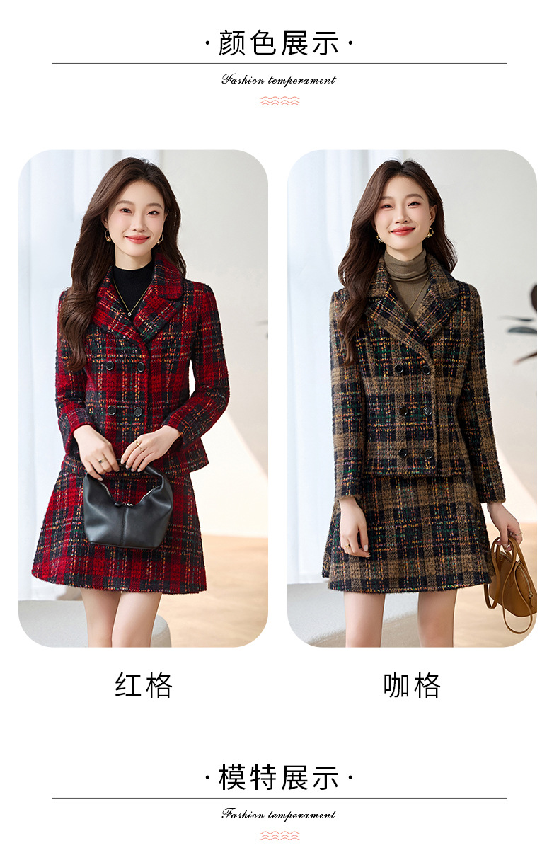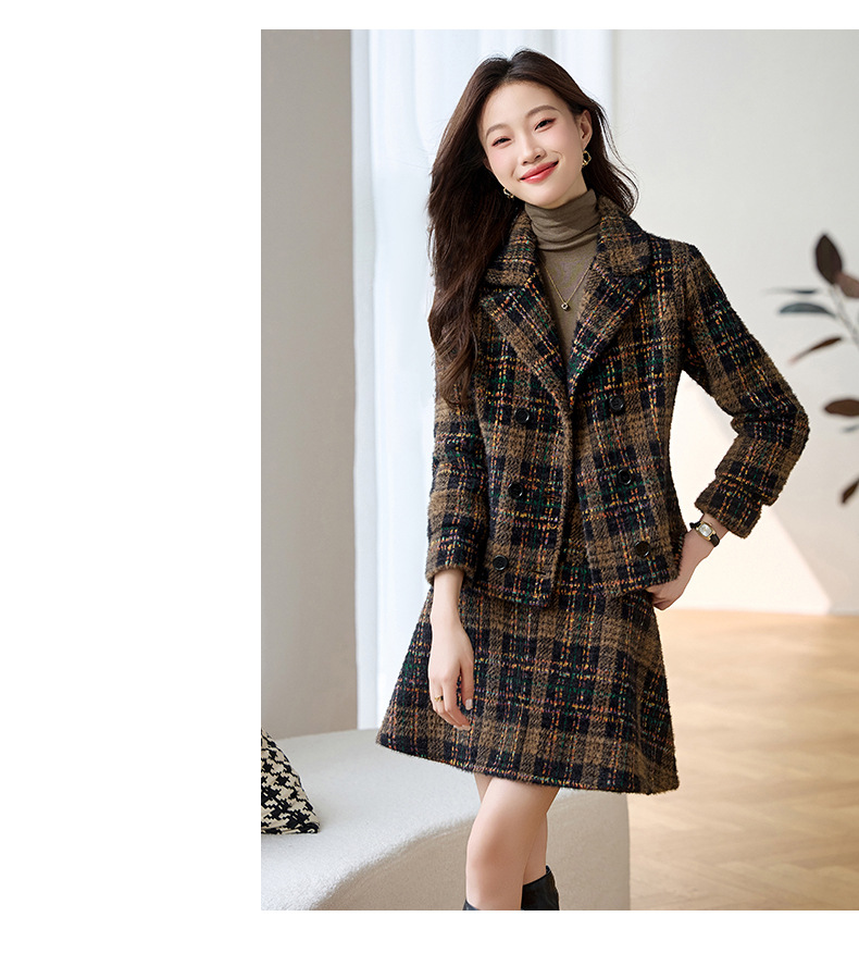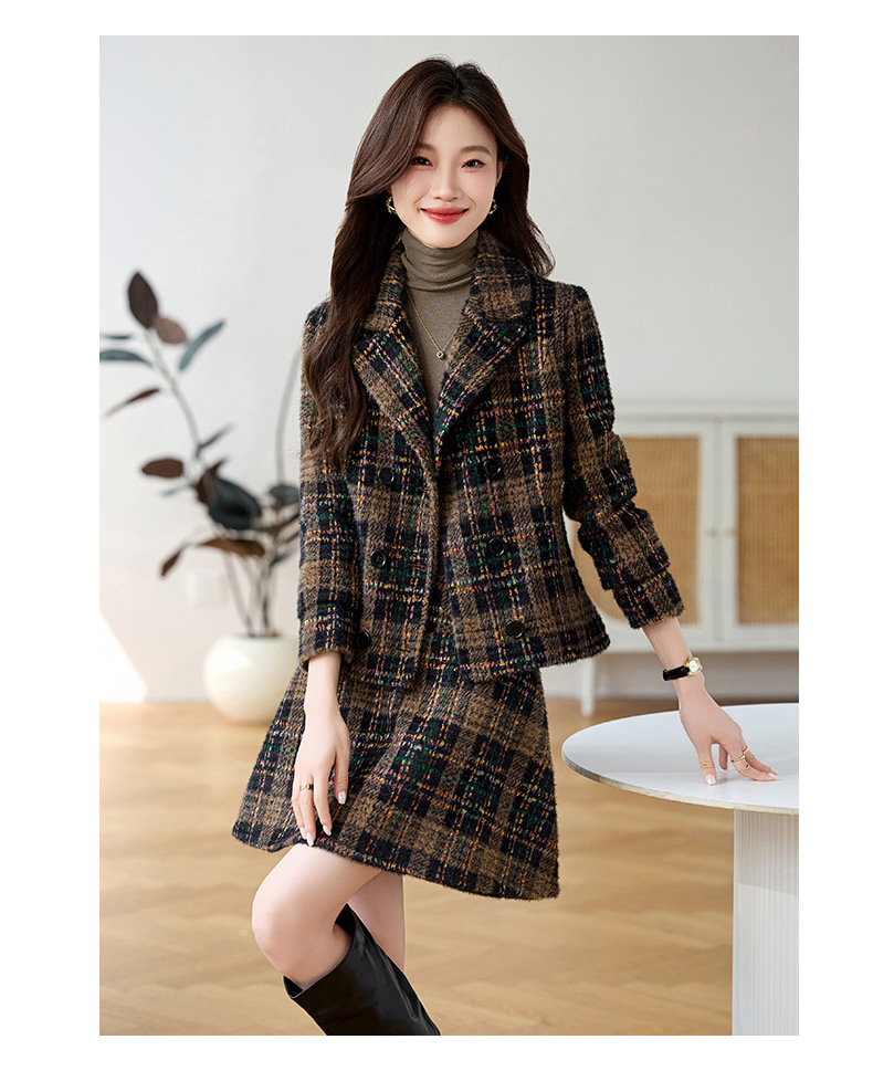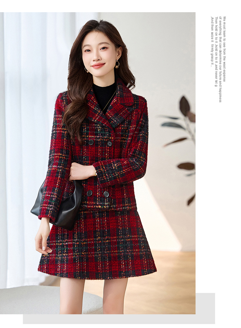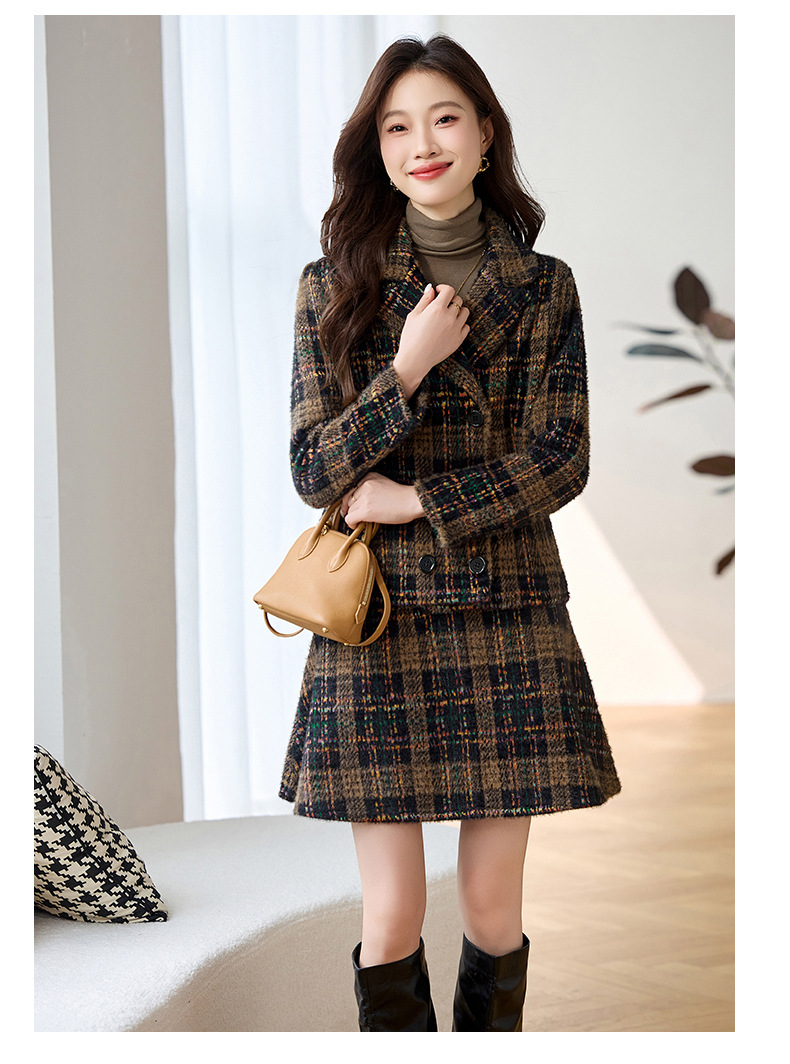 Bộ trang phục hai mảnh này có họa tiết kẻ ô cổ điển, phù hợp cho mùa thu đông. Áo khoác dáng dài có cổ bẻ, hàng cúc đôi và được lót bông ấm áp, đi kèm là chiếc nơ thắt eo tạo điểm nhấn. Váy xòe ngang gối mang đến vẻ nữ tính. Chất vải dày dặn giữ nhiệt tốt. Có thể mặc nguyên bộ để đồng bộ, hoặc phối áo với quần jeans và váy với áo len để đa dạng phong cách. | Tên sản phẩm: Áo Khoác Nữ Chất Liệu Vải Bông Cả Bộ 2 Món Kẻ Caro Kín Cổ Hàng Mùa Xuân Thu Đông - Thời Trang Nữ | Mã sản phẩm: B6412 - Giá: 2.130.000đ | Mã nhà sản xuất: HADG-G05Hình ảnh sản phẩm