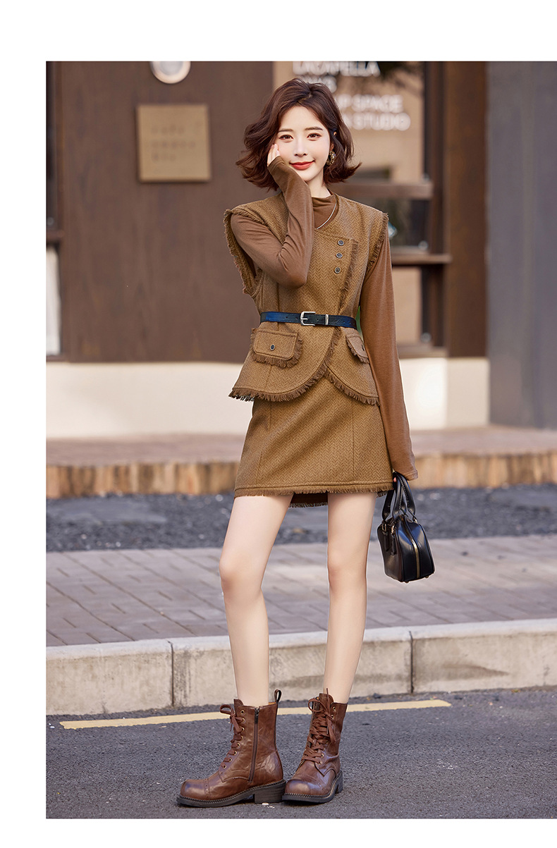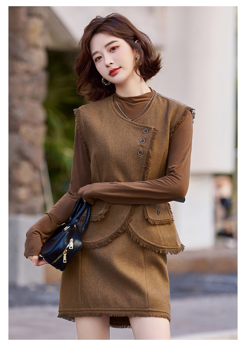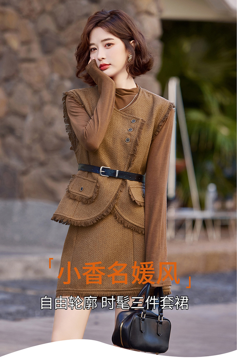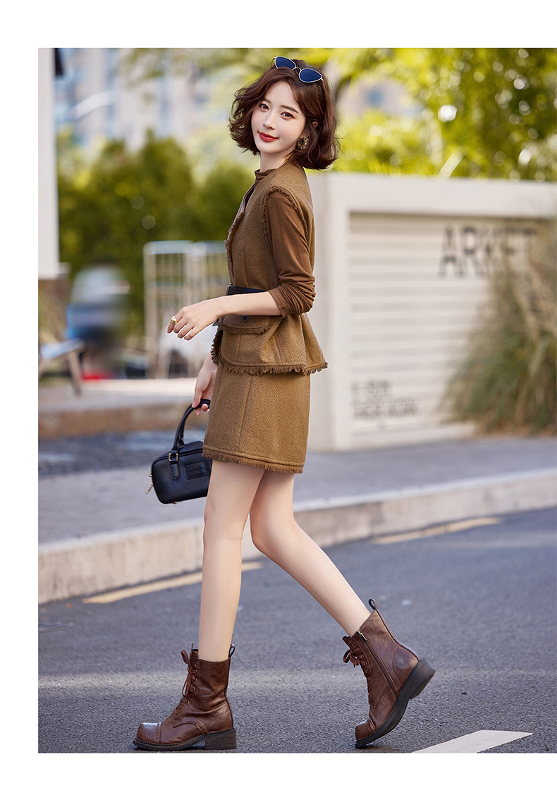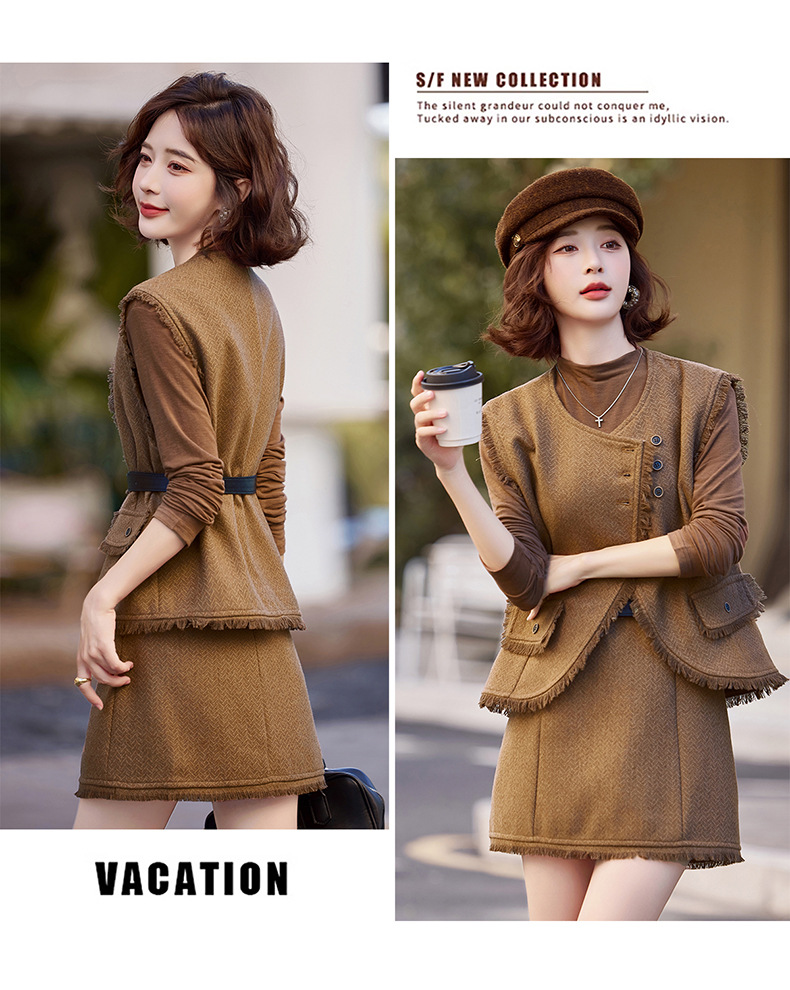 Bộ trang phục ba món này gồm áo dài tay, áo khoác dạng vét có diềm tua rua và chân váy. Chất liệu vải mềm mại, tạo cảm giác dễ chịu khi mặc. Kiểu dáng mang phong cách nhẹ nhàng, phù hợp cho tiết trời mùa thu. Có thể mặc nguyên bộ để tạo sự chỉn chu, hoặc phối cùng các trang phục khác linh hoạt cho nhiều dịp. Phù hợp khi đi làm, gặp gỡ bạn bè hay dạo phố. | Tên sản phẩm: Áo Khoác Nữ Dài Tay Cả Bộ 3 Món Hàng Mùa Xuân Thu Đông - Thời Trang Nữ | Mã sản phẩm: B6822 - Giá: 1.900.000đ | Mã nhà sản xuất: HADG-G05Hình ảnh sản phẩm