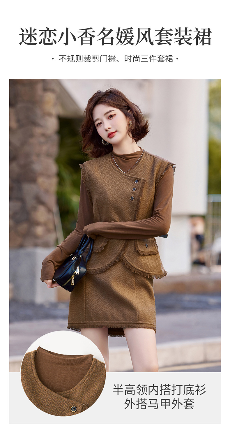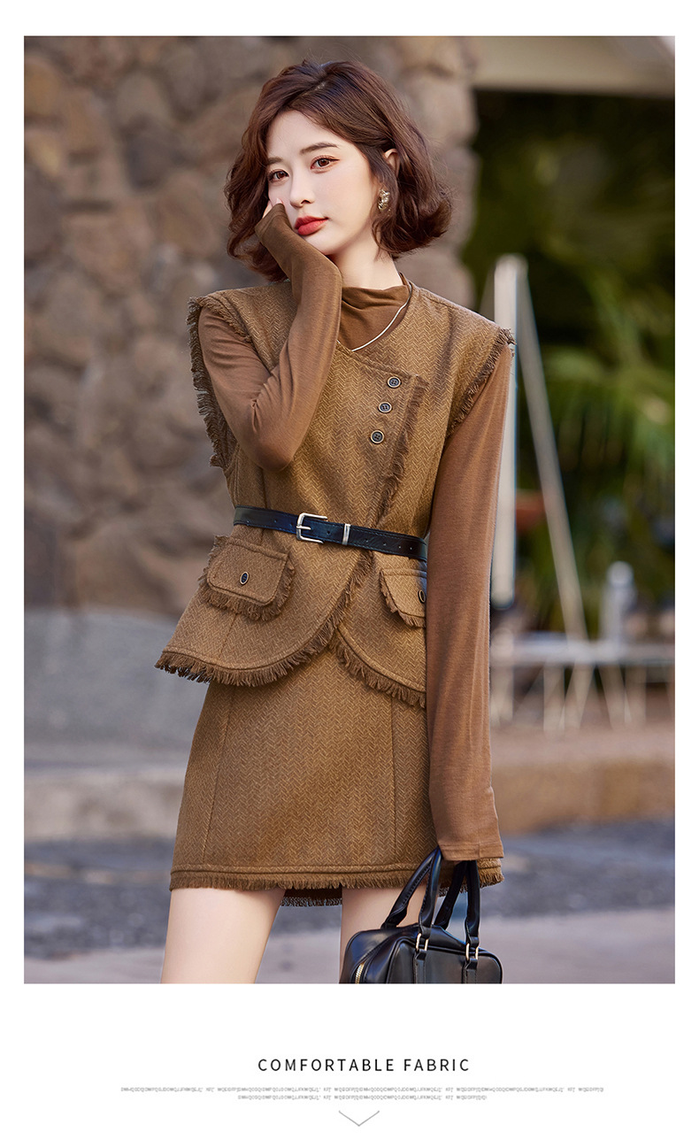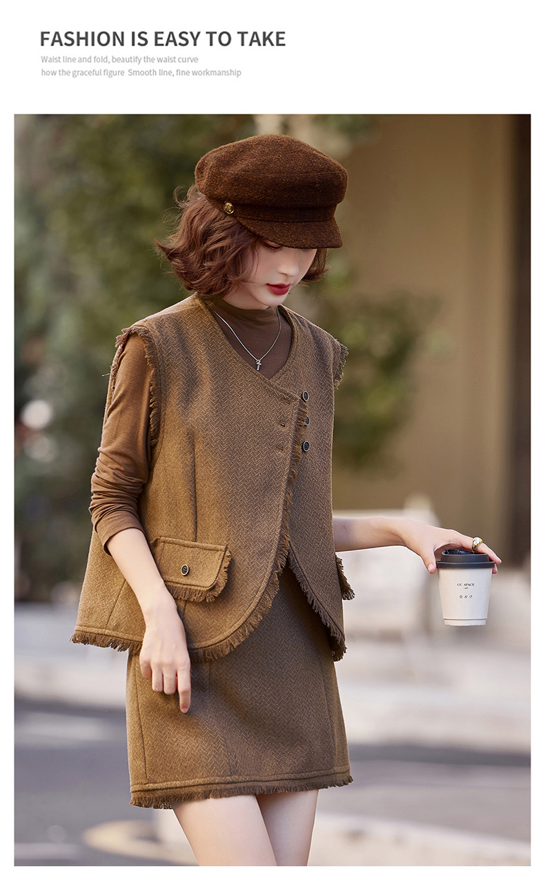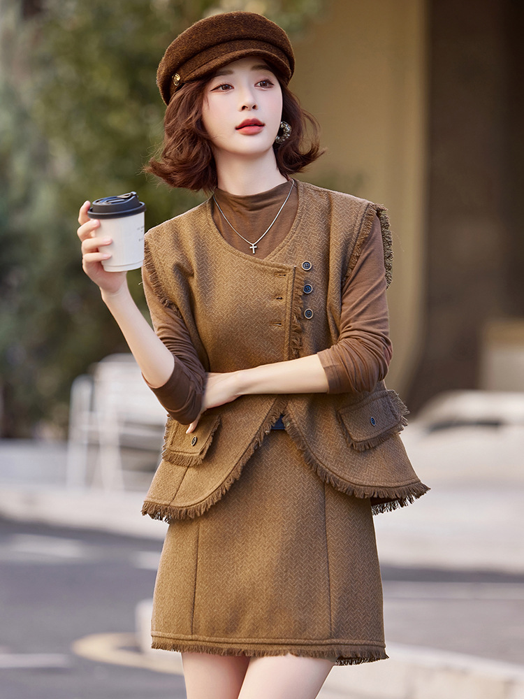 Bộ trang phục ba món này gồm áo dài tay, áo khoác dạng vét có diềm tua rua và chân váy. Chất liệu vải mềm mại, tạo cảm giác dễ chịu khi mặc. Kiểu dáng mang phong cách nhẹ nhàng, phù hợp cho tiết trời mùa thu. Có thể mặc nguyên bộ để tạo sự chỉn chu, hoặc phối cùng các trang phục khác linh hoạt cho nhiều dịp. Phù hợp khi đi làm, gặp gỡ bạn bè hay dạo phố. | Tên sản phẩm: Áo Khoác Nữ Dài Tay Cả Bộ 3 Món Hàng Mùa Xuân Thu Đông - Thời Trang Nữ | Mã sản phẩm: B6822 - Giá: 1.900.000đ | Mã nhà sản xuất: HADG-G05Hình ảnh sản phẩm