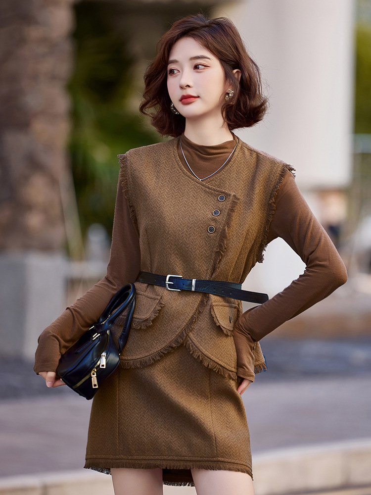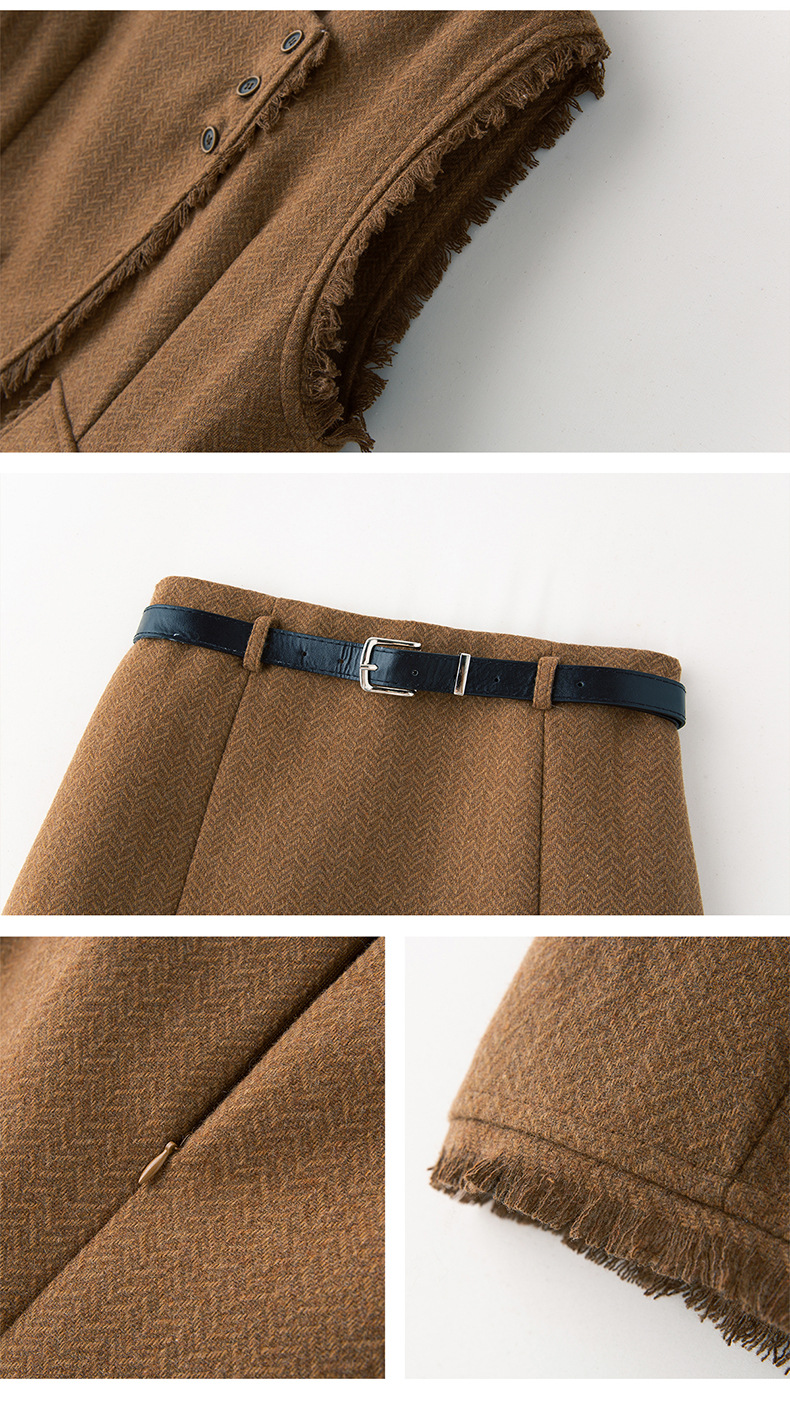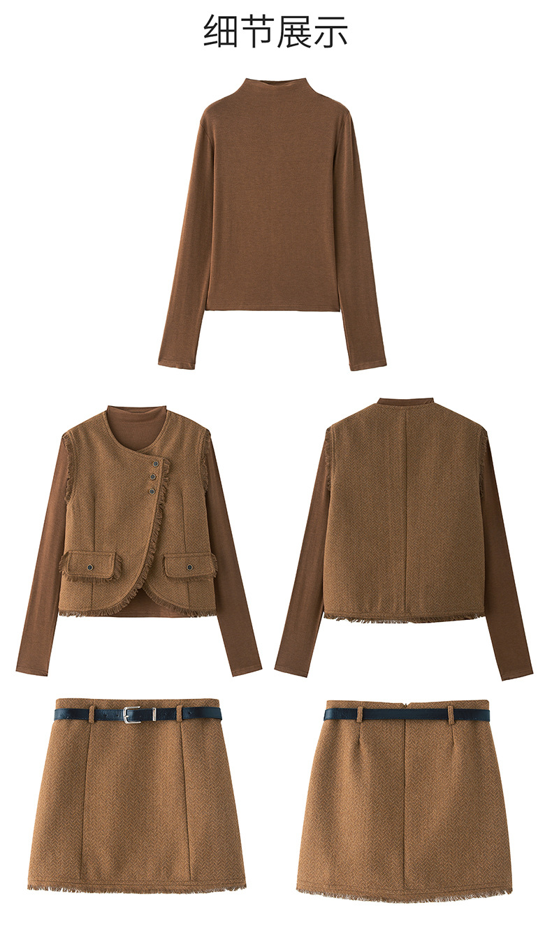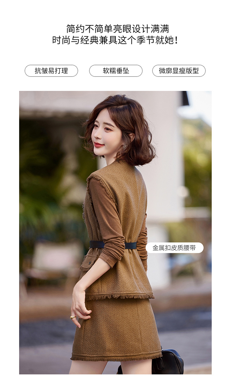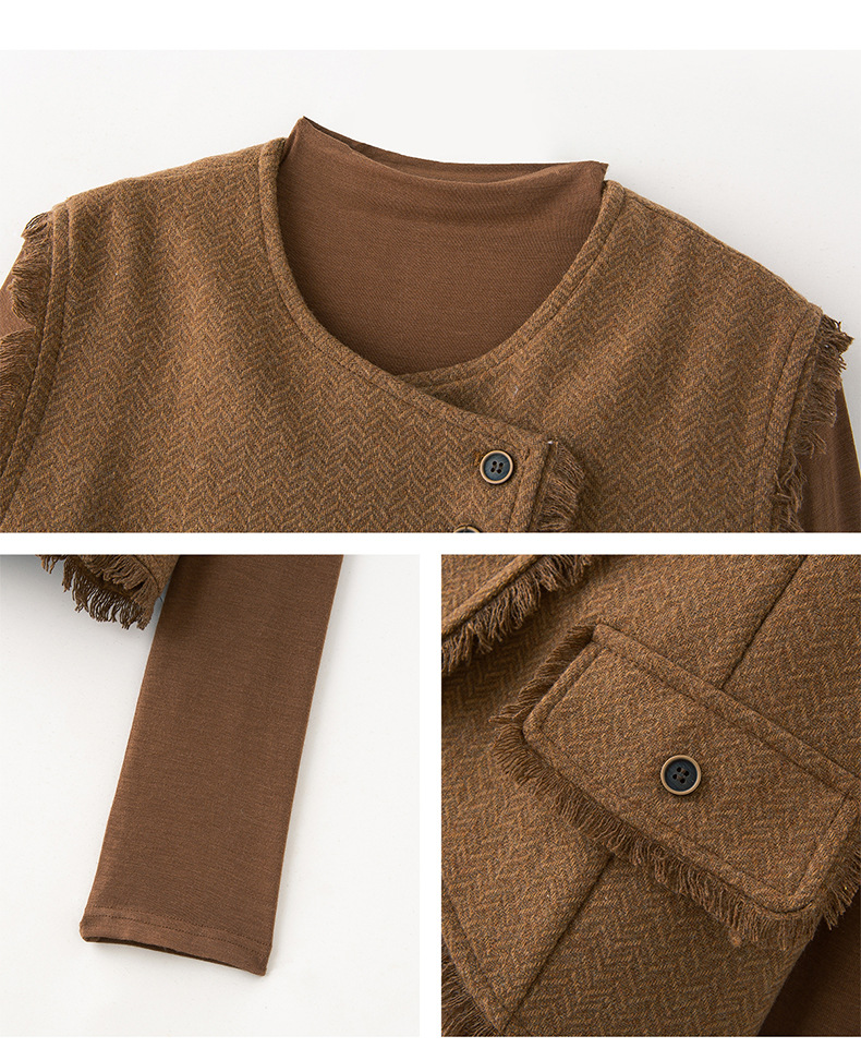 Bộ trang phục ba món này gồm áo dài tay, áo khoác dạng vét có diềm tua rua và chân váy. Chất liệu vải mềm mại, tạo cảm giác dễ chịu khi mặc. Kiểu dáng mang phong cách nhẹ nhàng, phù hợp cho tiết trời mùa thu. Có thể mặc nguyên bộ để tạo sự chỉn chu, hoặc phối cùng các trang phục khác linh hoạt cho nhiều dịp. Phù hợp khi đi làm, gặp gỡ bạn bè hay dạo phố. | Tên sản phẩm: Áo Khoác Nữ Dài Tay Cả Bộ 3 Món Hàng Mùa Xuân Thu Đông - Thời Trang Nữ | Mã sản phẩm: B6822 - Giá: 1.900.000đ | Mã nhà sản xuất: HADG-G05Hình ảnh sản phẩm