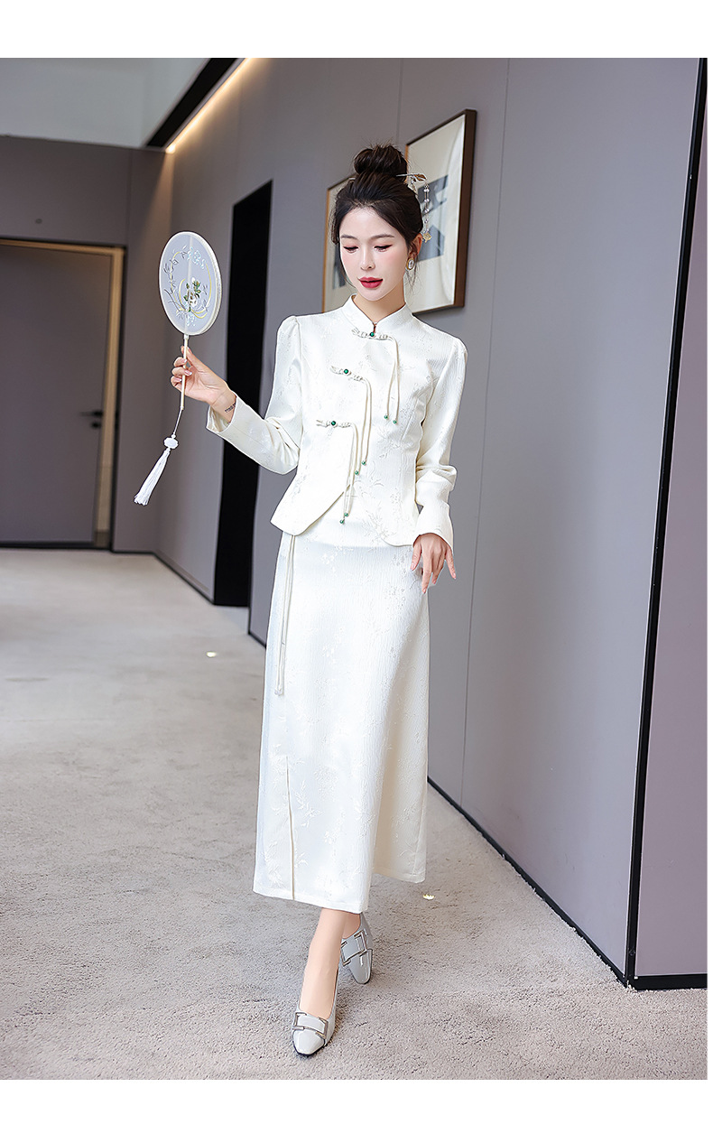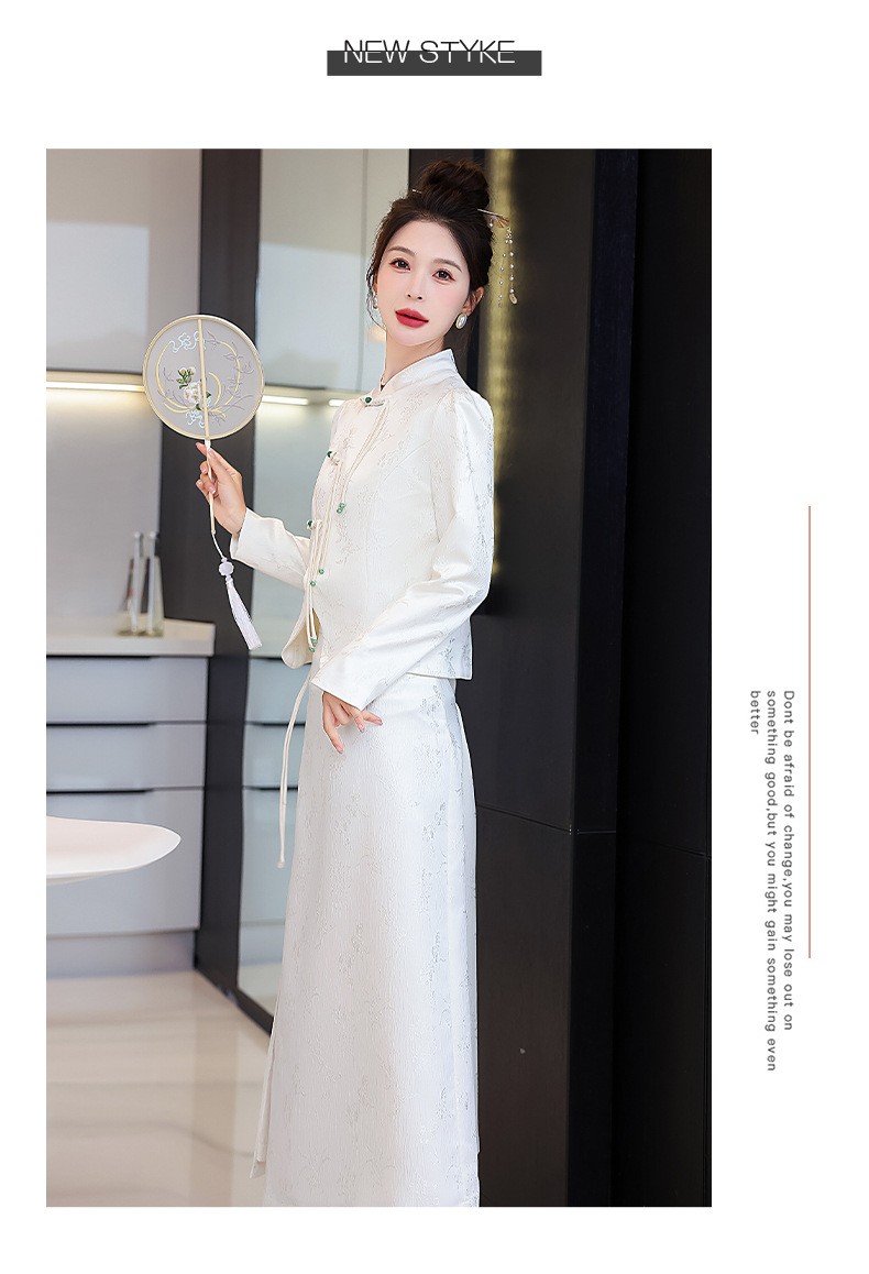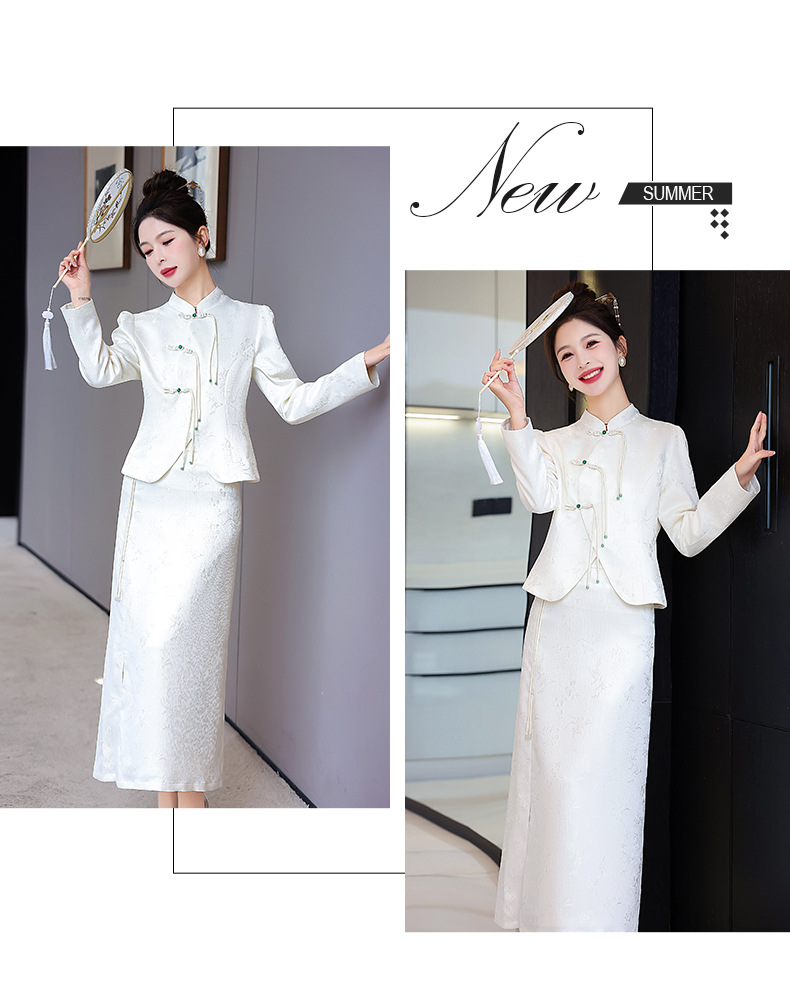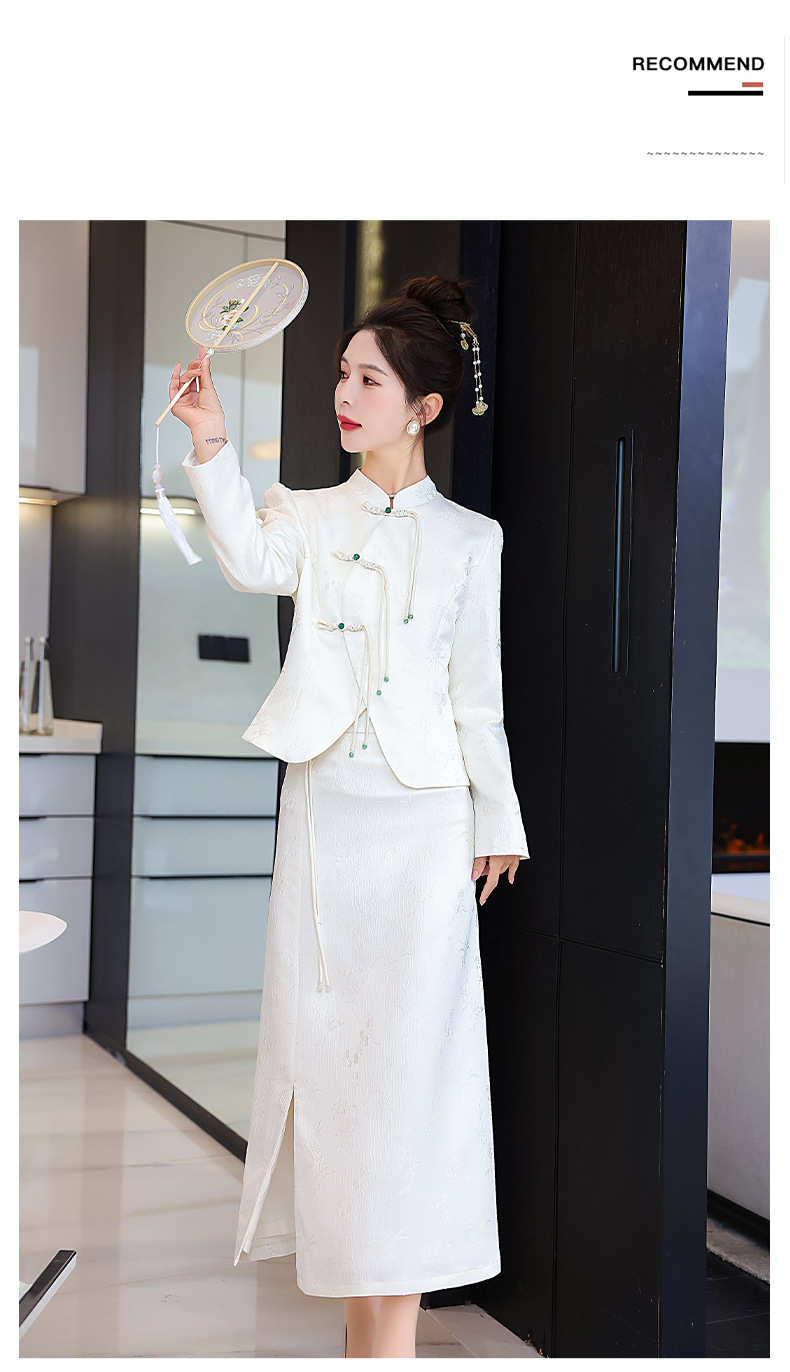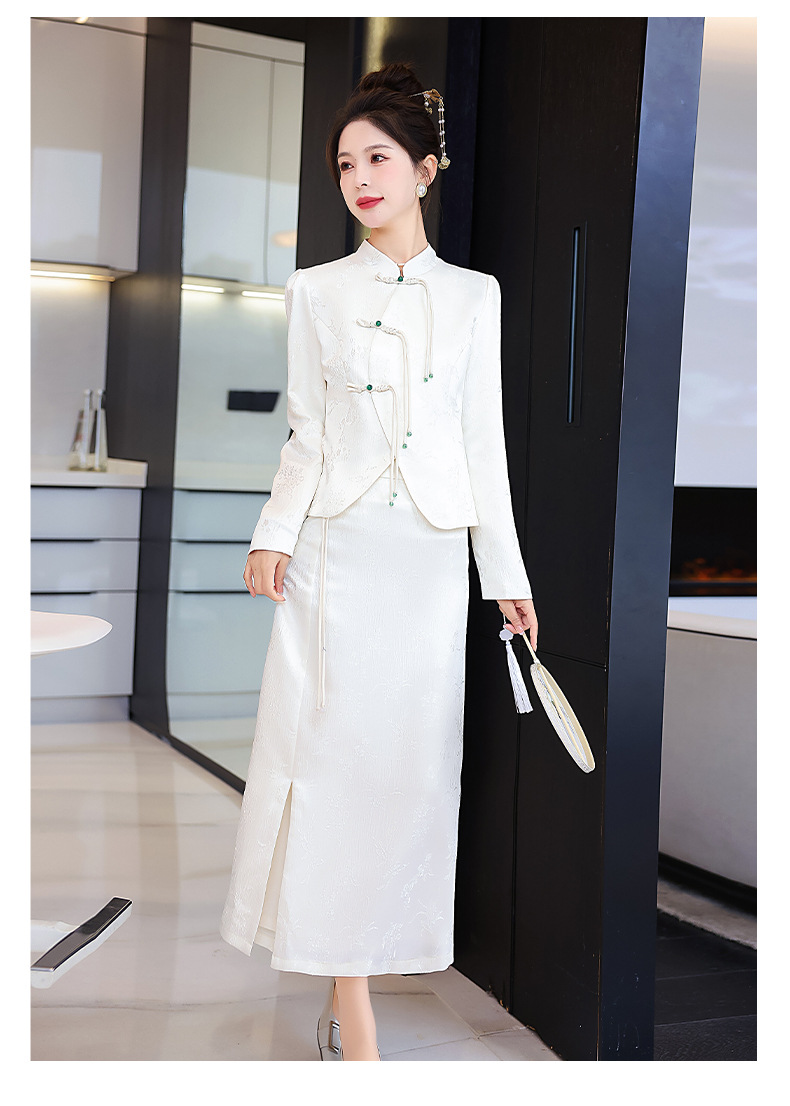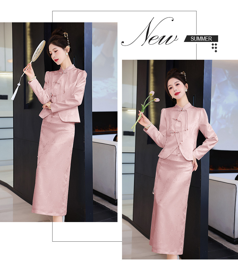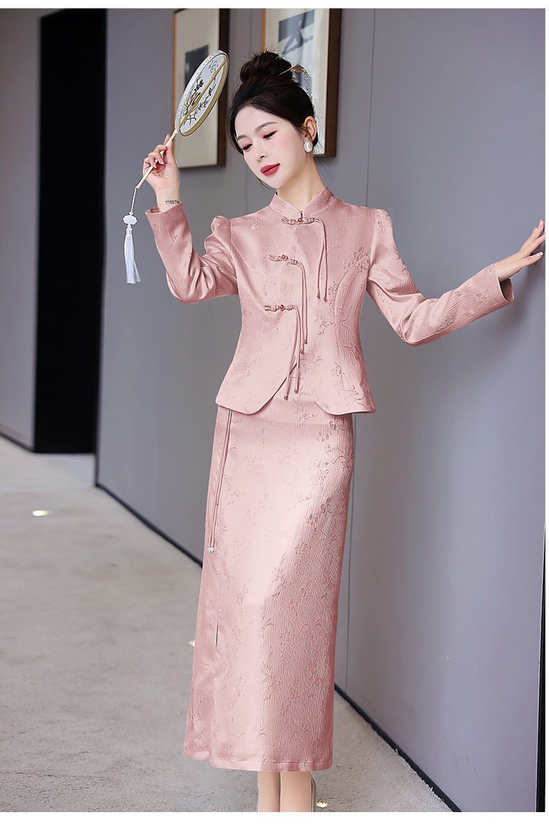 Bộ trang phục thời trang này gồm áo khoác và chân váy, phù hợp cho thời tiết mùa xuân và mùa thu. Áo được điểm xuyến bằng nút thắt truyền thống, kết hợp họa tiết dệt nổi tinh tế trên chất vải. Chân váy dáng dài tôn lên vẻ duyên dáng. Bộ trang phục này thích hợp để mặc trong những dịp gặp gỡ bạn bè, dạo phố hay các buổi hẹn thường ngày. Bạn có thể phối cùng áo thun bên trong và giày dép thoải mái để tạo nên một phong cách riêng. | Tên sản phẩm: Áo Khoác Nữ Họa Tiết Hoa Hàng Mùa Xuân Thu Đông - Thời Trang Nữ | Mã sản phẩm: B6863 - Giá: 1.810.000đ | Mã nhà sản xuất: HADG-G05Hình ảnh sản phẩm
