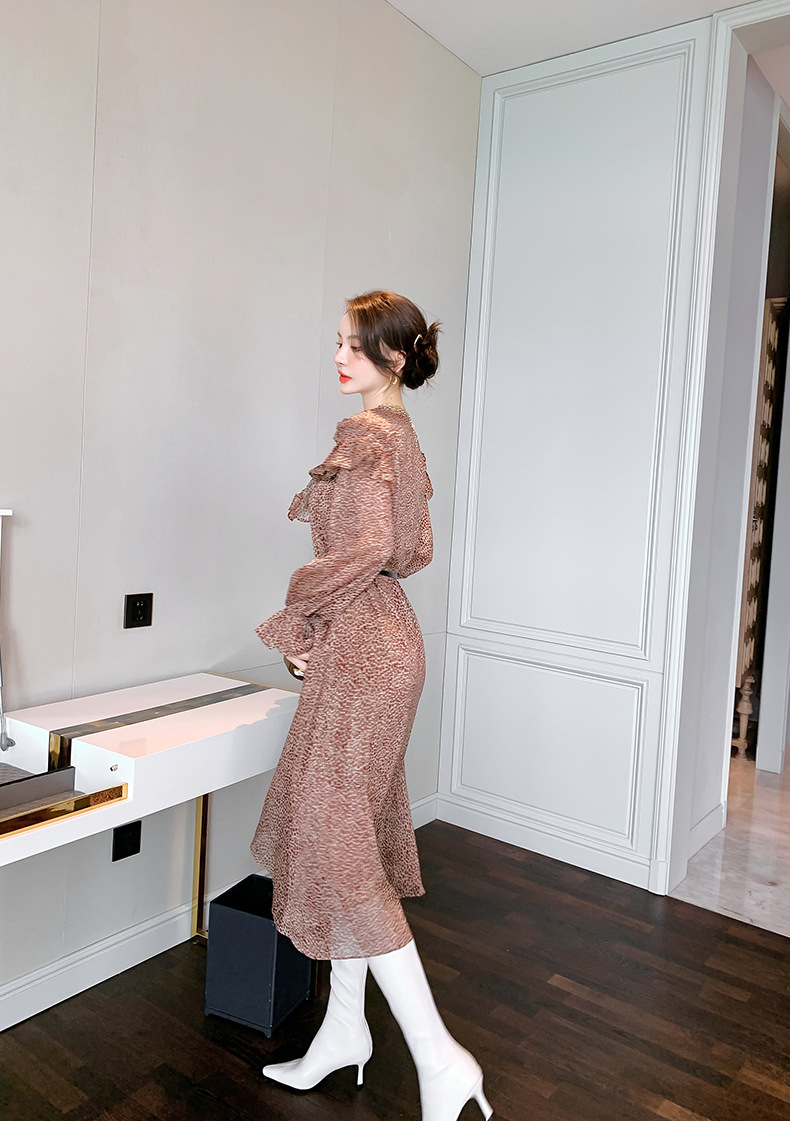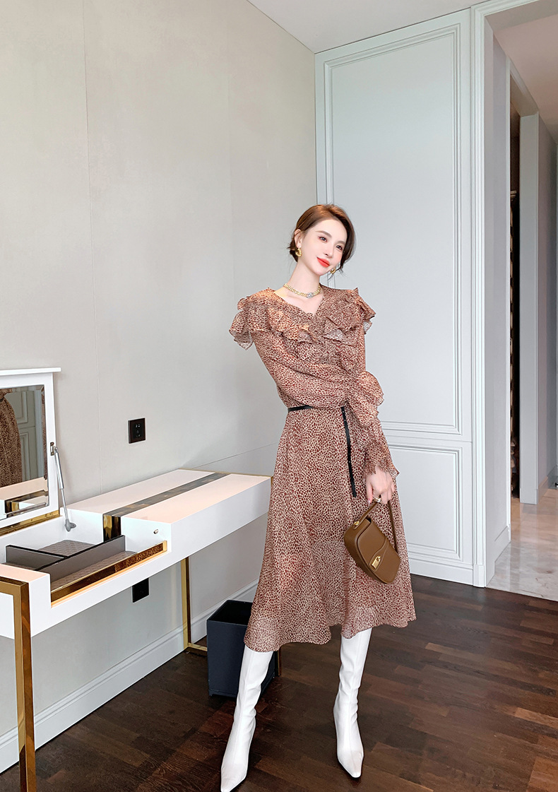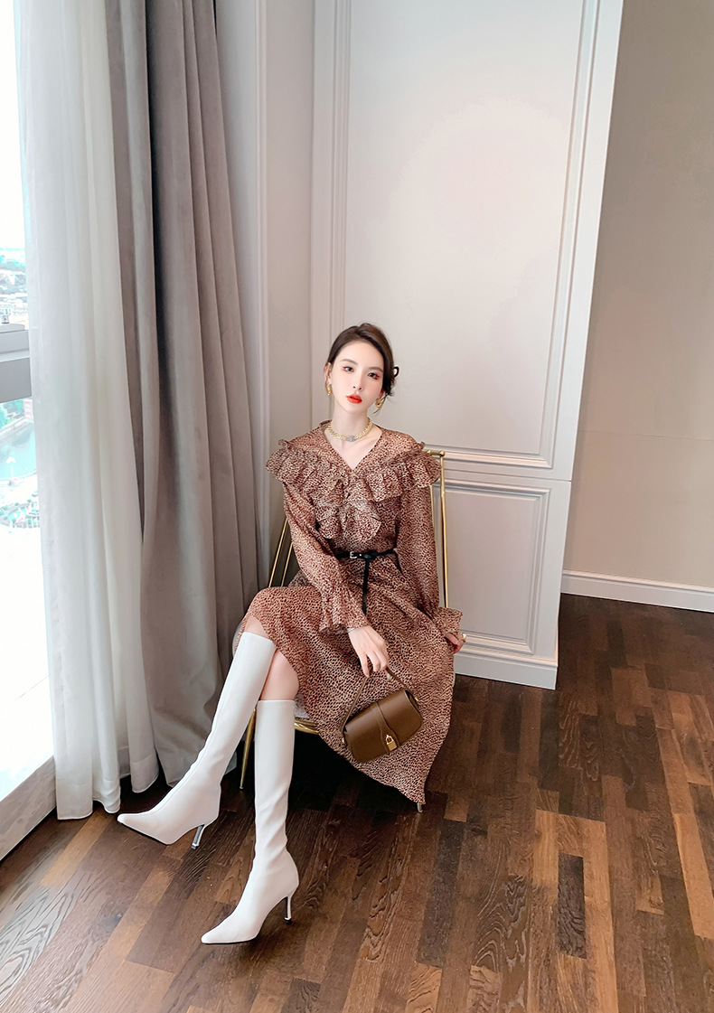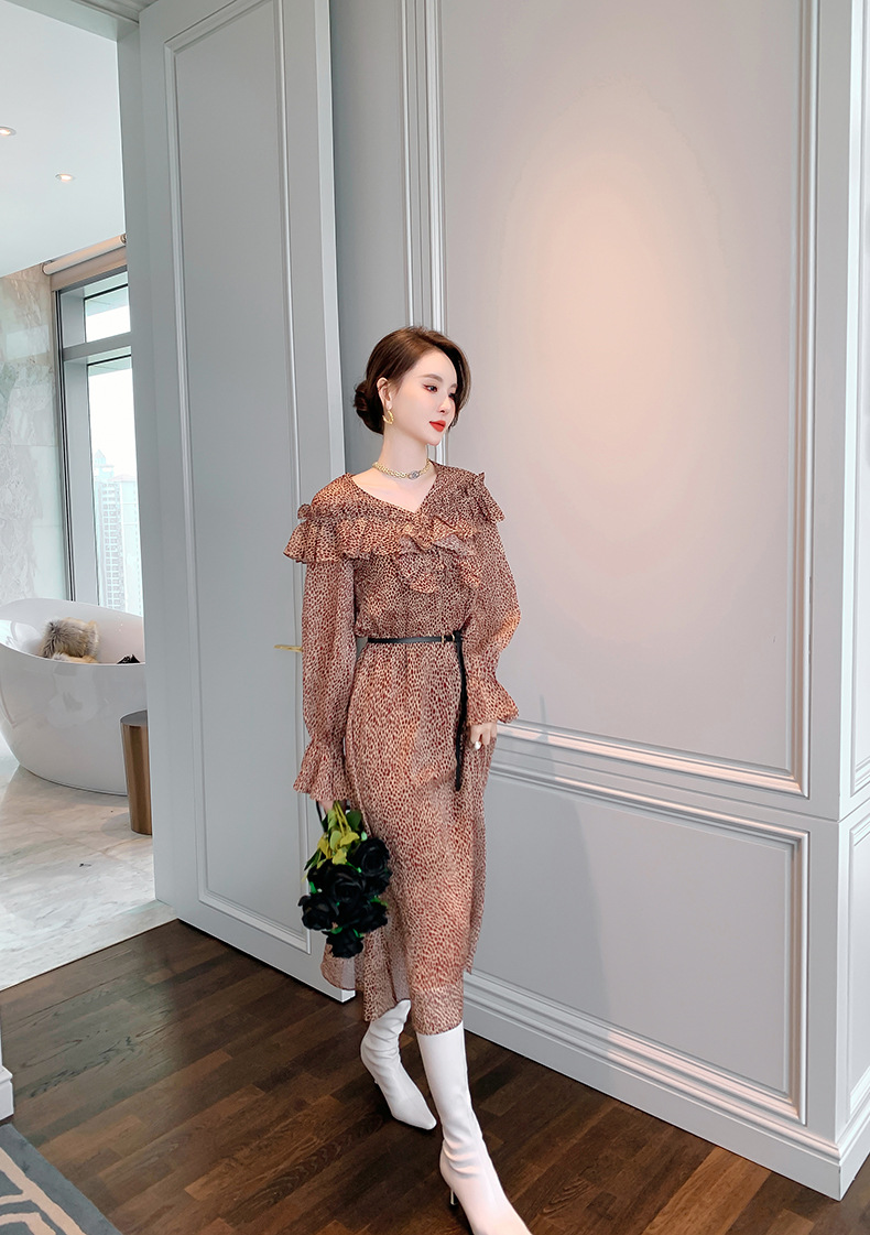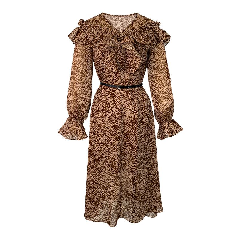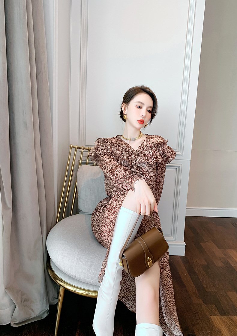 Chiếc đầm tay dài này có họa tiết da thú rất thời thượng. Điểm nhấn đặc biệt là phần cổ áo và tay áo được cách điệu như những chiếc lá sen, tạo nên nét duyên dáng và mềm mại. Chất vải mỏng nhẹ, thoáng mát giúp bạn dễ dàng vận động. Kiểu dáng không đối xứng ở phần váy mang đến vẻ ngoài trẻ trung, năng động. Sản phẩm phù hợp để mặc đi làm, đi chơi hoặc dự các buổi gặp mặt. | Tên sản phẩm: Váy Đầm Liền Thân Nữ Chất Liệu Vải Voan Dài Tay Hàng Mùa Xuân Thu Đông - Thời Trang Nữ | Mã sản phẩm: B6933 - Giá: 1.280.000đ | Mã nhà sản xuất: CHDG-G04Hình ảnh sản phẩm