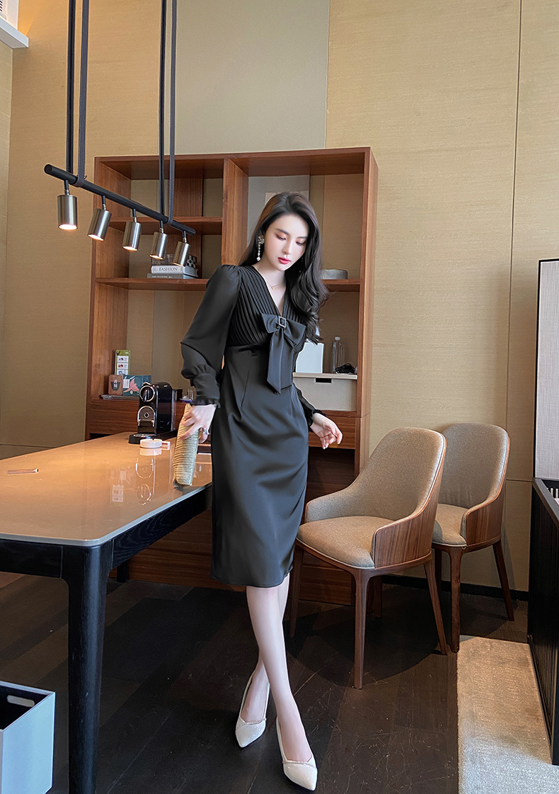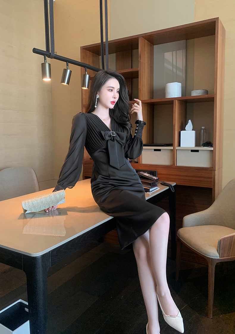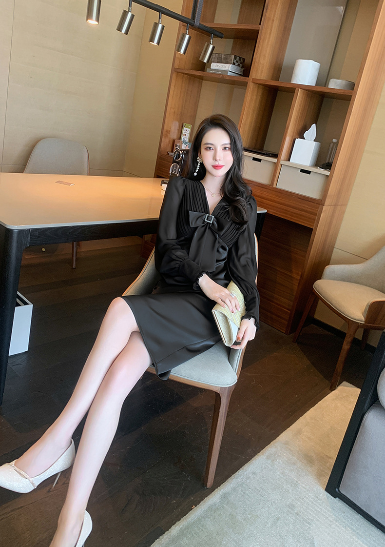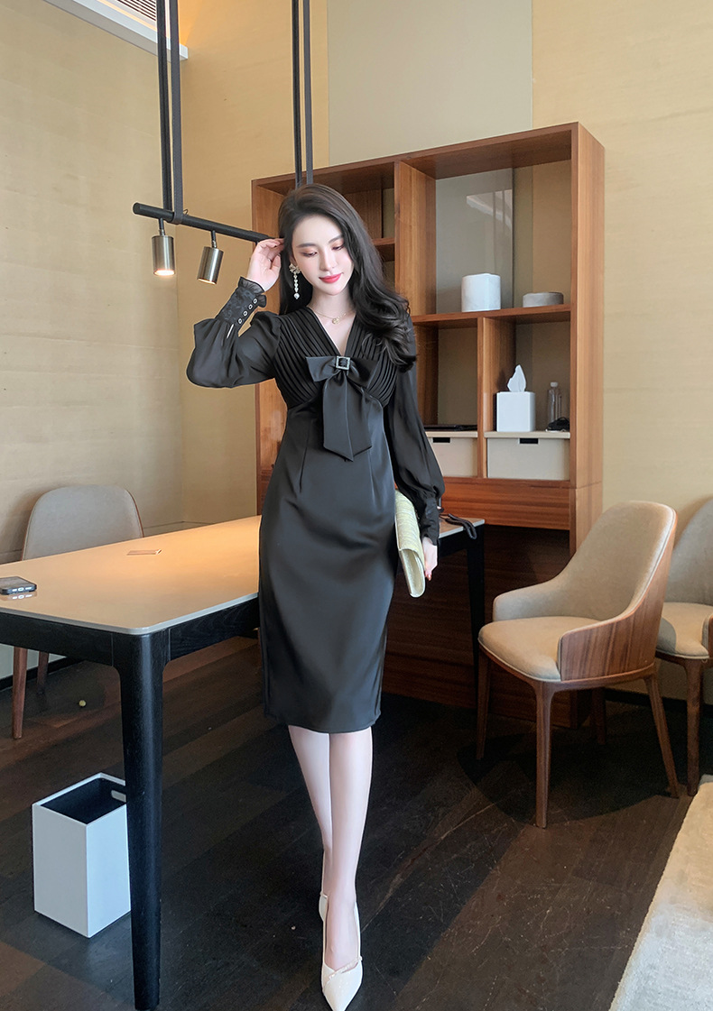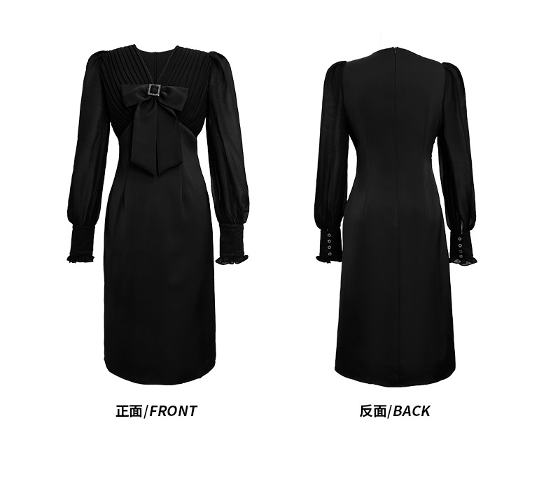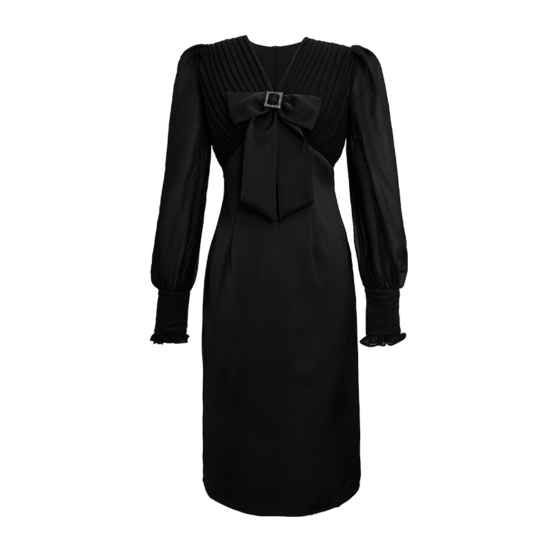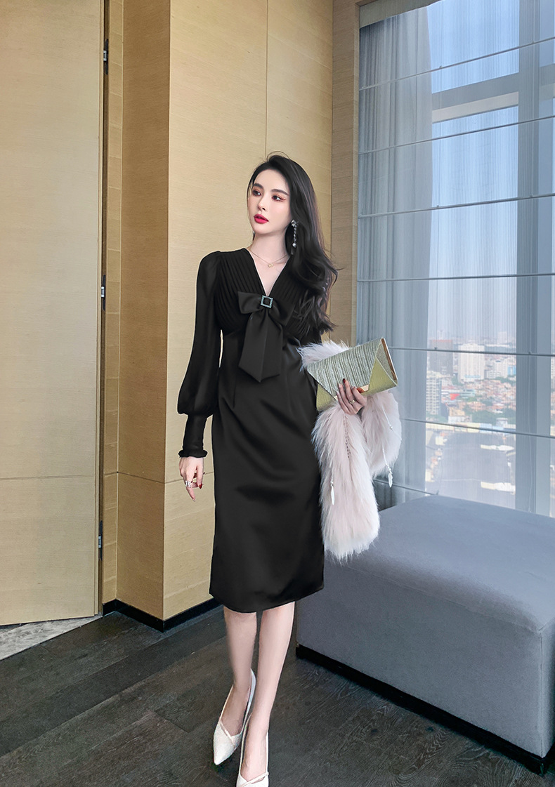 Chiếc đầm dạ hội màu đen mang phong cách thanh lịch, lấy cảm hứng từ những thiết kế cổ điển. Cổ chữ V tạo điểm nhấn tinh tế, kết hợp cùng nơ thắt eo giúp tôn lên đường cong cơ thể. Tay dài và thiết kế ôm vừa vặn phù hợp cho tiết trời thu. Chất vải dày dặn, có độ rũ nhẹ. Sản phẩm phù hợp mặc trong các buổi tiệc hoặc sự kiện. | Tên sản phẩm: Váy Đầm Liền Thân Nữ Thắt Nơ Bướm Dài Tay Cổ Chữ V Trông Trẻ Hơn Tuổi Hàng Mùa Xuân Thu Đông - Thời Trang Nữ | Mã sản phẩm: B7002 - Giá: 1.190.000đ | Mã nhà sản xuất: CHDG-G04Hình ảnh sản phẩm