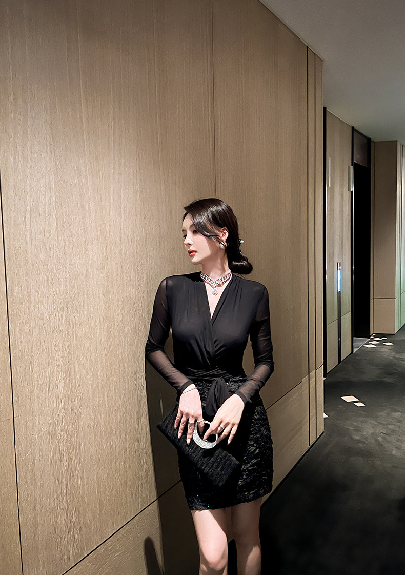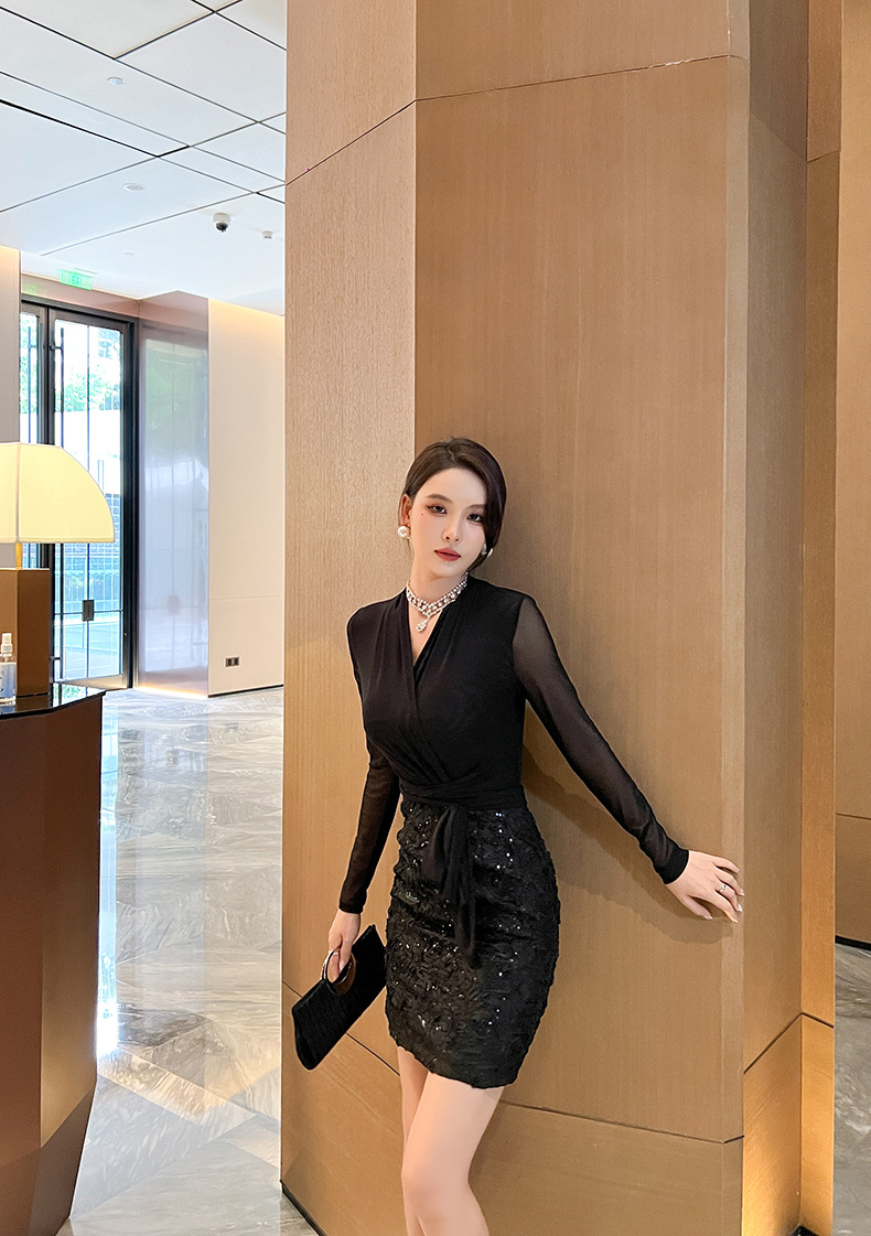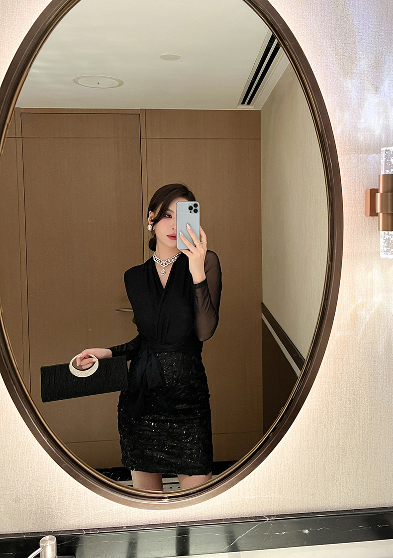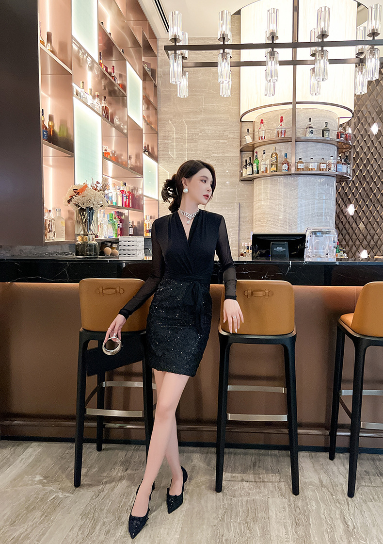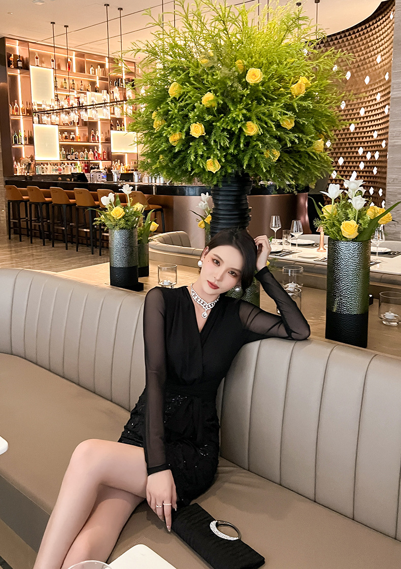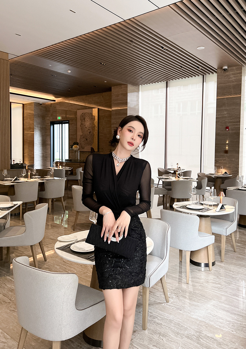 Đầm thiết kế hai lớp tạo kiểu dáng như đang mặc hai món riêng biệt. Cổ chữ V nhẹ nhàng kết hợp phần tay và thân trên bằng vải mỏng có họa tiết hoa nổi. Thân dưới điểm xuyết những chi tiết ánh sáng lấp lánh tinh tế. Sản phẩm phù hợp cho những buổi gặp mặt hoặc dạo phố. Giặt tay và phơi trong bóng mát để giữ form vải và độ bền màu. | Tên sản phẩm: Váy Đầm Liền Thân Nữ Lưới Mỏng Cả Bộ 2 Món Họa Tiết Hoa Cổ Chữ V Hàng Mùa Xuân Thu Đông - Thời Trang Nữ | Mã sản phẩm: B7152 - Giá: 1.120.000đ | Mã nhà sản xuất: CHDG-G04Hình ảnh sản phẩm