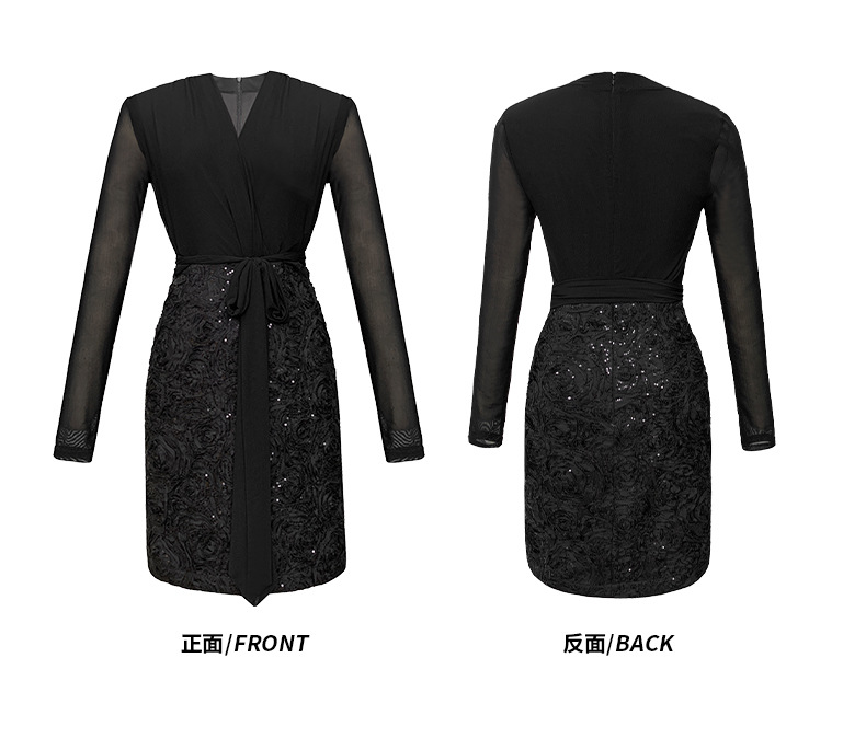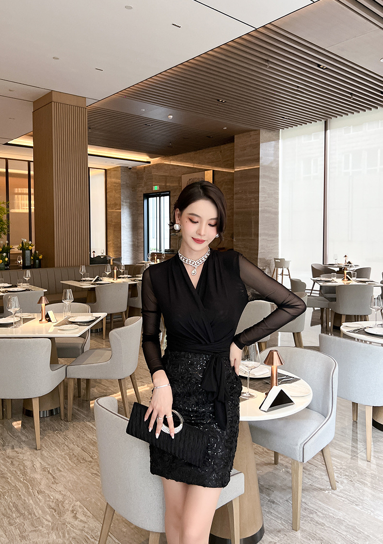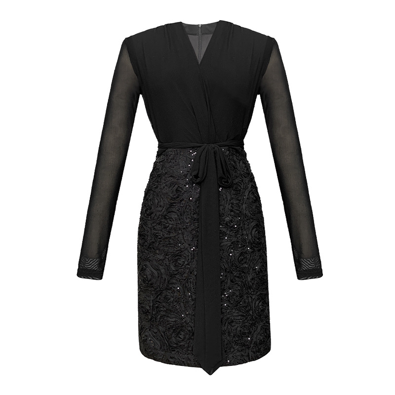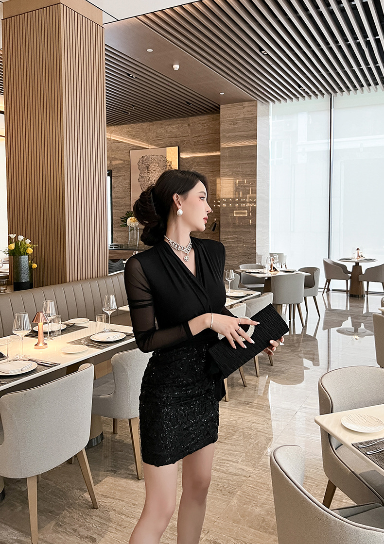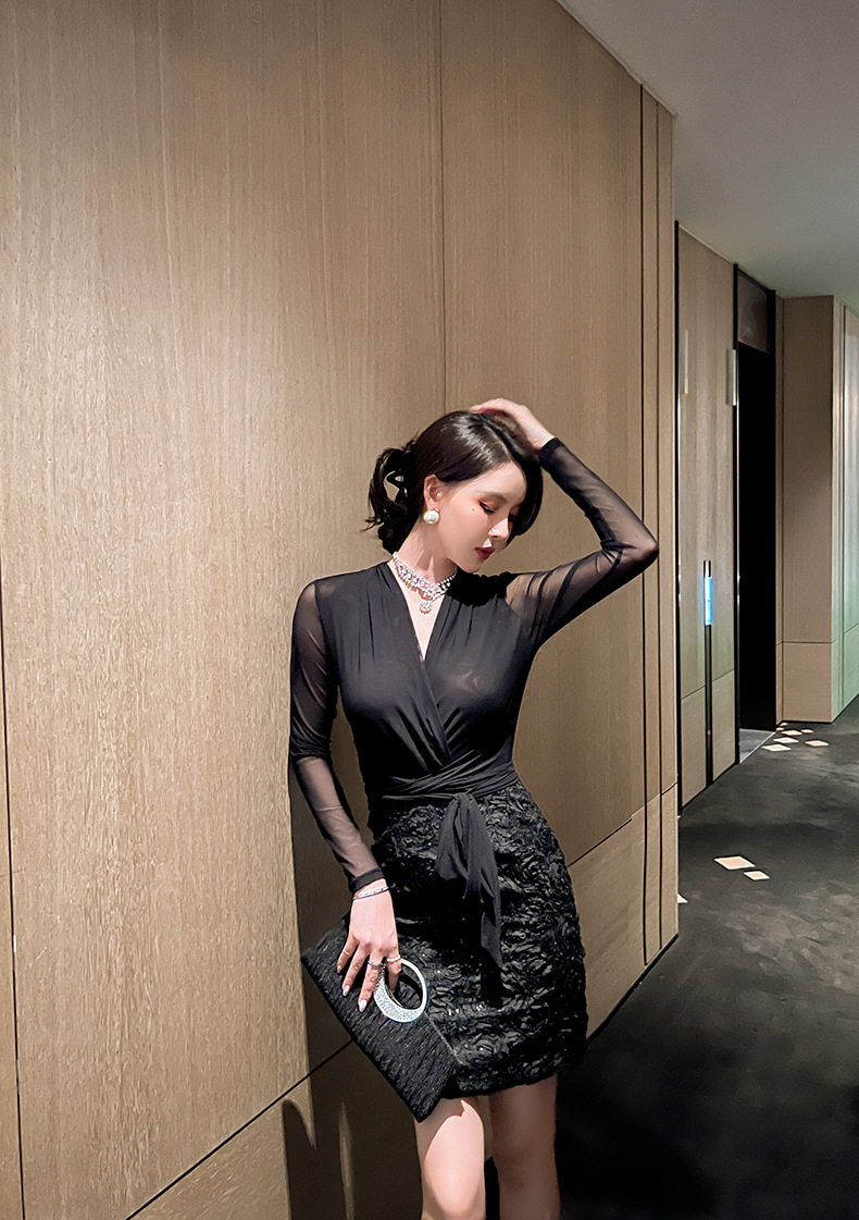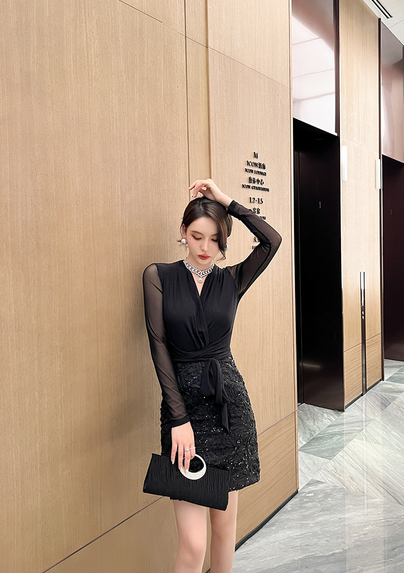 Đầm thiết kế hai lớp tạo kiểu dáng như đang mặc hai món riêng biệt. Cổ chữ V nhẹ nhàng kết hợp phần tay và thân trên bằng vải mỏng có họa tiết hoa nổi. Thân dưới điểm xuyết những chi tiết ánh sáng lấp lánh tinh tế. Sản phẩm phù hợp cho những buổi gặp mặt hoặc dạo phố. Giặt tay và phơi trong bóng mát để giữ form vải và độ bền màu. | Tên sản phẩm: Váy Đầm Liền Thân Nữ Lưới Mỏng Cả Bộ 2 Món Họa Tiết Hoa Cổ Chữ V Hàng Mùa Xuân Thu Đông - Thời Trang Nữ | Mã sản phẩm: B7152 - Giá: 1.120.000đ | Mã nhà sản xuất: CHDG-G04Hình ảnh sản phẩm