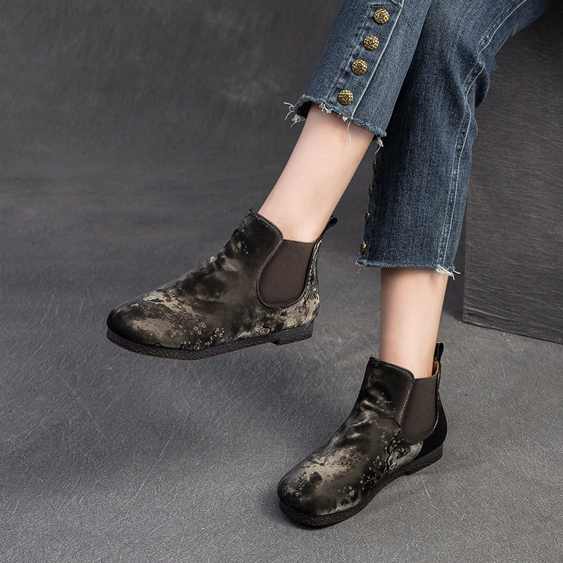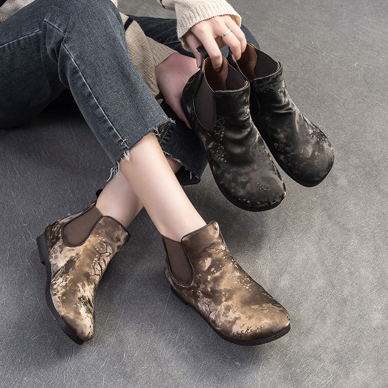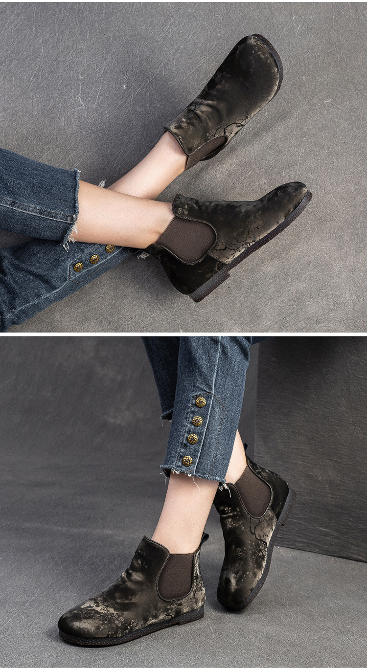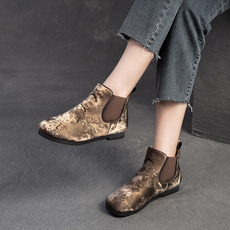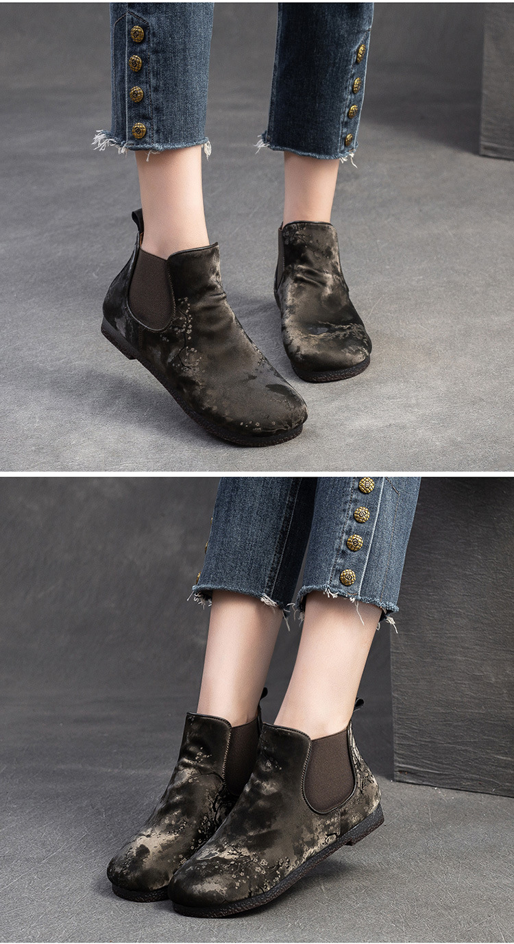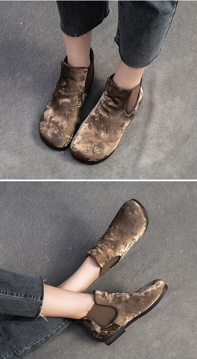 Bốt ngắn nữ tính với phần mũi tròn dễ thương, phong cách dân tộc pha chút hoài cổ. Sản phẩm được làm từ chất liệu lụa mềm mại, mang lại cảm giác dễ chịu khi mang. Đế bằng phẳng giúp bạn di chuyển thoải mái cả ngày dài. Kiểu dáng ống suông dễ dàng phối cùng nhiều loại trang phục như quần jeans, váy hay quần short. Bạn có thể sử dụng như một điểm nhấn cho những dịp gặp mặt thân mật hoặc dạo phố. | Tên sản phẩm: Giày Boot Cổ Thấp Nữ Mũi Tròn Hàng Mùa Xuân Thu Đông Phục Cổ Cổ Điển - Giày Dép Nữ | Mã sản phẩm: B7385 - Giá: 1.420.000đ | Mã nhà sản xuất: SHDU-G04Hình ảnh sản phẩm