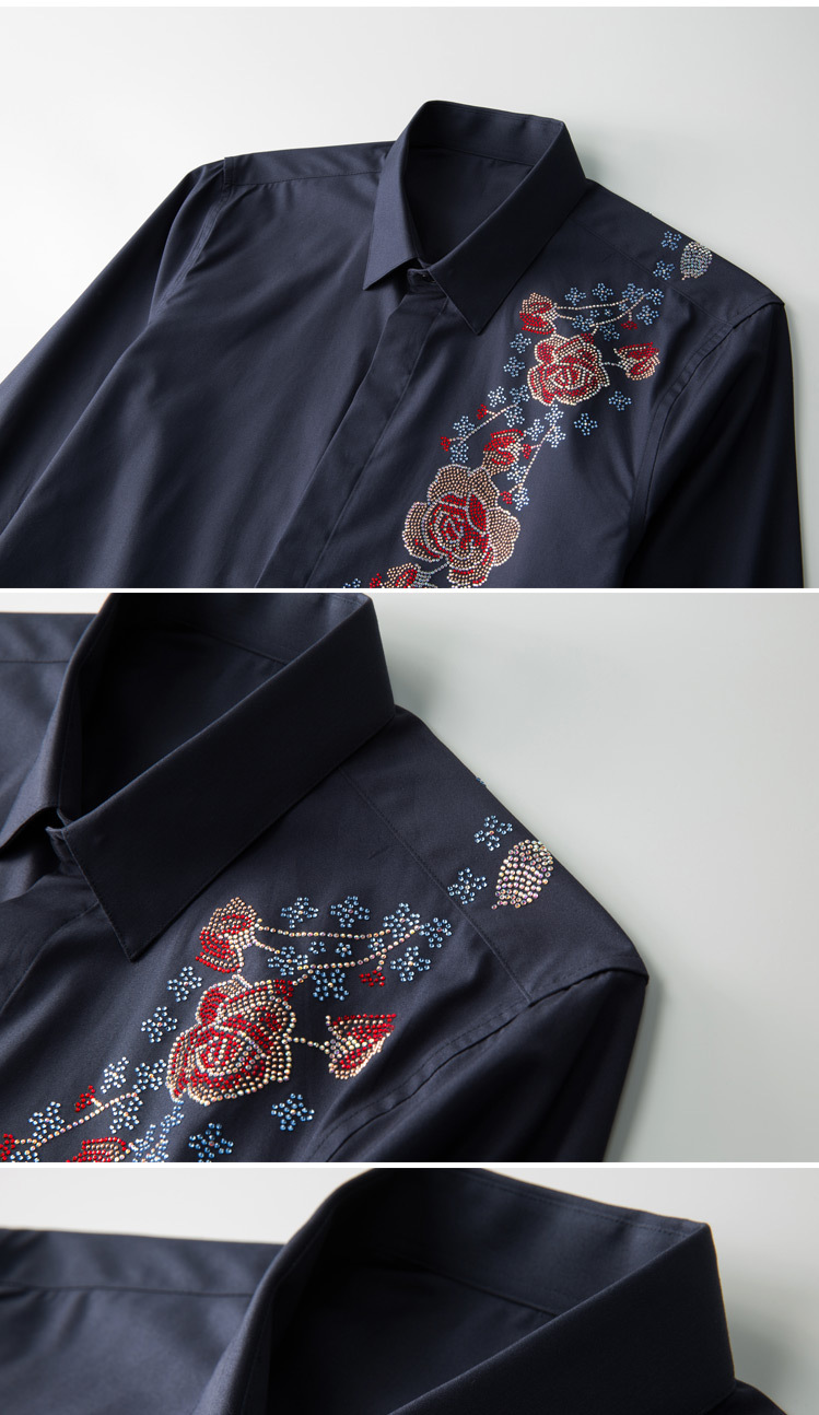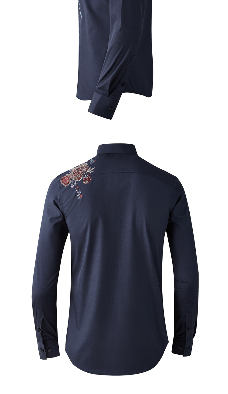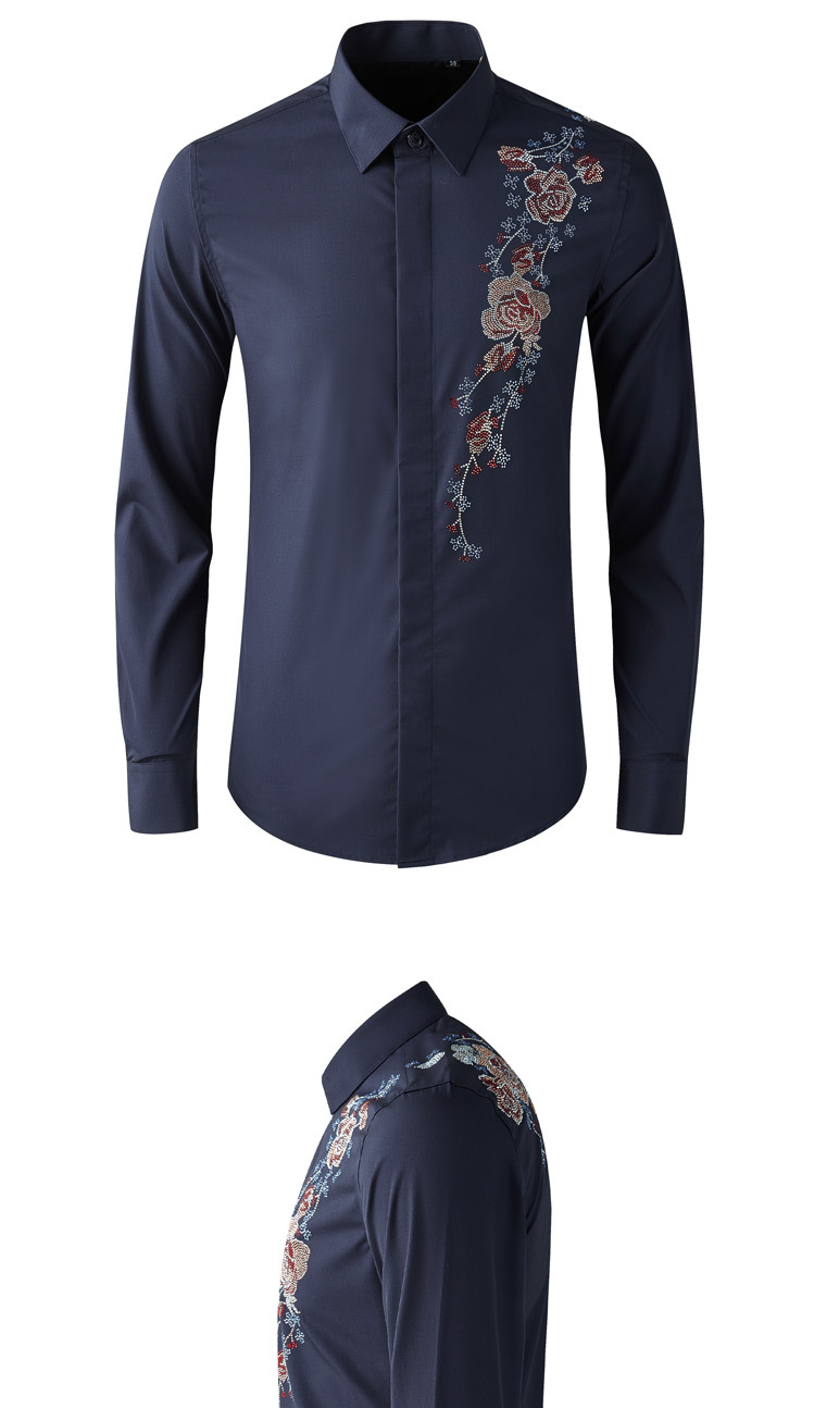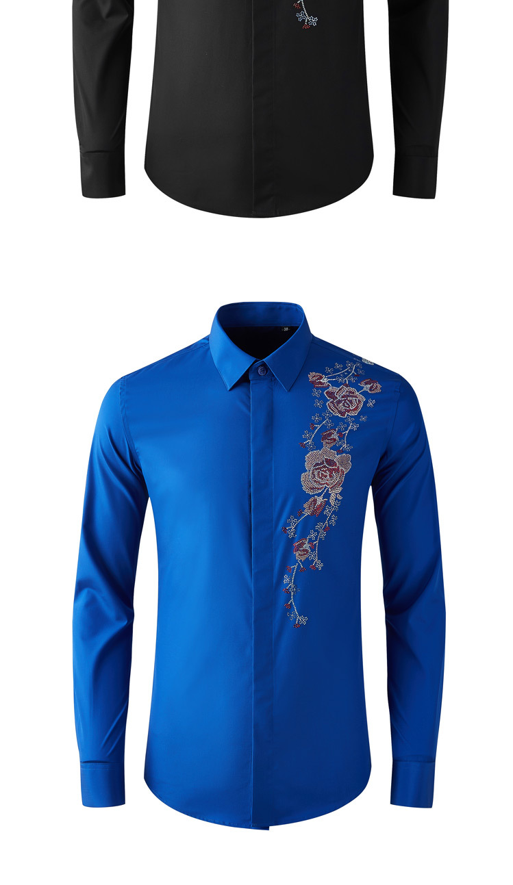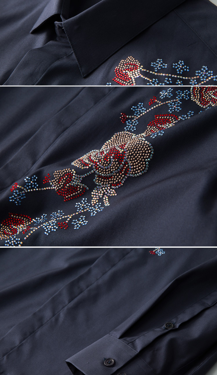 Áo sơ mi nam tay dài có kiểu dáng ôn cơ thể, điểm nhấn là hàng đá lấp lánh được ép nhiệt và họa tiết thêu hoa tinh xảo ở v. Chất vải mềm mại, thoáng mát, tạo cảm giác dễ chịu khi mặc. Sản phẩm phù hợp để phối cùng quần tây hoặc quần jean trong nhiều dịp khác nhau. Bạn chỉ cần giặt bằng tay với nước lạnh và phơi trong bóng râm để giữ form áo và độ bền của trang trí. | Tên sản phẩm: Áo Sơ Mi Nam Dáng Ôm Họa Tiết Hoa - Thời Trang Nam | Mã sản phẩm: B7506 - Giá: 2.190.000đ | Mã nhà sản xuất: SHDAP-G05Hình ảnh sản phẩm