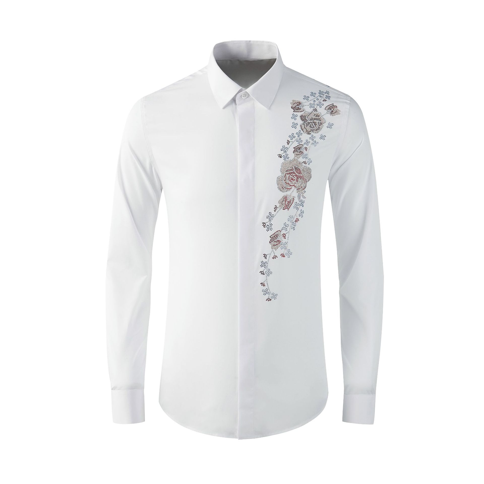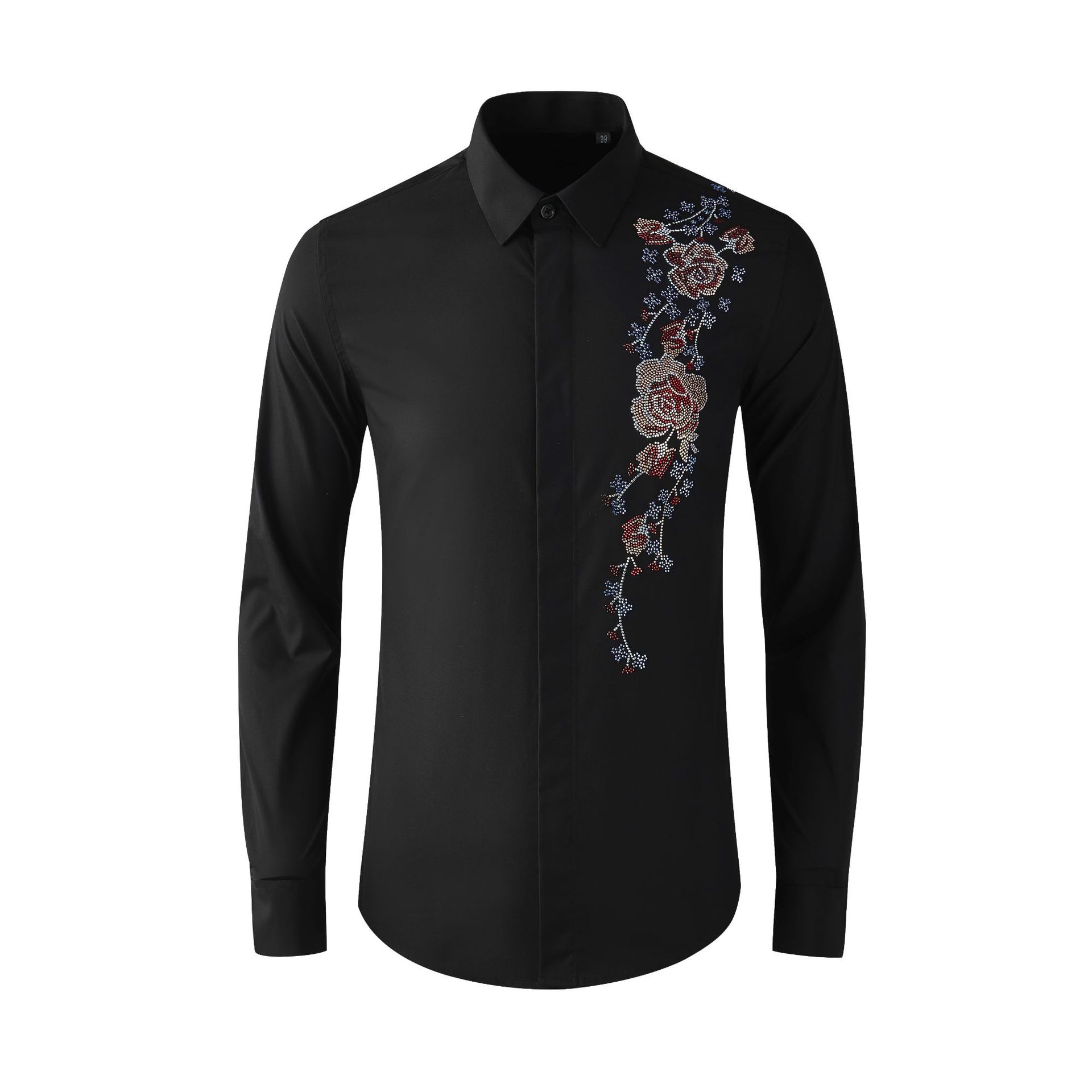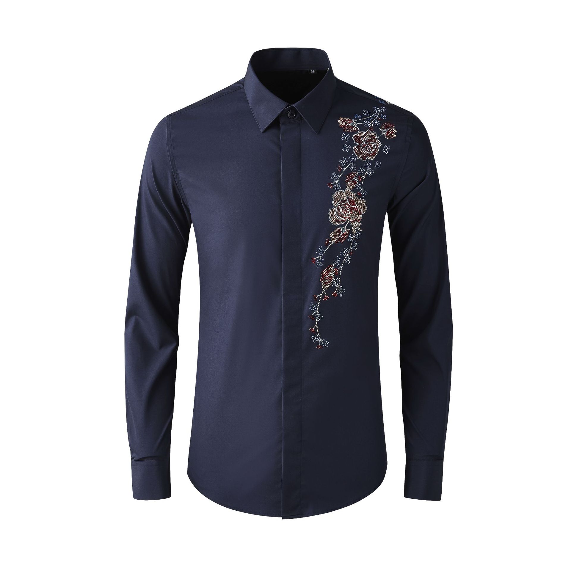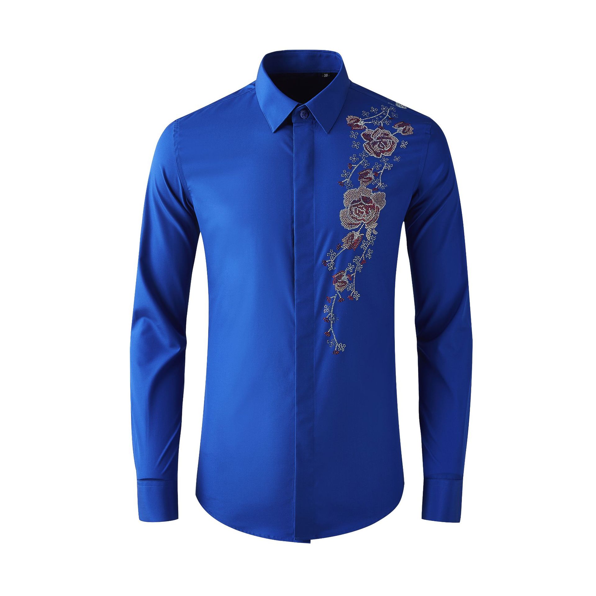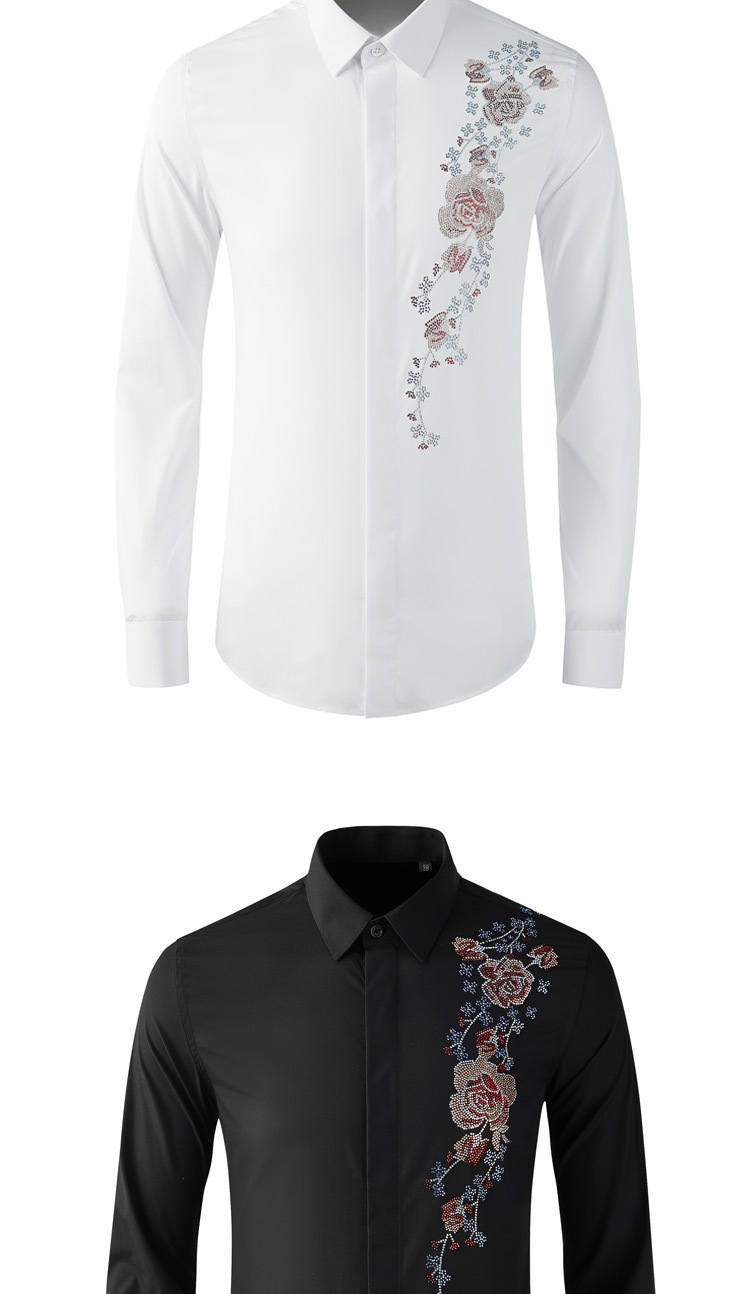 Áo sơ mi nam tay dài có kiểu dáng ôn cơ thể, điểm nhấn là hàng đá lấp lánh được ép nhiệt và họa tiết thêu hoa tinh xảo ở v. Chất vải mềm mại, thoáng mát, tạo cảm giác dễ chịu khi mặc. Sản phẩm phù hợp để phối cùng quần tây hoặc quần jean trong nhiều dịp khác nhau. Bạn chỉ cần giặt bằng tay với nước lạnh và phơi trong bóng râm để giữ form áo và độ bền của trang trí. | Tên sản phẩm: Áo Sơ Mi Nam Dáng Ôm Họa Tiết Hoa - Thời Trang Nam | Mã sản phẩm: B7506 - Giá: 2.190.000đ | Mã nhà sản xuất: SHDAP-G05Hình ảnh sản phẩm