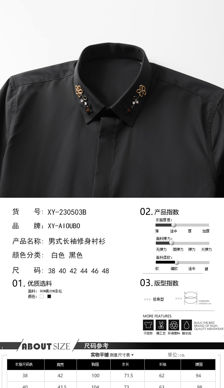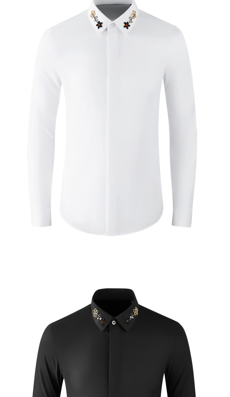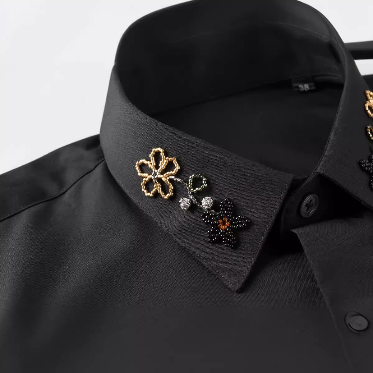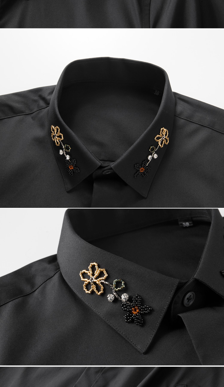 Áo sơ mi dài tay dành cho nam, kiểu dáng kết hợp giữa đi làm và hằng ngày. Điểm nhấn nổi bật ở phần cổ áo được trang trí tỉ mỉ bằng những bông hoa nhỏ và hạt cườm, tất cả đều được làm thủ công tinh xảo. Chất vải mềm mại, thoáng mát giúp người mặc cảm thấy dễ chịu. Sản phẩm phù hợp cho nhiều dịp như đi làm, gặp gỡ hay dự tiệc. Giặt tay hoặc giặt máy nhẹ nhàng để giữ form áo và các chi tiết trang trí được bền đẹp. | Tên sản phẩm: Áo Sơ Mi Nam Dài Tay Họa Tiết Hoa - Thời Trang Nam | Mã sản phẩm: B7724 - Giá: 2.670.000đ | Mã nhà sản xuất: SHDAP-G06Hình ảnh sản phẩm