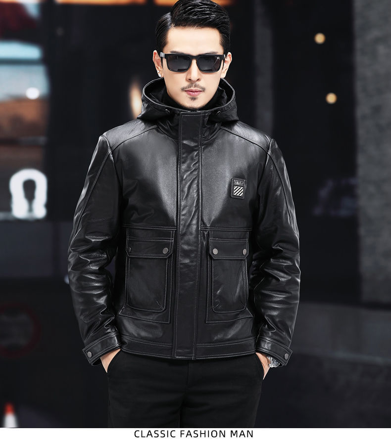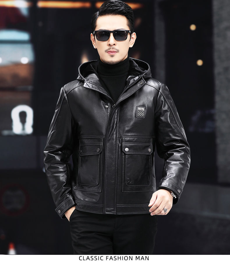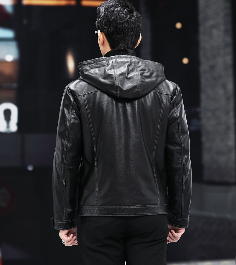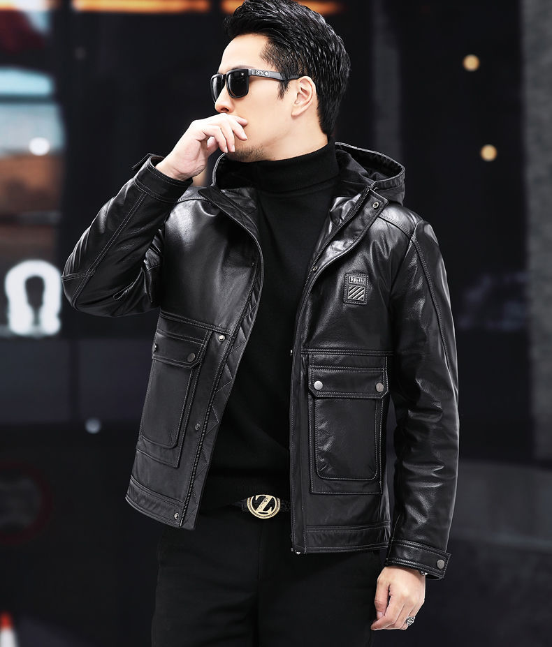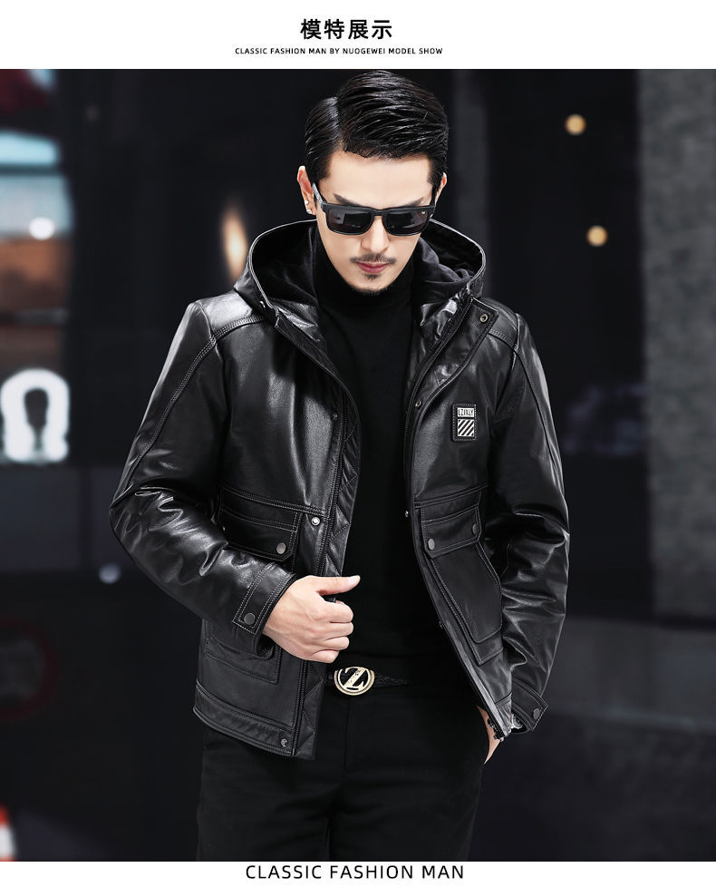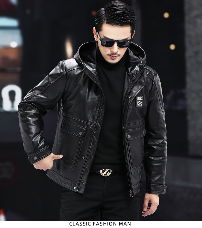 Áo khoác da kiểu dáng ôm dành cho nam, có mũ và được lót bên trong bằng lớp áo lông vũ giữ ấm. Sản phẩm làm từ chất liệu da thật lấy từ lớp da bên ngoài của con bò, mang đến cảm giác mềm mại và bền chắc. Thiết kế năng động phù hợp cho việc di chuyển bằng xe máy hoặc mặc hằng ngày. Cách dùng đơn giản, mặc trực tiếp và kéo khóa khóa lại là được. | Tên sản phẩm: Áo Da Nam Chất Liệu Da Bò Dáng Ôm Mũ Liền - Thời Trang Nam | Mã sản phẩm: B8018 - Giá: 8.140.000đ | Mã nhà sản xuất: HADGA-G06Hình ảnh sản phẩm