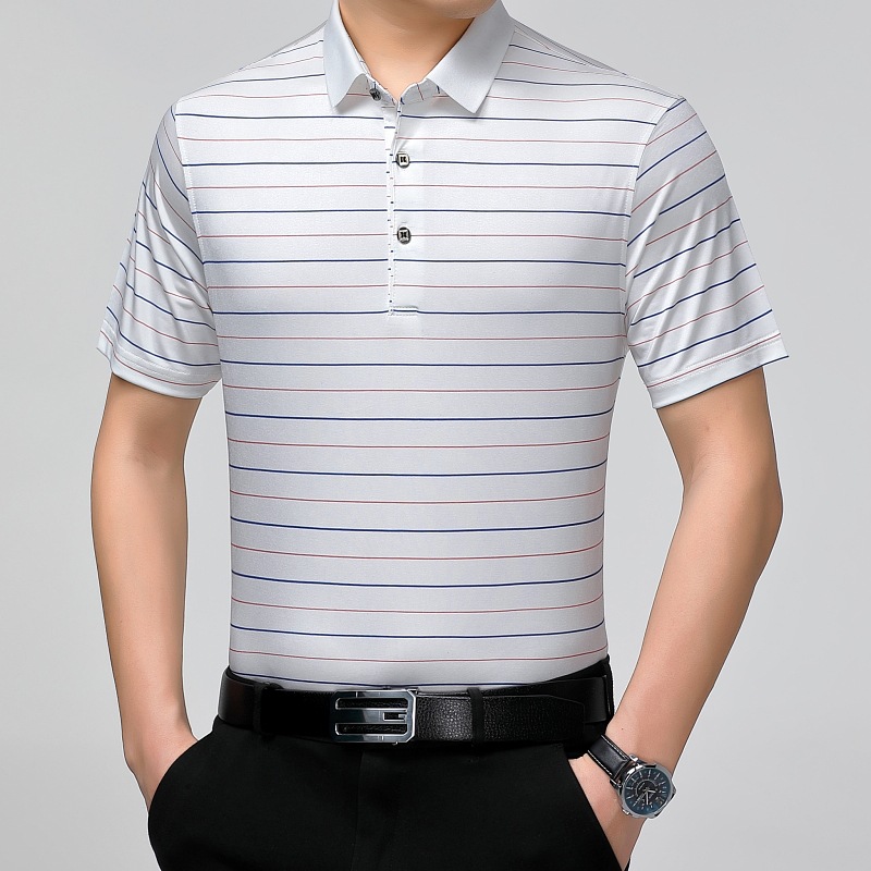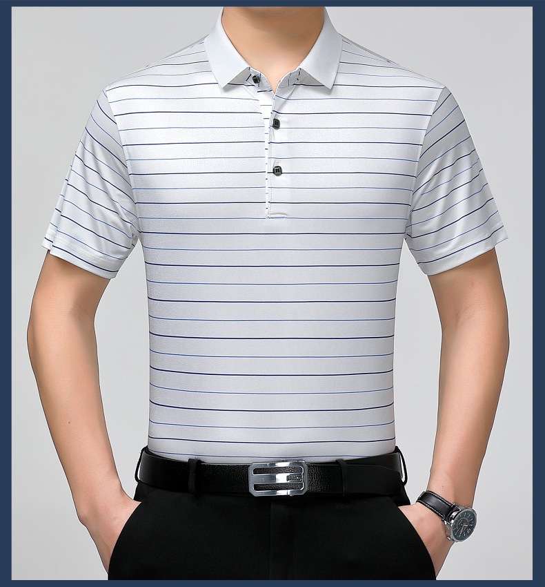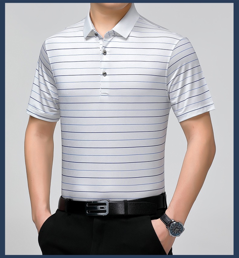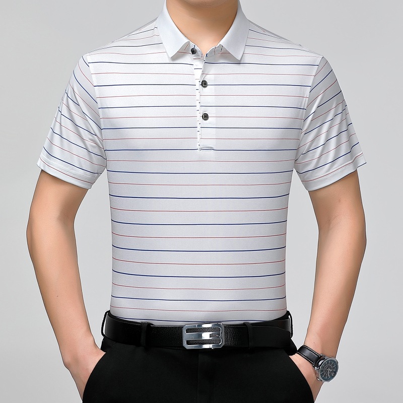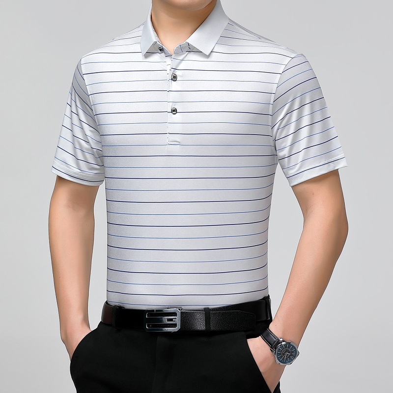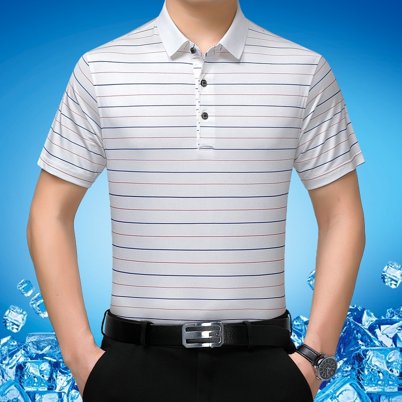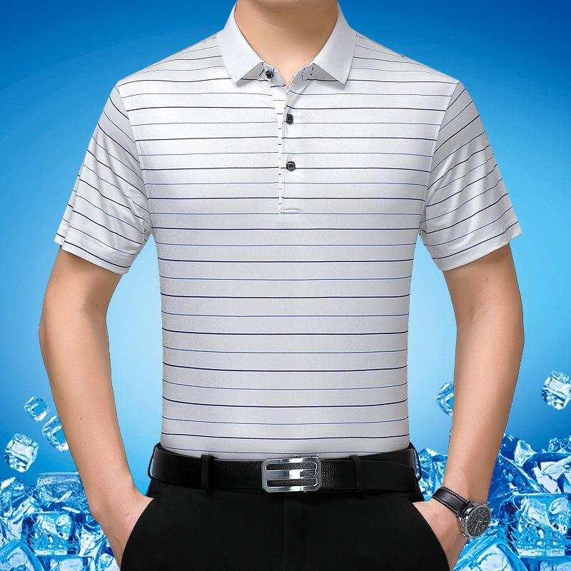 Áo thun cổ bẻ dành cho nam, có họa tiết sọc, phù hợp mặc trong mùa hè. Sản phẩm được dệt từ sợi tơ tằm thiên nhiên, mang lại cảm giác mát mẻ, nhẹ nhàng và thoáng khí khi mặc. Kiểu dáng cổ bẻ và thân áo ôn hòa, phù hợp cho nhiều dịp sinh hoạt thường ngày. Áo ít bị nhăn, giữ nếp tốt, tiết kiệm thời gian là ủi. Có thể giặt máy và phơi khô một cách dễ dàng. | Tên sản phẩm: Áo Thun Nam Chất Liệu Lụa Tơ Tằm Kín Cổ Hàng Mùa Hè Trung Niên - Thời Trang Nam | Mã sản phẩm: B9329 - Giá: 1.810.000đ | Mã nhà sản xuất: SHRYCT-G05Hình ảnh sản phẩm