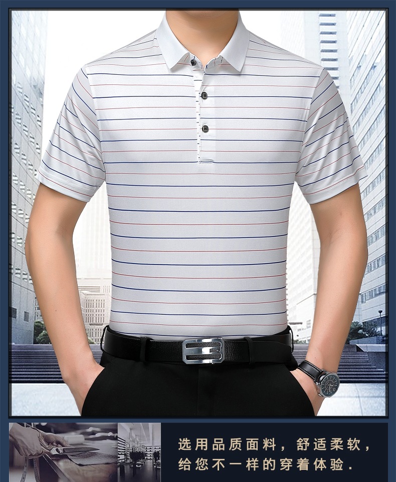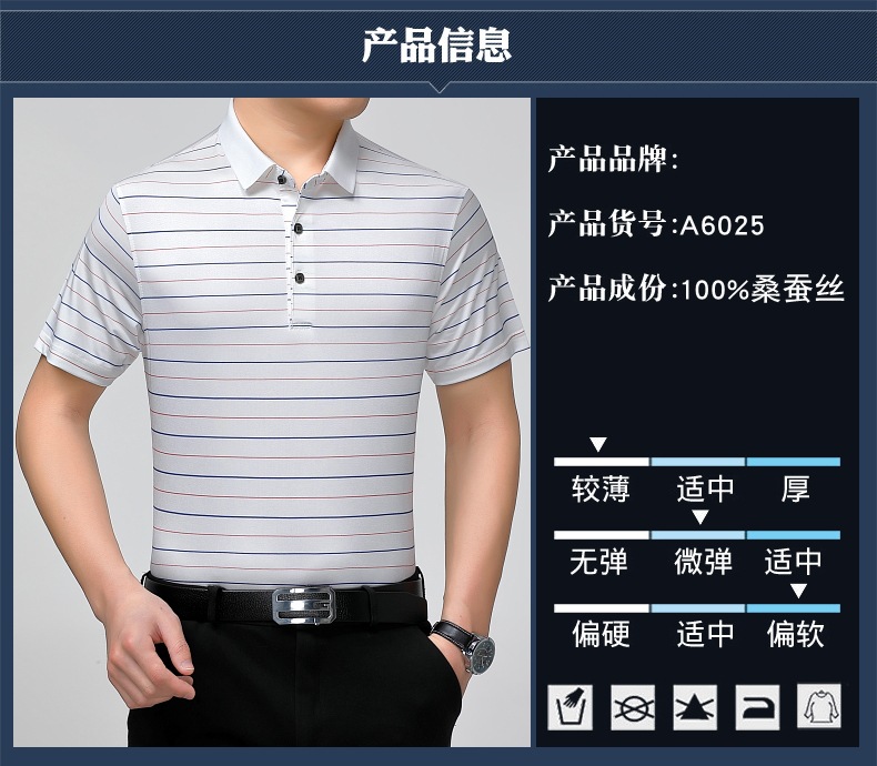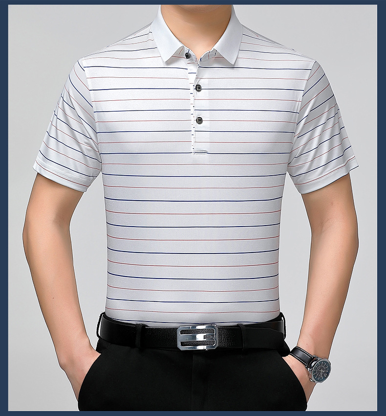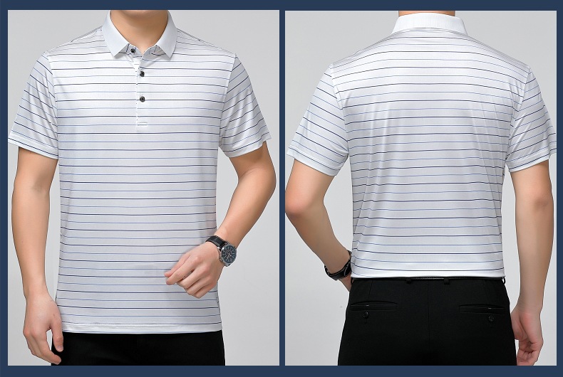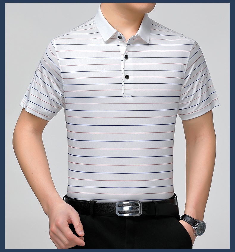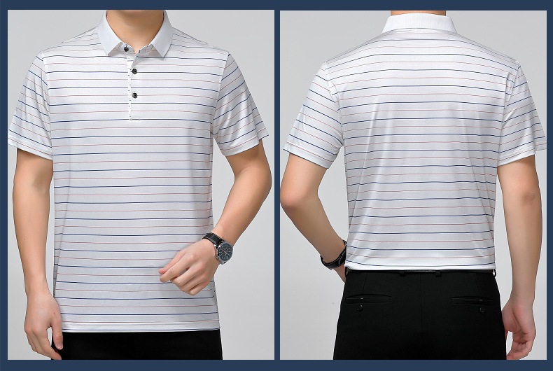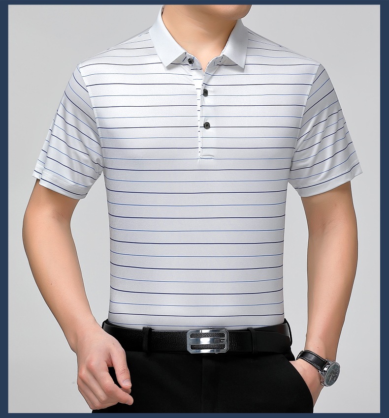 Áo thun cổ bẻ dành cho nam, có họa tiết sọc, phù hợp mặc trong mùa hè. Sản phẩm được dệt từ sợi tơ tằm thiên nhiên, mang lại cảm giác mát mẻ, nhẹ nhàng và thoáng khí khi mặc. Kiểu dáng cổ bẻ và thân áo ôn hòa, phù hợp cho nhiều dịp sinh hoạt thường ngày. Áo ít bị nhăn, giữ nếp tốt, tiết kiệm thời gian là ủi. Có thể giặt máy và phơi khô một cách dễ dàng. | Tên sản phẩm: Áo Thun Nam Chất Liệu Lụa Tơ Tằm Kín Cổ Hàng Mùa Hè Trung Niên - Thời Trang Nam | Mã sản phẩm: B9329 - Giá: 1.810.000đ | Mã nhà sản xuất: SHRYCT-G05Hình ảnh sản phẩm