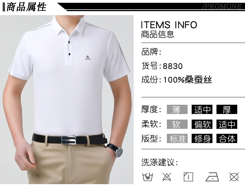 Áo thun cổ bẻ dành cho nam, được dệt từ sợi tơ tằm tự nhiên, mang đến cảm giác mát mẻ và nhẹ nhàng khi mặc. Kiểu dáng cơ bản, dễ phối đồ với nhiều loại trang phục khác nhau. Sản phẩm có khả năng hạn chế nhăn tốt, giúp tiết kiệm thời gian là ủi. Phù hợp cho những dịp sinh hoạt thường ngày. Có thể giặt máy và phơi khô một cách bình thường. | Tên sản phẩm: Áo Thun Nam Chất Liệu Lụa Tơ Tằm Hàng Mùa Hè Trung Niên - Thời Trang Nam | Mã sản phẩm: B9339 - Giá: 1.810.000đ | Mã nhà sản xuất: SHRYCT-G05Hình ảnh sản phẩm