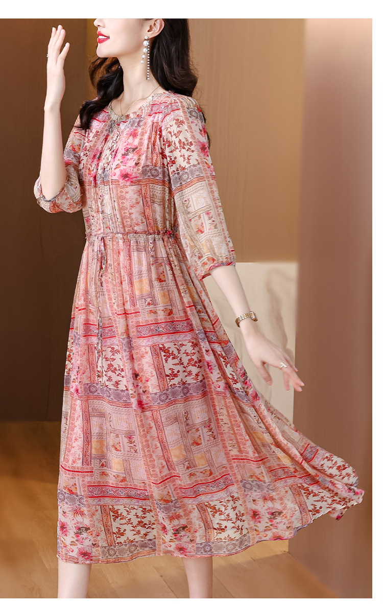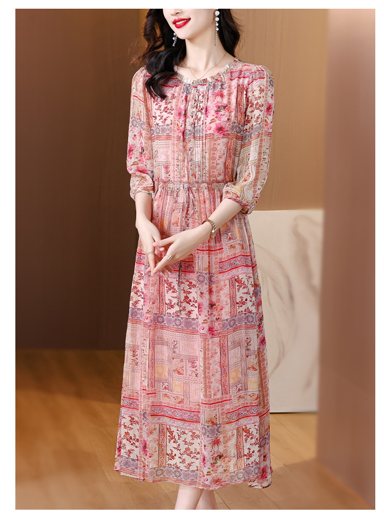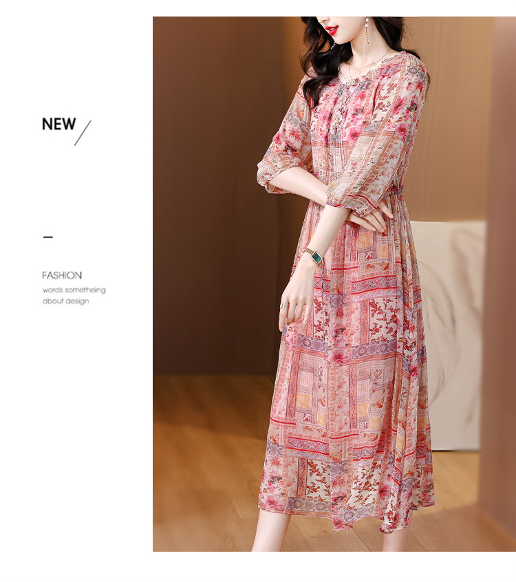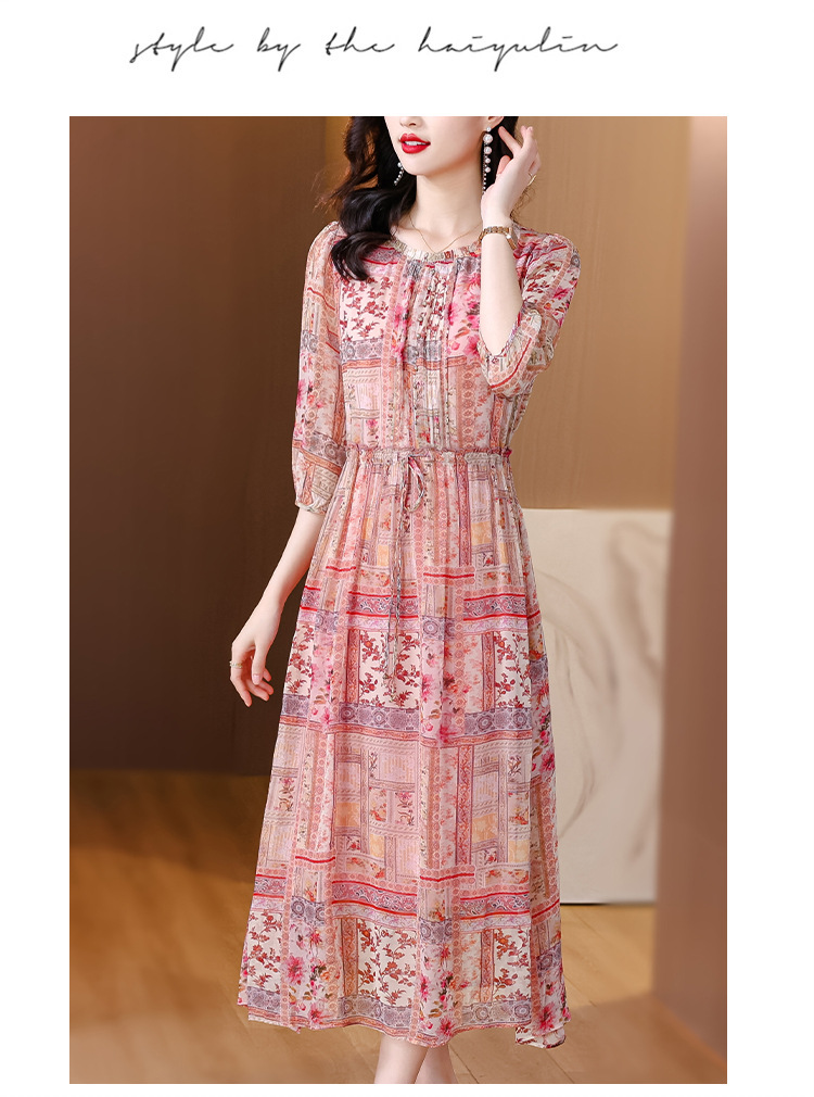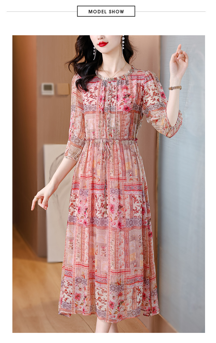 Chiếc váy dành cho mùa hè này được dệt từ sợi tơ tằm mềm mại, mang đến cảm giác mát mẻ và dễ chịu khi mặc. Kiểu dáng ôn hòa với họa tiết hoa nhỏ nhắn, tôn lên vẻ đẹp dịu dàng. Thiết kế giúp tạo dáng thanh thoát, phù hợp cho nhiều dịp sinh hoạt thường ngày. Sản phẩm dễ dàng phối cùng giày dép đơn giản và có thể giặt bằng tay hoặc máy ở chế độ nhẹ để giữ form vải bền lâu. | Tên sản phẩm: Váy Đầm Liền Thân Nữ Chất Liệu Lụa Tơ Tằm Họa Tiết Hoa Hàng Mùa Hè Trung Niên - Thời Trang Nữ | Mã sản phẩm: B9426 - Giá: 2.000.000đ | Mã nhà sản xuất: SHRYCT-G05Hình ảnh sản phẩm