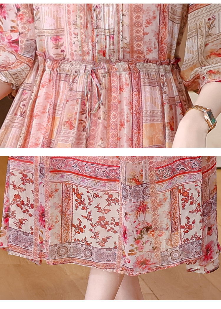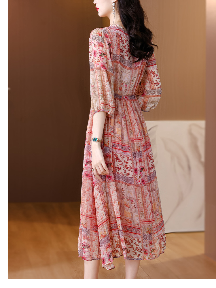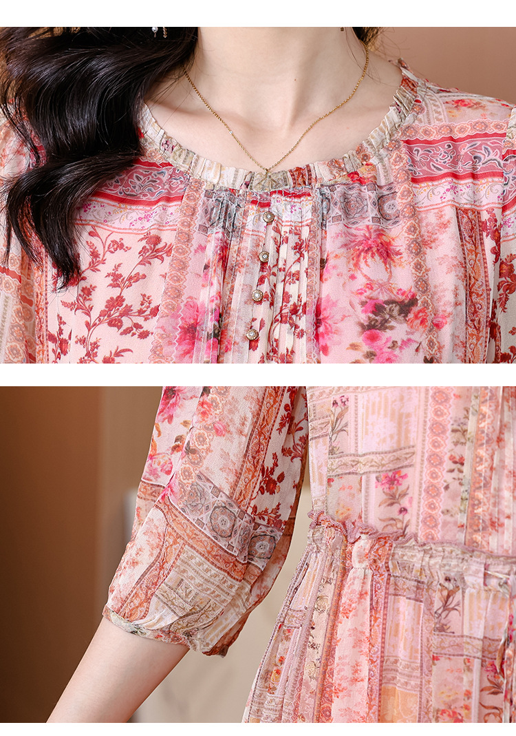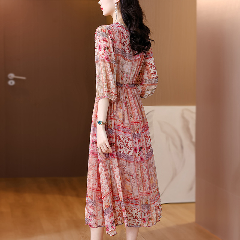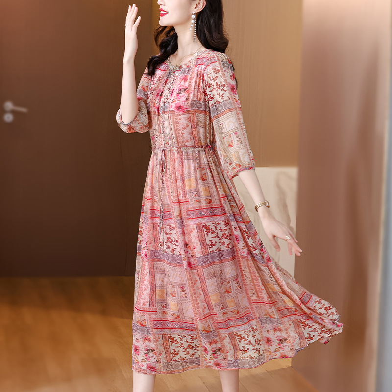 Chiếc váy dành cho mùa hè này được dệt từ sợi tơ tằm mềm mại, mang đến cảm giác mát mẻ và dễ chịu khi mặc. Kiểu dáng ôn hòa với họa tiết hoa nhỏ nhắn, tôn lên vẻ đẹp dịu dàng. Thiết kế giúp tạo dáng thanh thoát, phù hợp cho nhiều dịp sinh hoạt thường ngày. Sản phẩm dễ dàng phối cùng giày dép đơn giản và có thể giặt bằng tay hoặc máy ở chế độ nhẹ để giữ form vải bền lâu. | Tên sản phẩm: Váy Đầm Liền Thân Nữ Chất Liệu Lụa Tơ Tằm Họa Tiết Hoa Hàng Mùa Hè Trung Niên - Thời Trang Nữ | Mã sản phẩm: B9426 - Giá: 2.000.000đ | Mã nhà sản xuất: SHRYCT-G05Hình ảnh sản phẩm