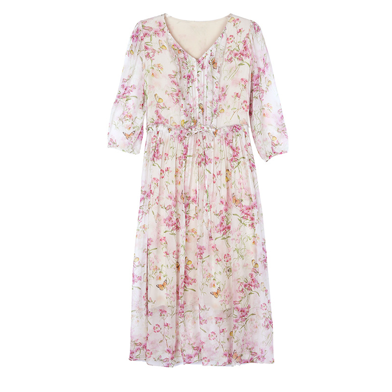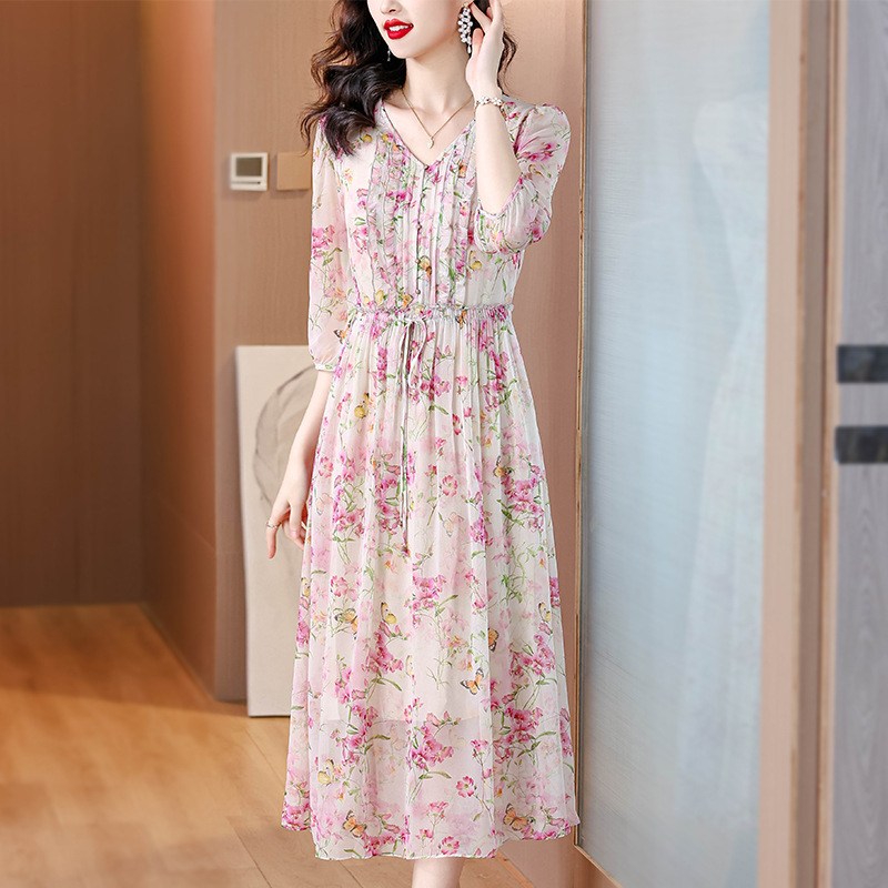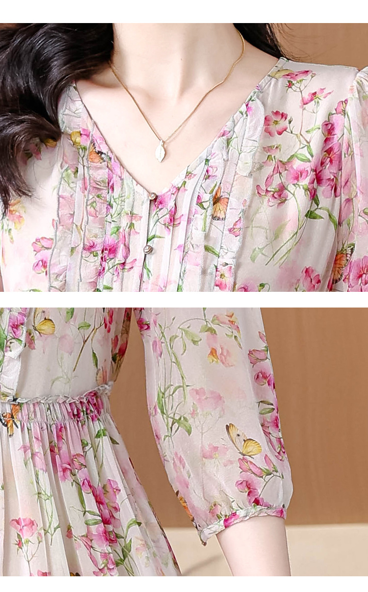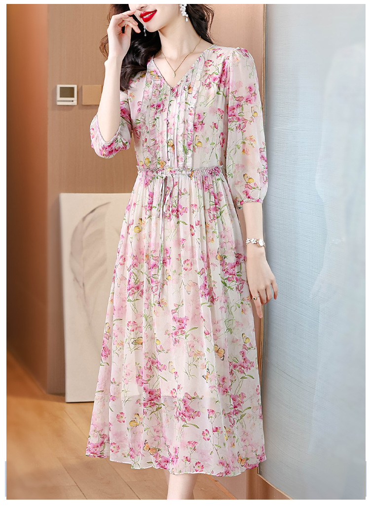 Váy liền dáng chữ A với phần cổ khoét sâu tạo điểm nhấn. Chất vải lụa tự nhiên dày dặn, mềm mại và thoáng mát khi mặc. Thiết kế ôm nhẹ phần eo rồi xòe nhẹ xuống dưới, giúp tôn dáng một cách tinh tế. Sản phẩm phù hợp để mặc trong nhiều dịp khác nhau, từ đi làm đến các buổi gặp mặt. Bạn chỉ cần giặt nhẹ và phơi khô trong bóng râm để giữ form váy và chất vải được bền đẹp. | Tên sản phẩm: Váy Đầm Liền Thân Nữ Chất Liệu Lụa Tơ Tằm Dáng Chữ A Cổ Chữ V - Thời Trang Nữ | Mã sản phẩm: B9447 - Giá: 2.100.000đ | Mã nhà sản xuất: SHRYCT-G05Hình ảnh sản phẩm
