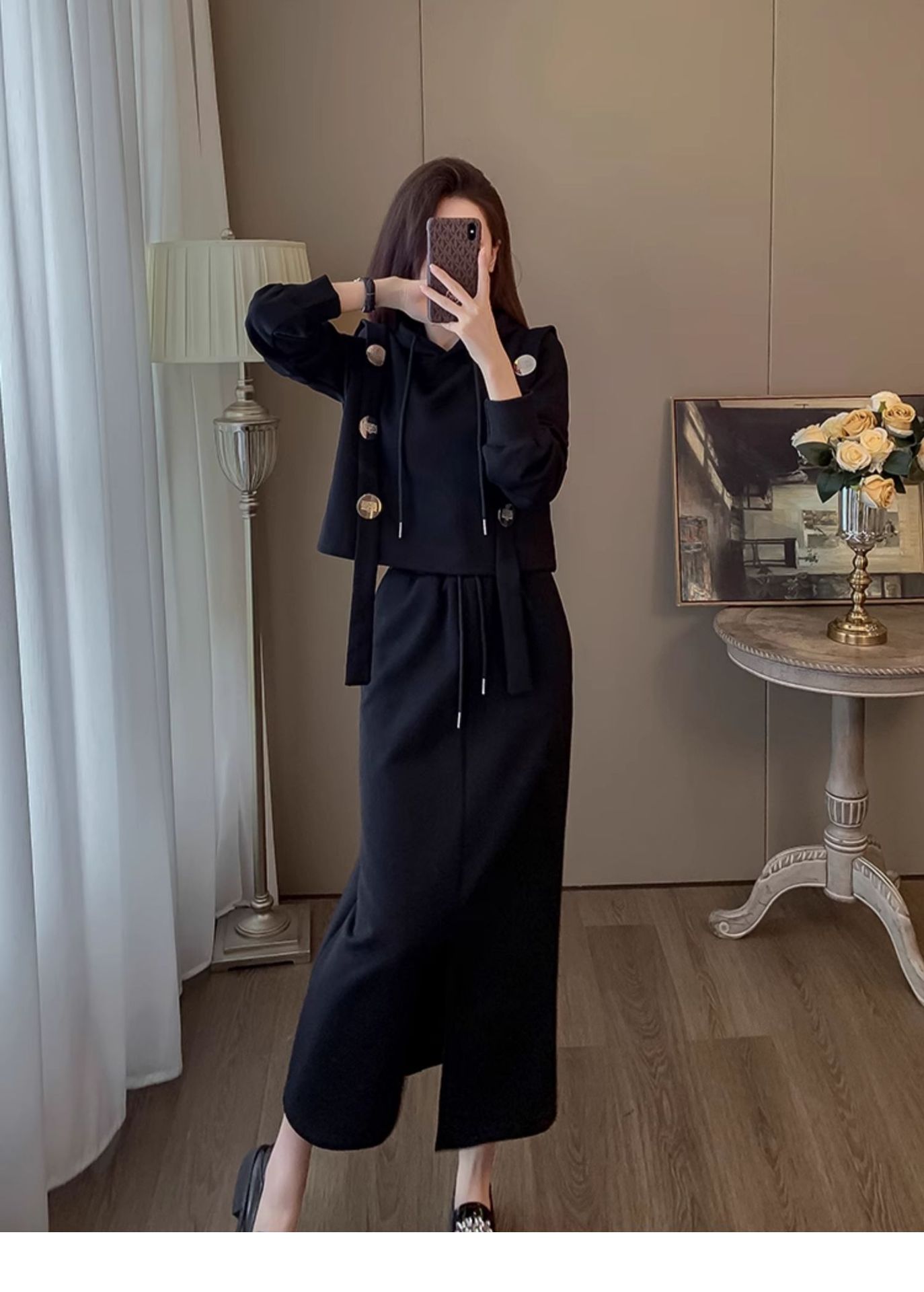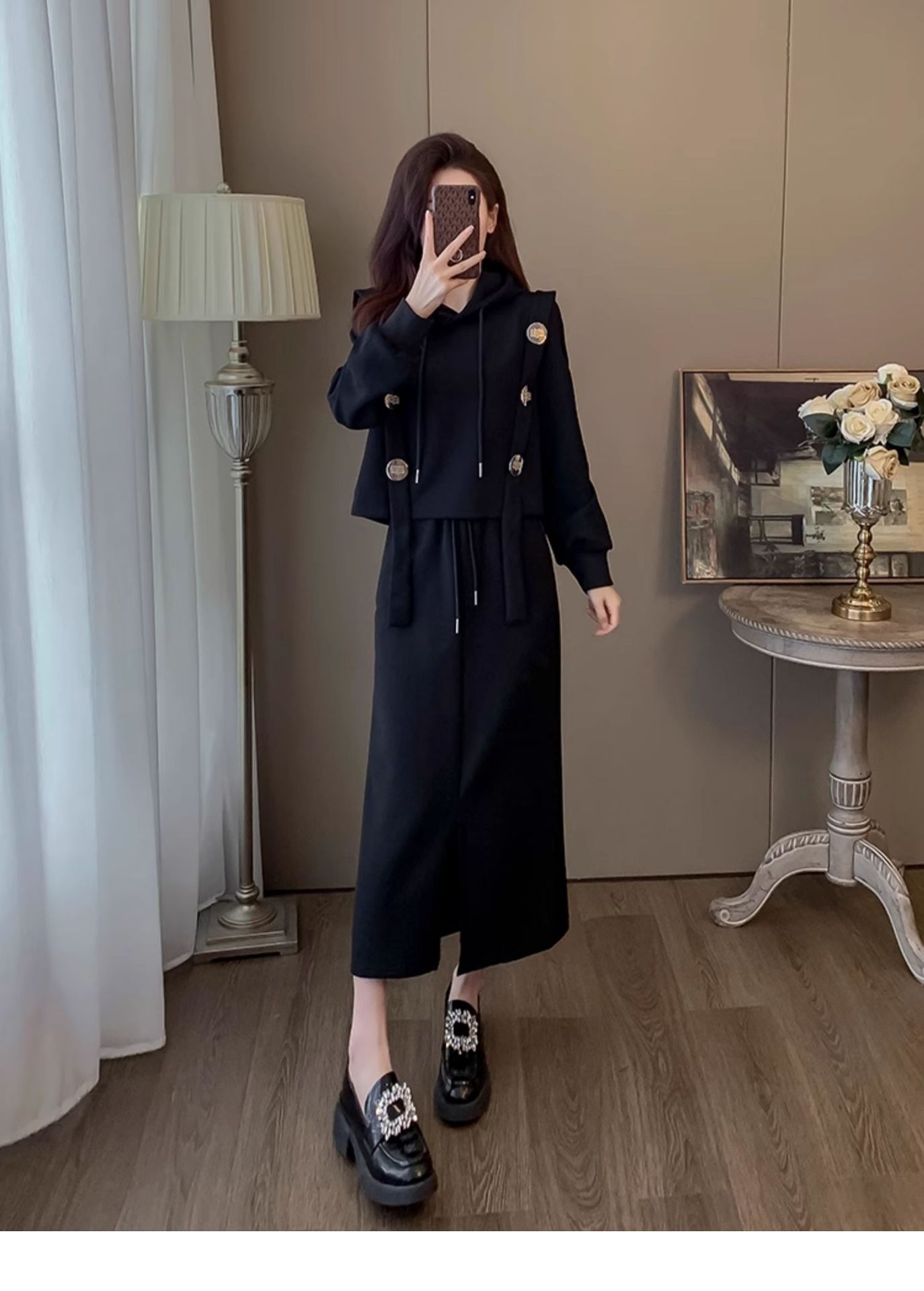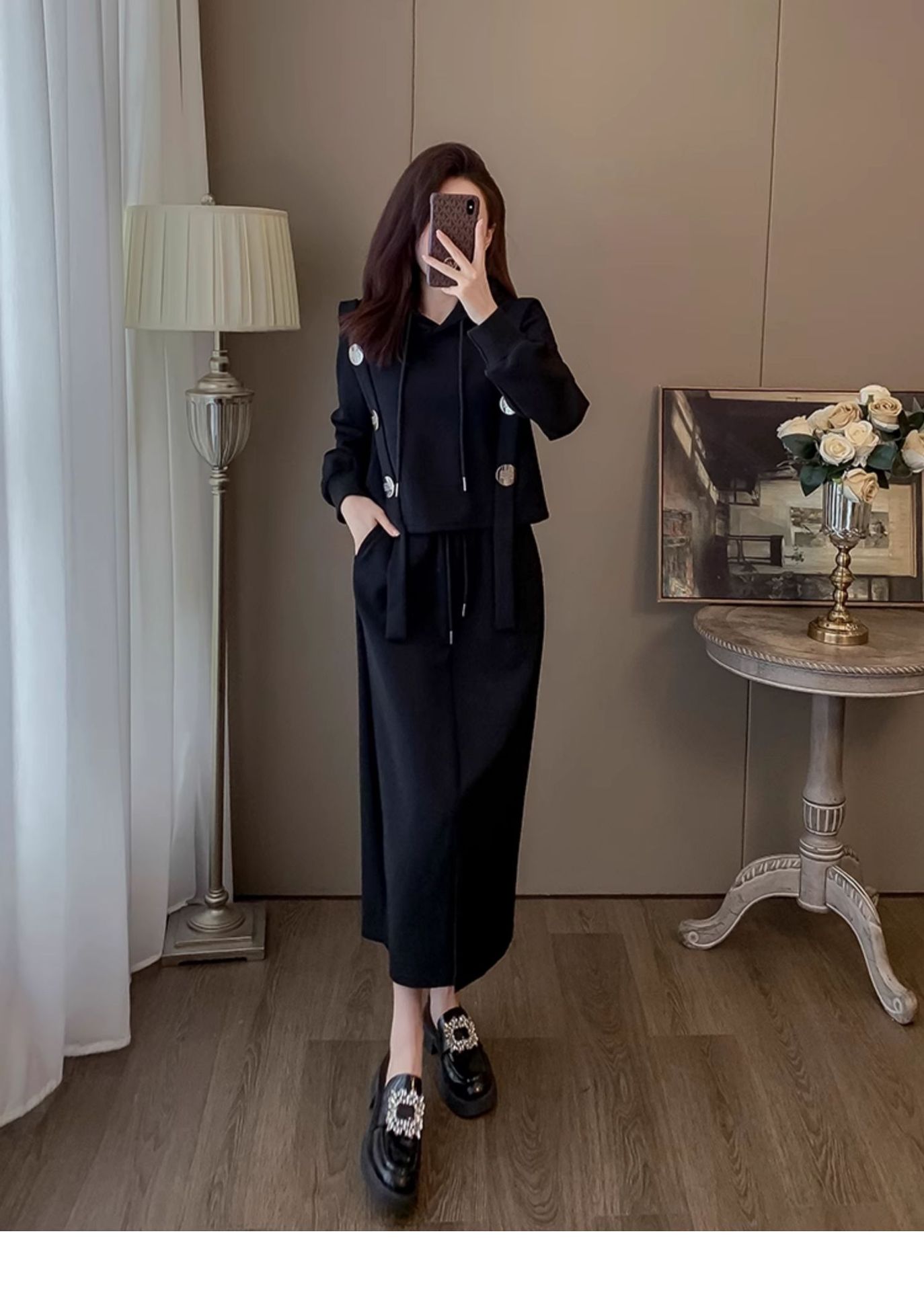 Bộ trang phục thể thao dành cho nữ với áo nỉ có mũ và chân váy dáng dài. Chất vải mềm mại, co giãn nhẹ mang lại sự thoải mái cho các hoạt động hằng ngày. Thiết kế một màu đen dễ dàng phối đồ, tạo vẻ gọn gàng. Có thể mặc nguyên bộ hoặc tách rời để phù hợp với nhiều dịp khác nhau. Phù hợp mặc trong tiết trời mát mẻ. | Tên sản phẩm: Đồ Bộ Nữ Cả Bộ 2 Món Hàng Mùa Xuân Thu Đông - Thời Trang Nữ | Mã sản phẩm: B9803 - Giá: 1.280.000đ | Mã nhà sản xuất: AIANOR-G04Hình ảnh sản phẩm