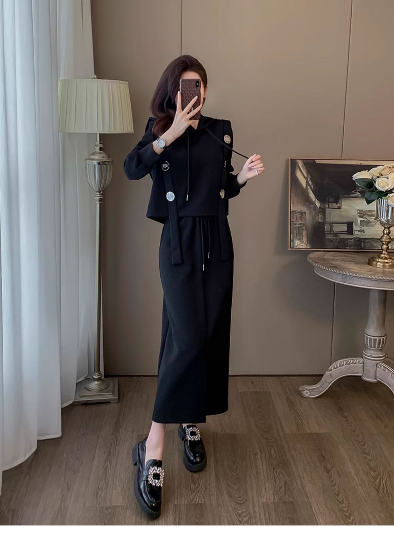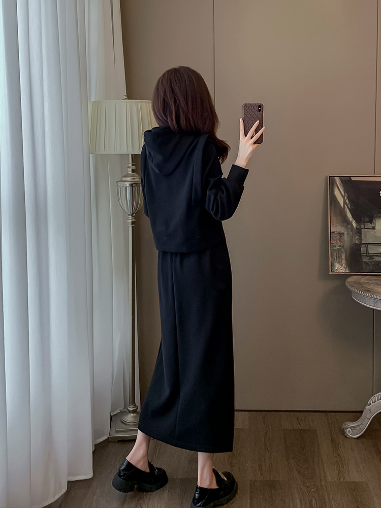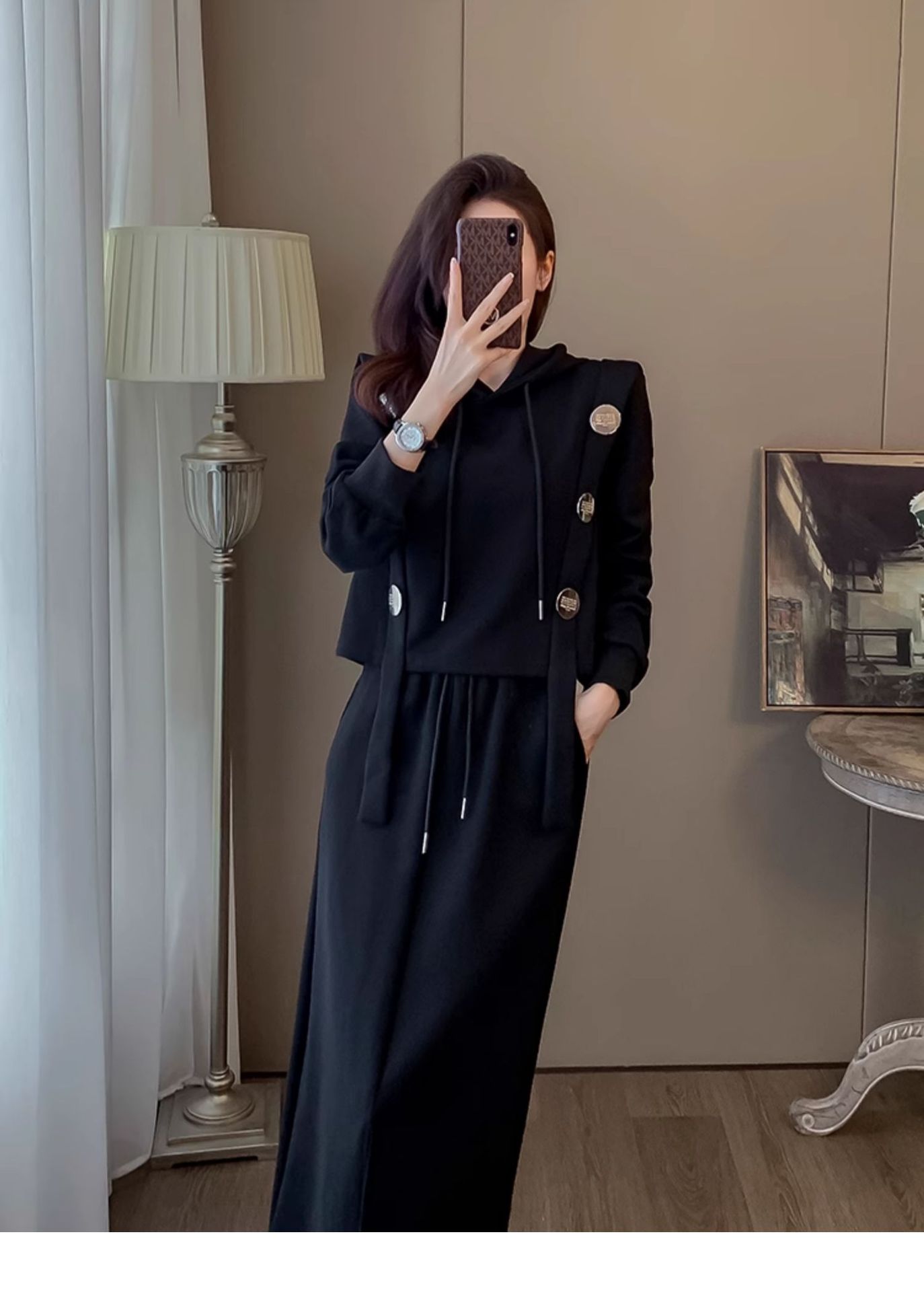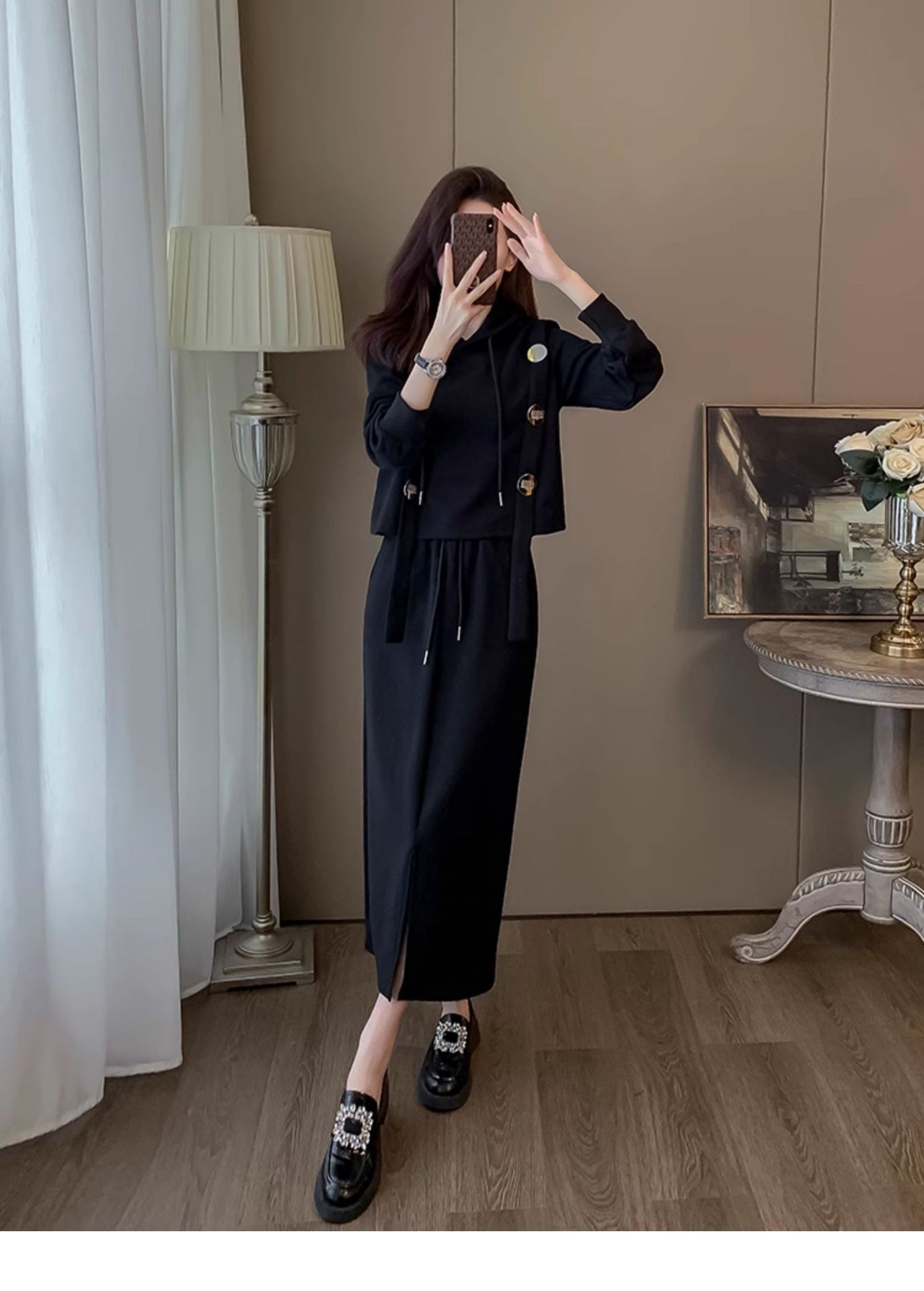 Bộ trang phục thể thao dành cho nữ với áo nỉ có mũ và chân váy dáng dài. Chất vải mềm mại, co giãn nhẹ mang lại sự thoải mái cho các hoạt động hằng ngày. Thiết kế một màu đen dễ dàng phối đồ, tạo vẻ gọn gàng. Có thể mặc nguyên bộ hoặc tách rời để phù hợp với nhiều dịp khác nhau. Phù hợp mặc trong tiết trời mát mẻ. | Tên sản phẩm: Đồ Bộ Nữ Cả Bộ 2 Món Hàng Mùa Xuân Thu Đông - Thời Trang Nữ | Mã sản phẩm: B9803 - Giá: 1.280.000đ | Mã nhà sản xuất: AIANOR-G04Hình ảnh sản phẩm