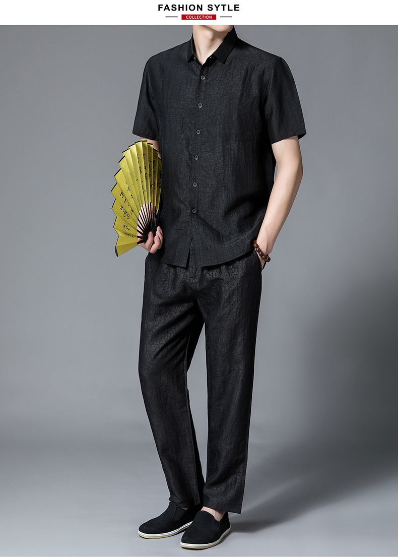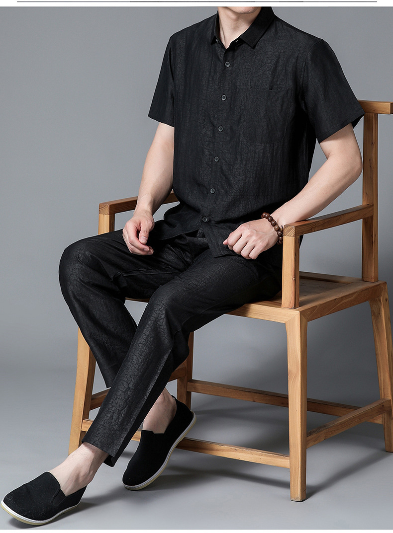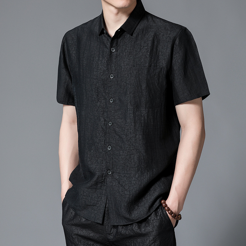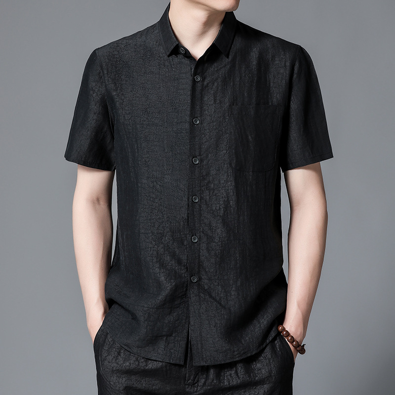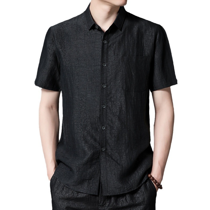 Áo sơ mi ngắn tay dành cho nam, được dệt từ loại vải lụa tự nhiên mềm mại và thoáng mát. Chất vải có hoa văn độc đáo tựa như những vết nứt trên m rùa, tạo nên điểm nhấn riêng biệt. Kiểu dáng cổ tròn truyền thống, form rộng rãi giúp người mặc cảm thấy dễ chịu. Sản phẩm phù hợp cho những dịp thư giãn hoặc sử dụng hàng ngày. Giặt tay nhẹ nhàng và phơi trong bóng mát để giữ được độ bền đẹp của vải. | Tên sản phẩm: Áo Sơ Mi Nam Chất Liệu Lụa Tơ Tằm Ngắn Tay - Thời Trang Nam | Mã sản phẩm: B9839 - Giá: 4.880.000đ | Mã nhà sản xuất: JIDEN-G06Hình ảnh sản phẩm
