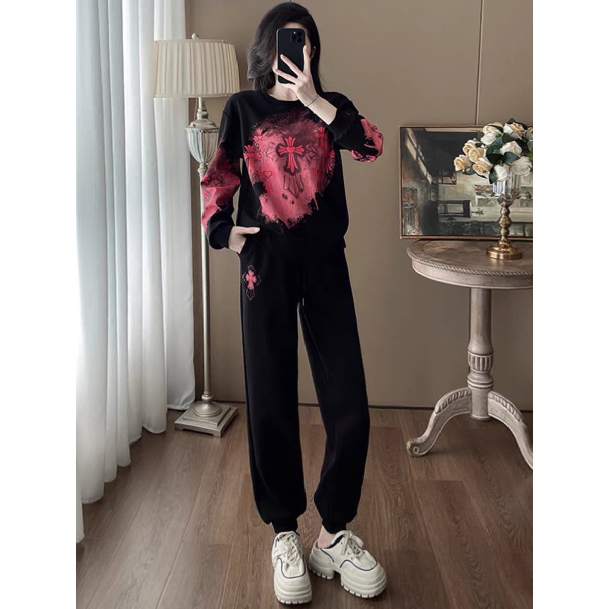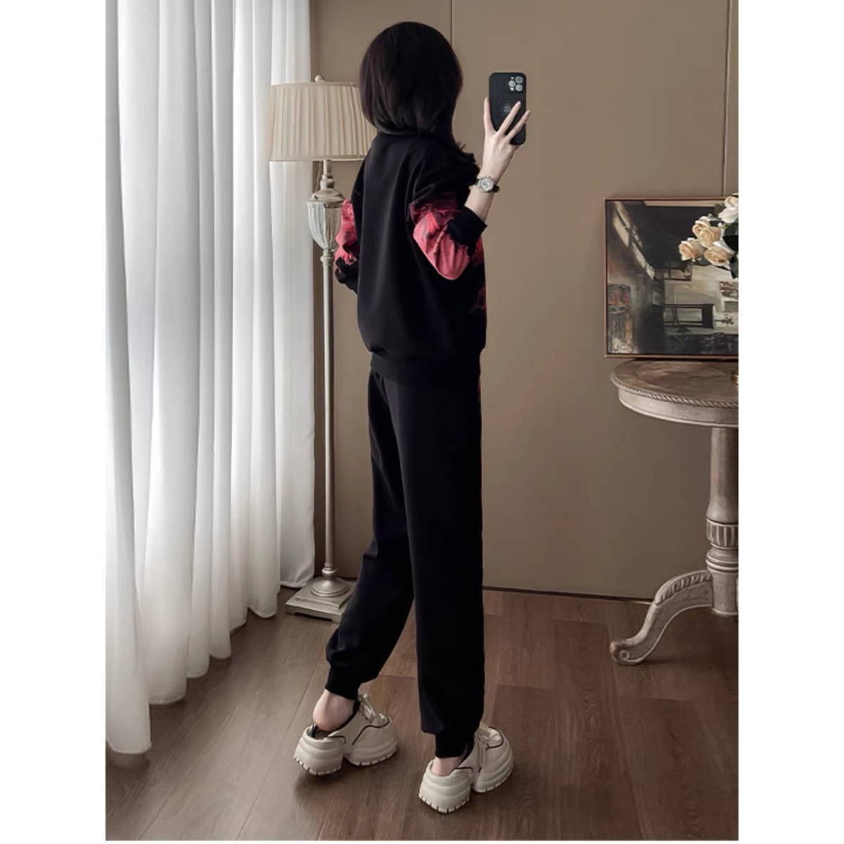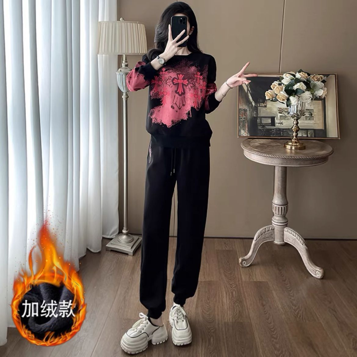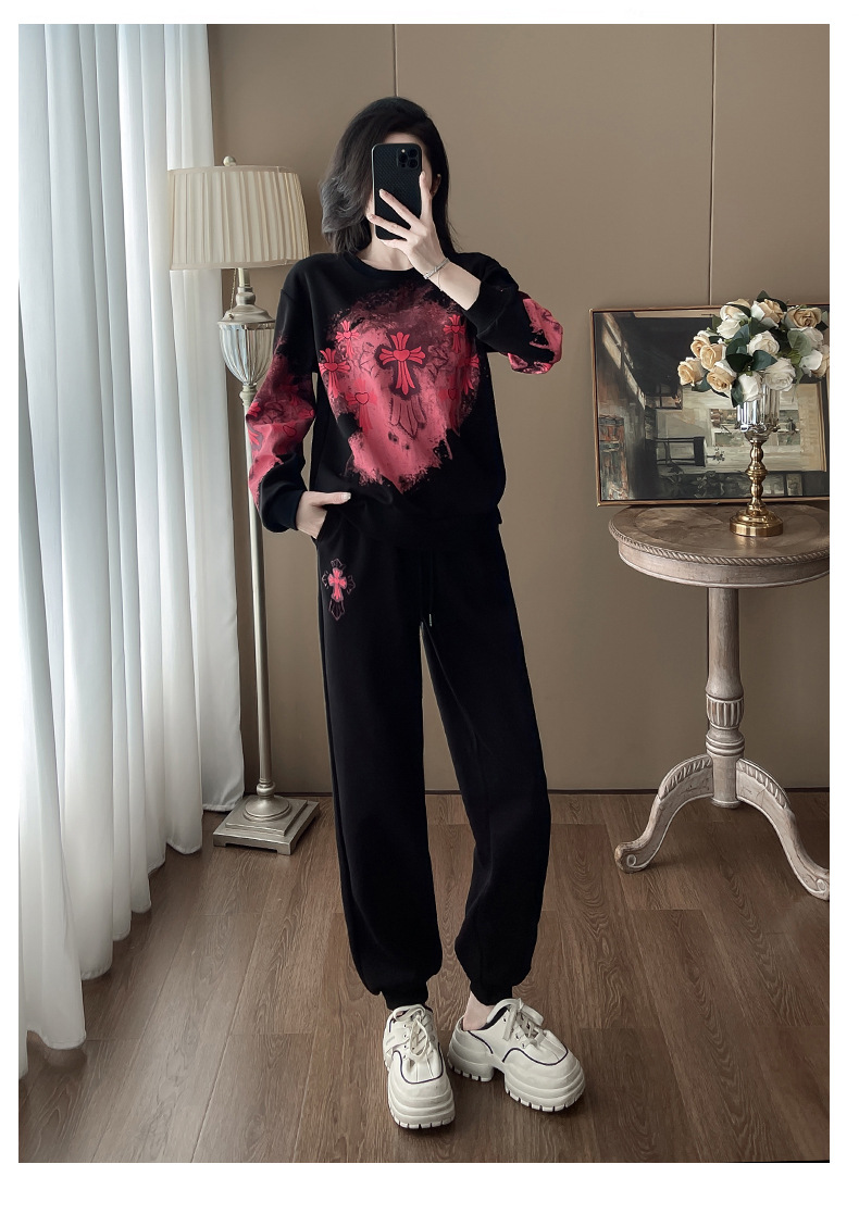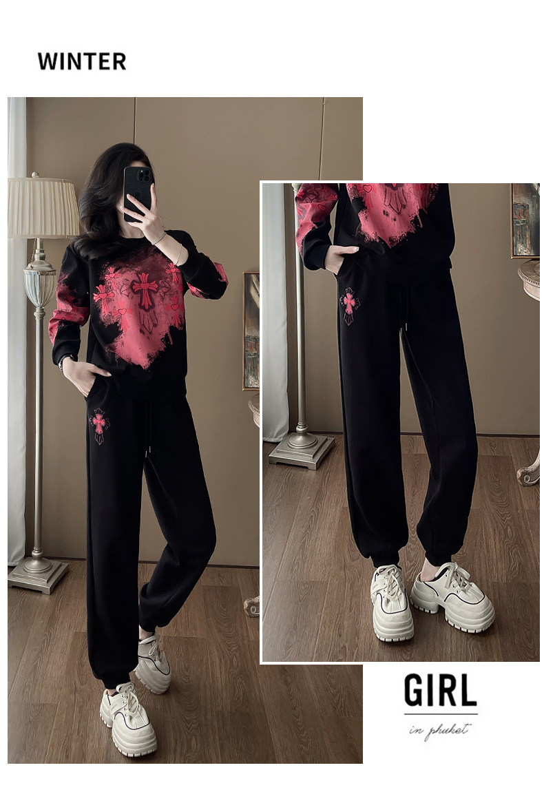 Bộ đồ thể thao hai mảnh dành cho nữ, thiết kế kiểu dáng năng động và thoải mái. Áo nỉ bên trong được làm ấm bằng lớp lót mềm mại, phù hợp cho thời tiết mát mẻ. Trên nền màu đen, điểm nhấn là các họa tiết in nổi bật, tạo nên vẻ trẻ trung và cá tính. Bạn có thể mặc nguyên bộ để đi chơi, tập luyện nhẹ nhàng hoặc phối cùng các trang phục khác. Chất vải co giãn nhẹ, mang lại cảm giác dễ chịu cho mọi hoạt động hằng ngày. | Tên sản phẩm: Đồ Bộ Nữ Cả Bộ 2 Món Họa Tiết Hoa Hàng Mùa Xuân Thu Đông - Thời Trang Nữ | Mã sản phẩm: B9880 - Giá: 1.250.000đ | Mã nhà sản xuất: AIANOR-G04Hình ảnh sản phẩm
