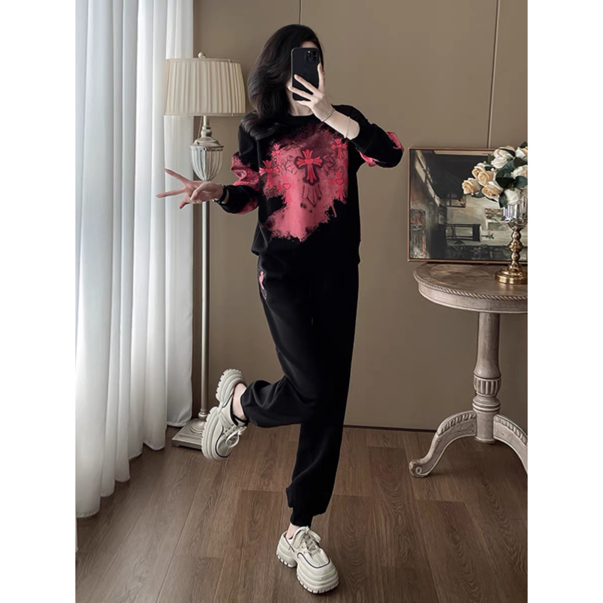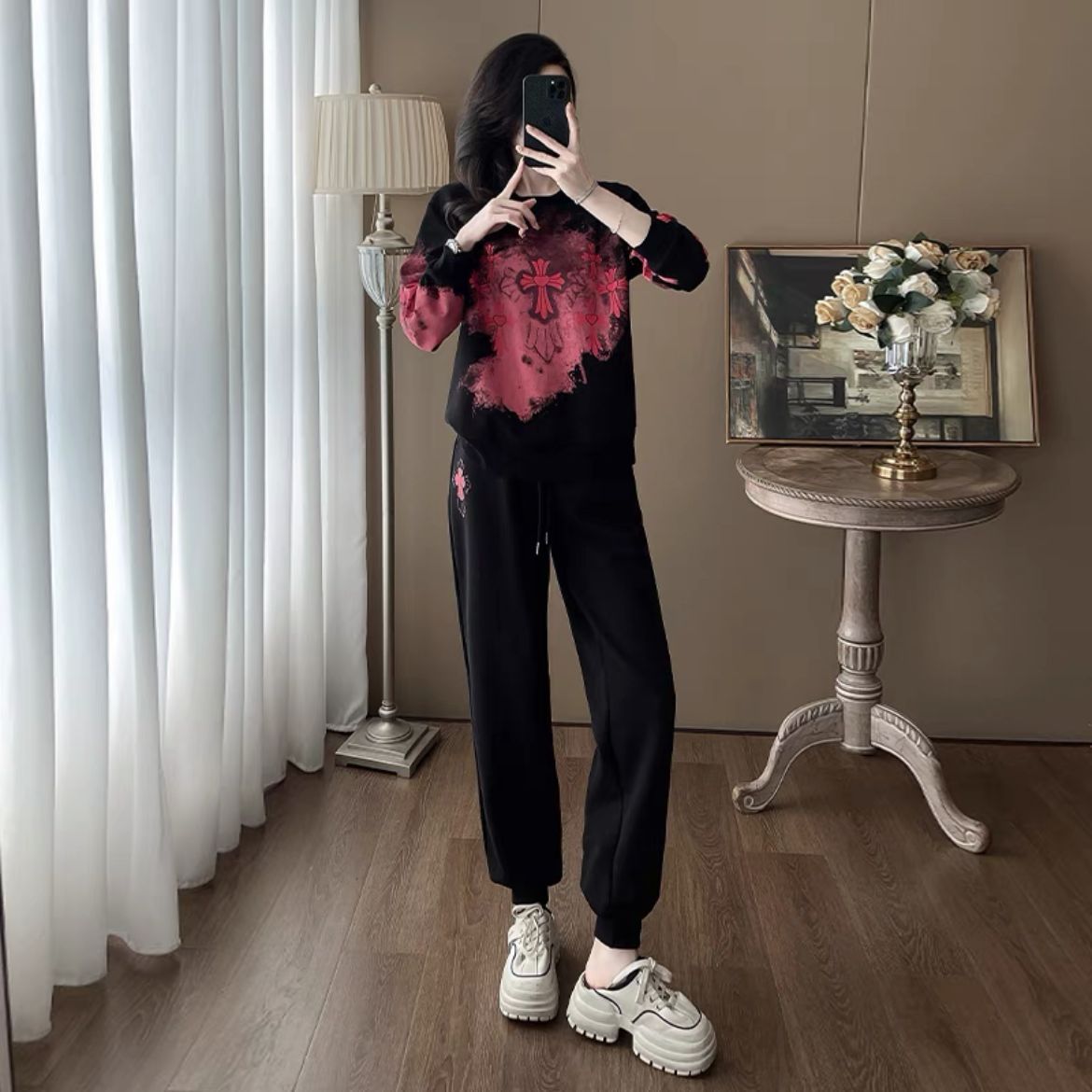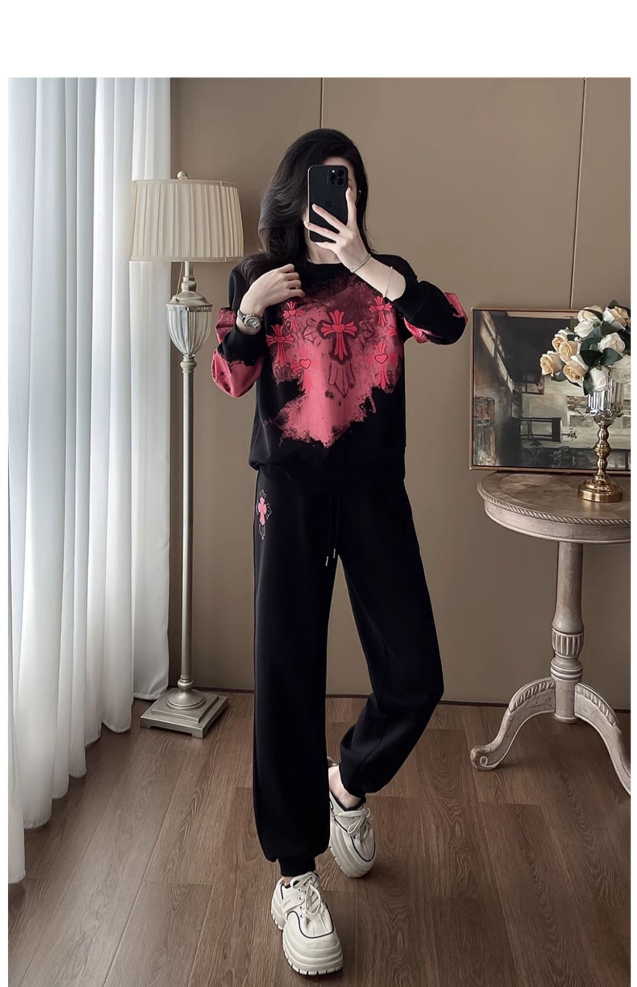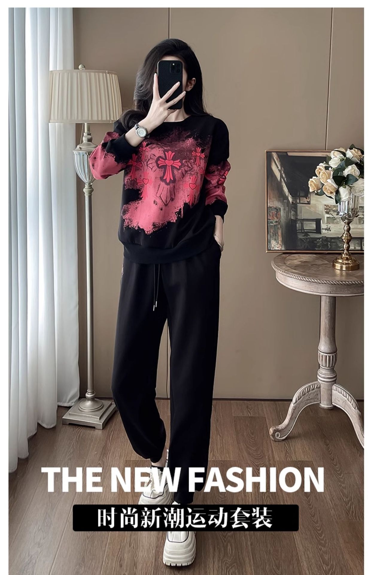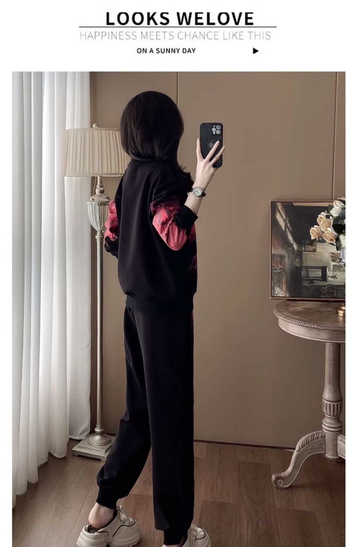 Bộ đồ thể thao hai mảnh dành cho nữ, thiết kế kiểu dáng năng động và thoải mái. Áo nỉ bên trong được làm ấm bằng lớp lót mềm mại, phù hợp cho thời tiết mát mẻ. Trên nền màu đen, điểm nhấn là các họa tiết in nổi bật, tạo nên vẻ trẻ trung và cá tính. Bạn có thể mặc nguyên bộ để đi chơi, tập luyện nhẹ nhàng hoặc phối cùng các trang phục khác. Chất vải co giãn nhẹ, mang lại cảm giác dễ chịu cho mọi hoạt động hằng ngày. | Tên sản phẩm: Đồ Bộ Nữ Cả Bộ 2 Món Họa Tiết Hoa Hàng Mùa Xuân Thu Đông - Thời Trang Nữ | Mã sản phẩm: B9880 - Giá: 1.250.000đ | Mã nhà sản xuất: AIANOR-G04Hình ảnh sản phẩm