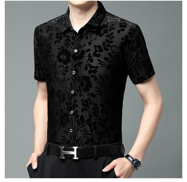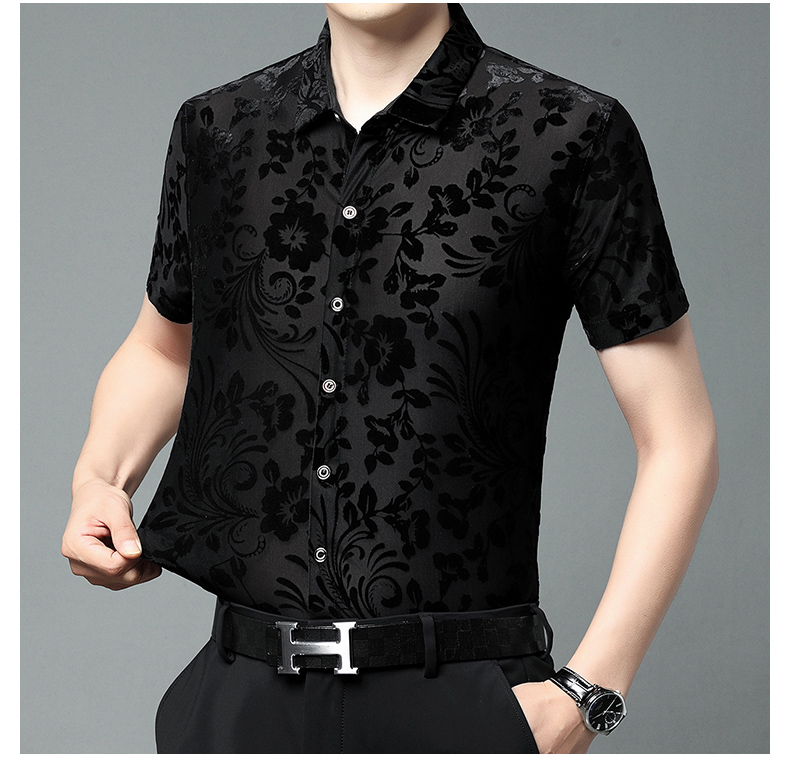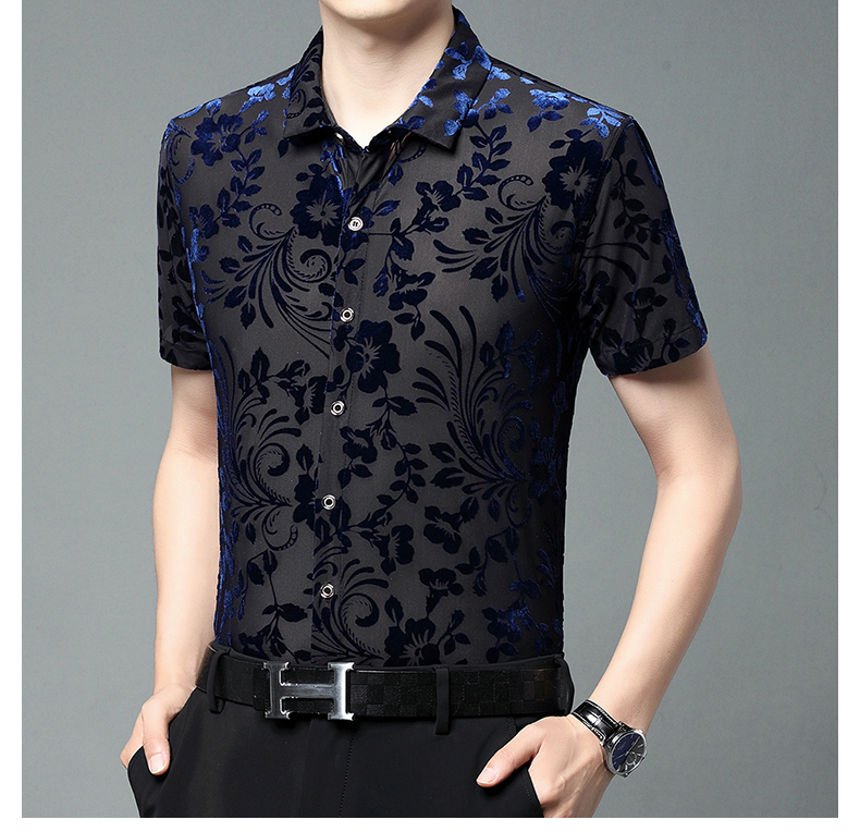 Áo sơ mi ngắn tay dành cho nam, có kiểu dáng lỗ trang trí tinh tế, phù hợp mặc trong mùa hè. Chất vải mỏng nhẹ, co giãn nhẹ và hơi trong suốt, tạo cảm giác thoải mái, mát mẻ. Hoa văn trên áo được dệt nổi mang phong cách cổ điển. Sản phẩm dễ dàng phối cùng quần tây hoặc quần jean, mặc đi làm hoặc dự tiệc đều phù hợp. Giặt nhẹ nhàng bằng tay để giữ form áo và độ bền đẹp. | Tên sản phẩm: Áo Sơ Mi Nam Ngắn Tay Họa Tiết Hoa Trong Suốt Hàng Mùa Hè Trung Niên - Thời Trang Nam | Mã sản phẩm: C0556 - Giá: 1.060.000đ | Mã nhà sản xuất: MERELA-G03Hình ảnh sản phẩm