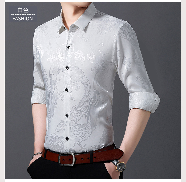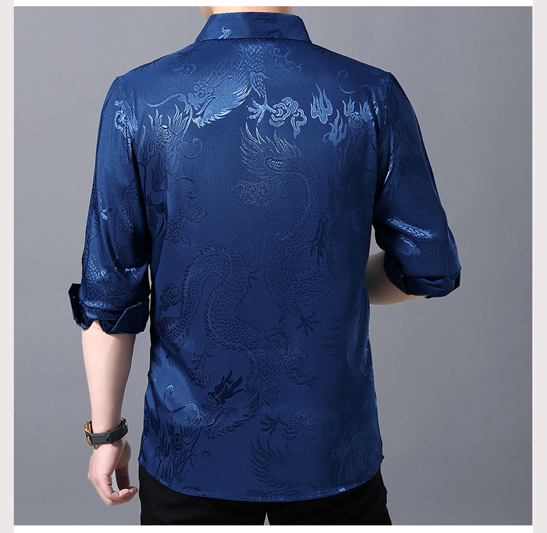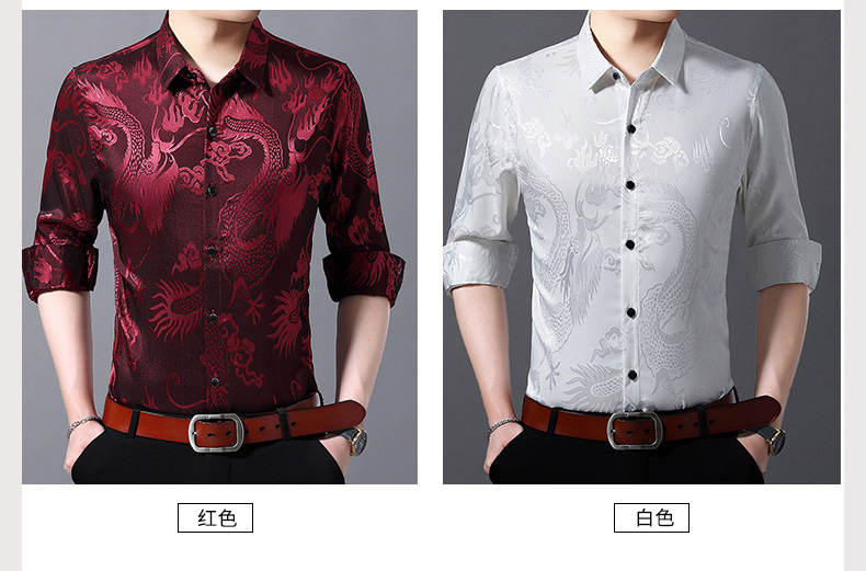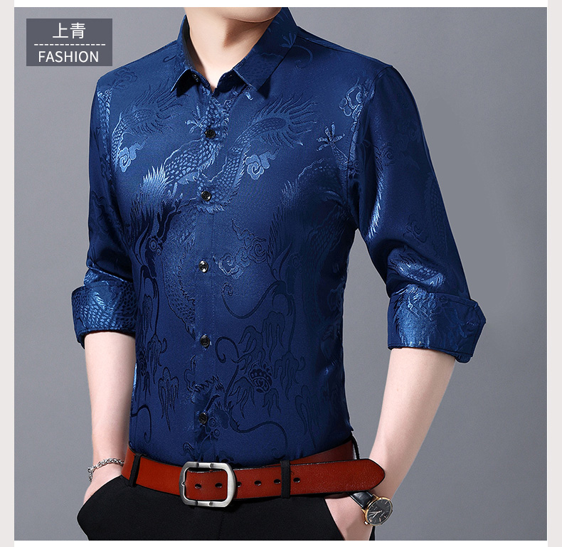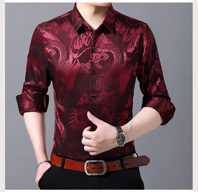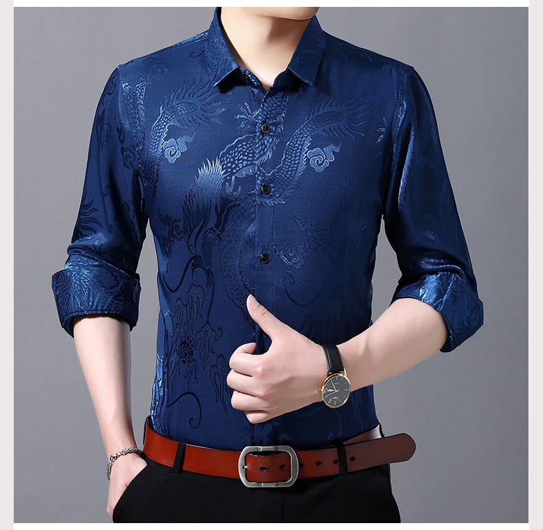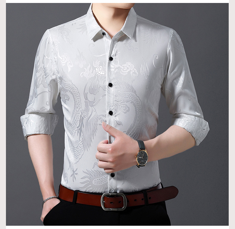 Áo sơ mi dài tay dành cho nam, có họa tiết hình rồng được dệt nổi độc đáo. Chất vải mỏng nhẹ, thoáng mát, rất phù hợp cho tiết trời xuân ấm áp. Kiểu dáng rộng rãi tạo cảm giác thoải mái, phóng khoáng khi mặc. Sản phẩm mang phong cách cổ điển, phù hợp cho các dịp sinh hoạt thường ngày. Có thể kết hợp cùng quần âu hoặc quần vải để tạo nên những phong cách khác nhau. | Tên sản phẩm: Áo Sơ Mi Nam Dài Tay Họa Tiết Hoa Hàng Mùa Xuân Thu Đông Trung Niên - Thời Trang Nam | Mã sản phẩm: C0563 - Giá: 770.000đ | Mã nhà sản xuất: MERELA-G02Hình ảnh sản phẩm