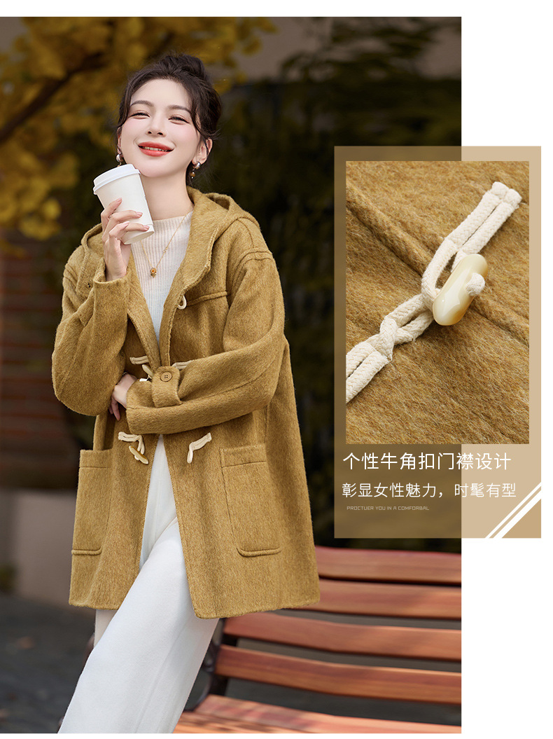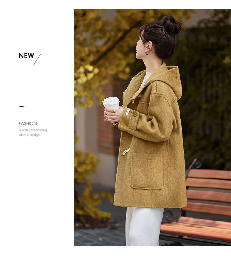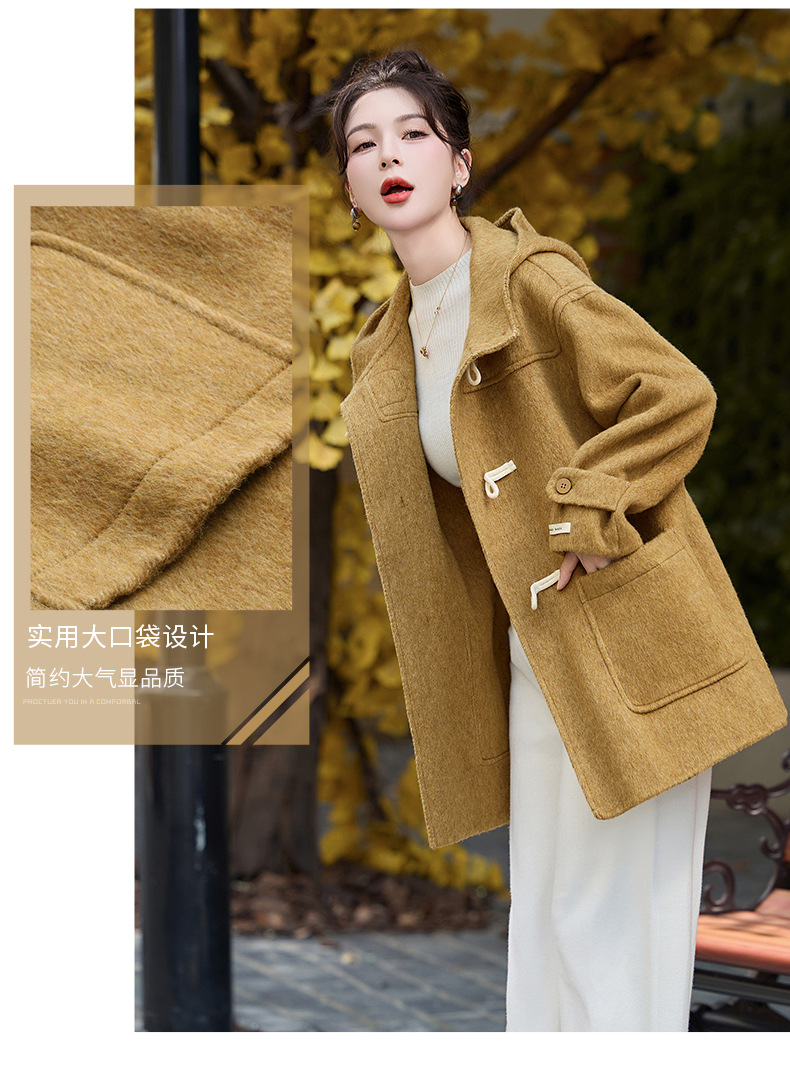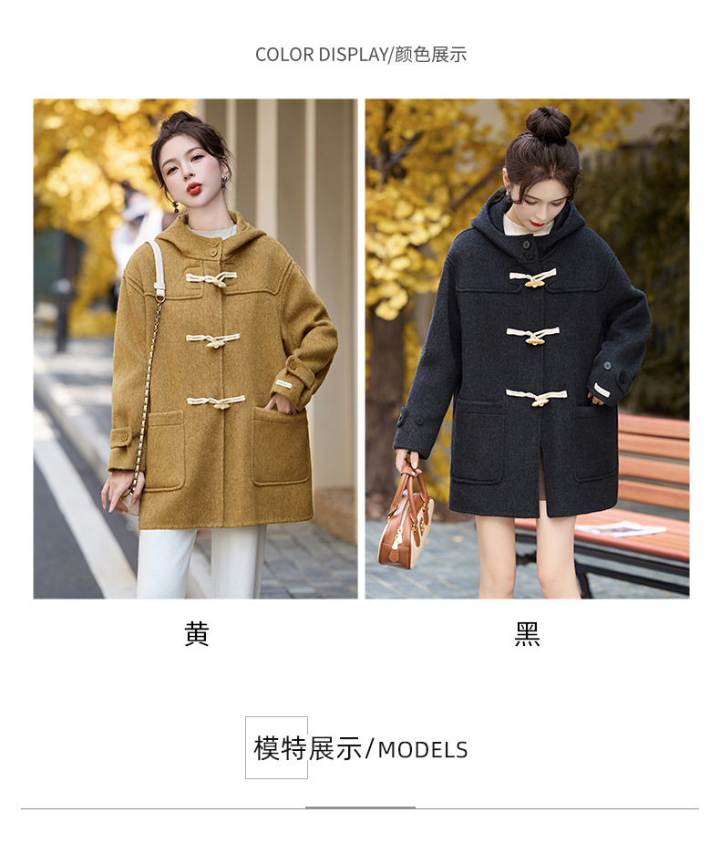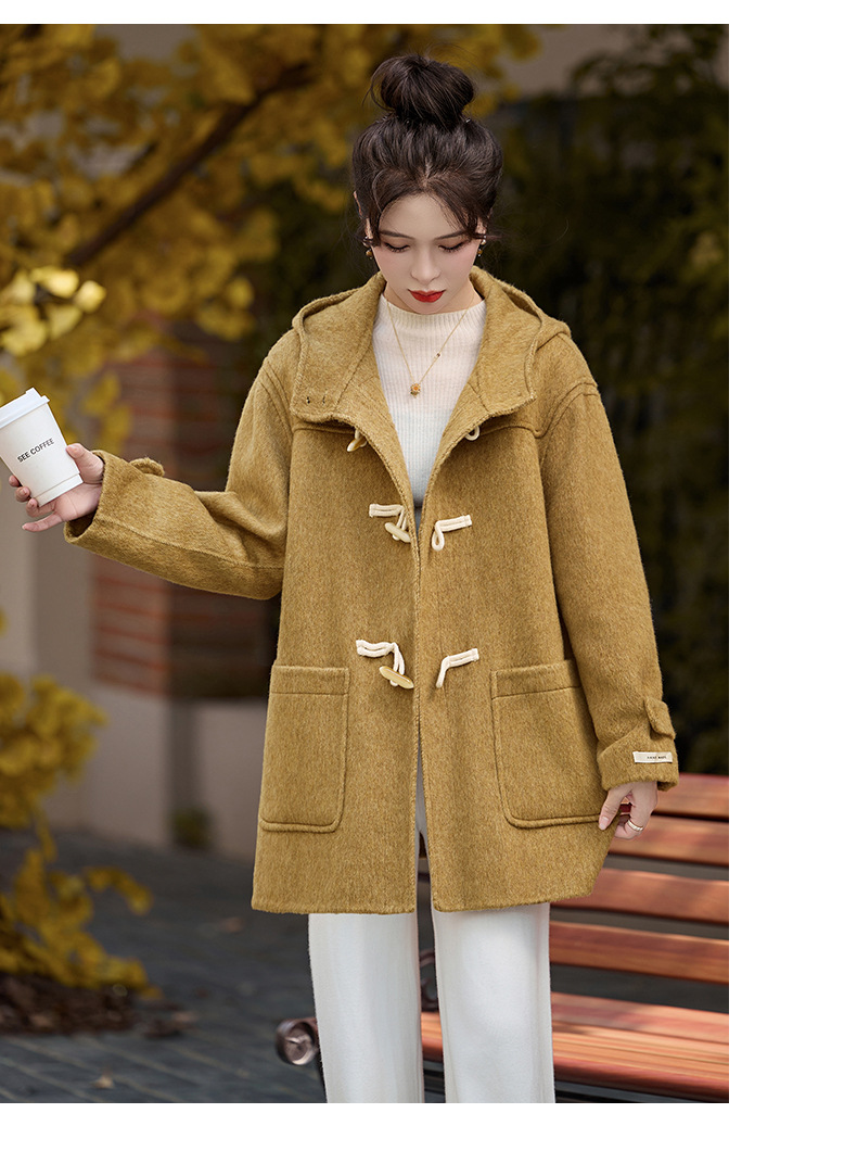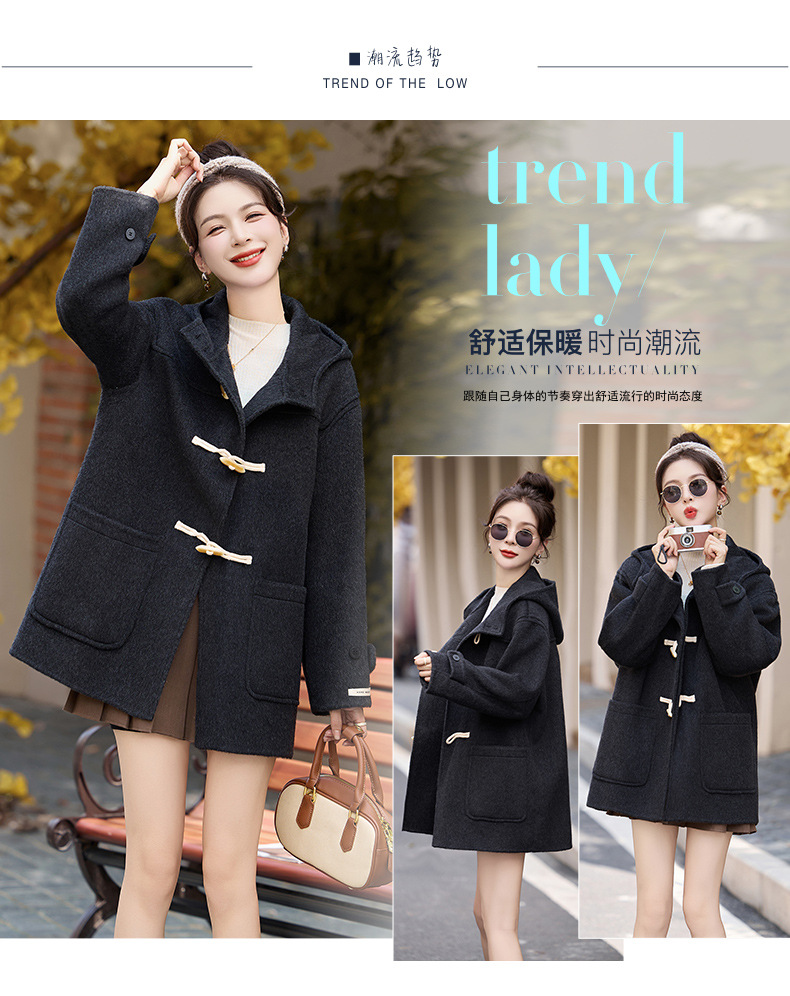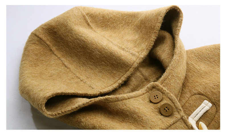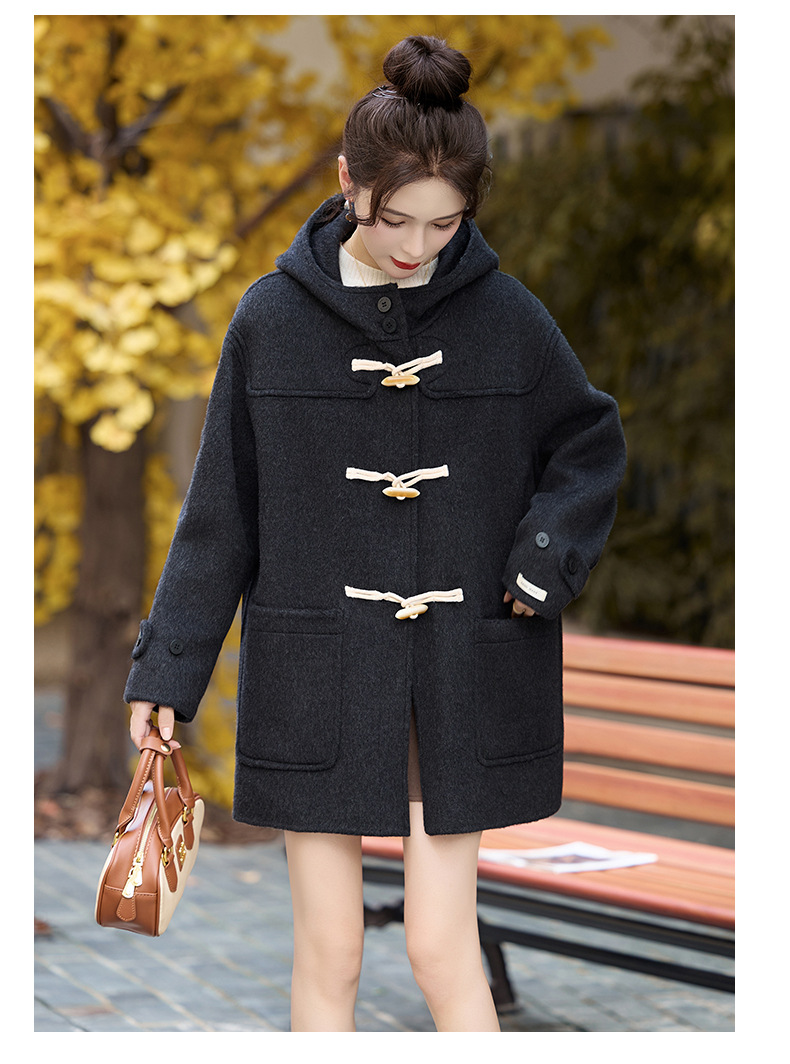 Áo khoác nữ dáng dài, có mũ trùm và khuy cài dạng sừng bò tiện lợi. Chất liệu hai mặt đều làm từ len ấm áp, giữ nhiệt tốt, phù hợp cho thời tiết se lạnh. Thiết kế kết hợp nét trẻ trung với phong cách cổ điển, dễ dàng phối cùng nhiều loại trang phục. Có thể mặc trực tiếp hoặc khoác ngoài để giữ ấm, dây mũ và khóa cài có thể điều chỉnh linh hoạt theo ý thích. | Tên sản phẩm: Áo Khoác Nữ Mũ Liền Hàng Mùa Xuân Thu Đông - Thời Trang Nữ | Mã sản phẩm: C0694 - Giá: 2.900.000đ | Mã nhà sản xuất: HADG-G06Hình ảnh sản phẩm
